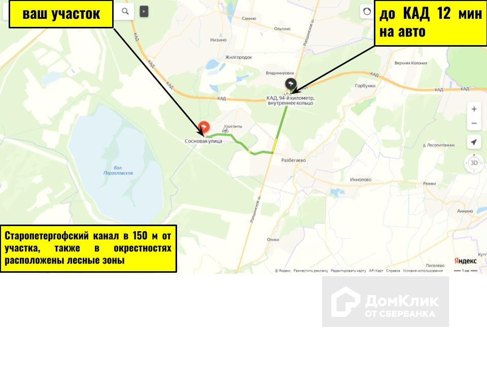 Обратите внимание на транспортную доступность, участок неподалеку от Ропшинского шоссе, до КАДа доедете за 12 минут на авто. Место очень перспективное, через пару лет цена будет намного выше.