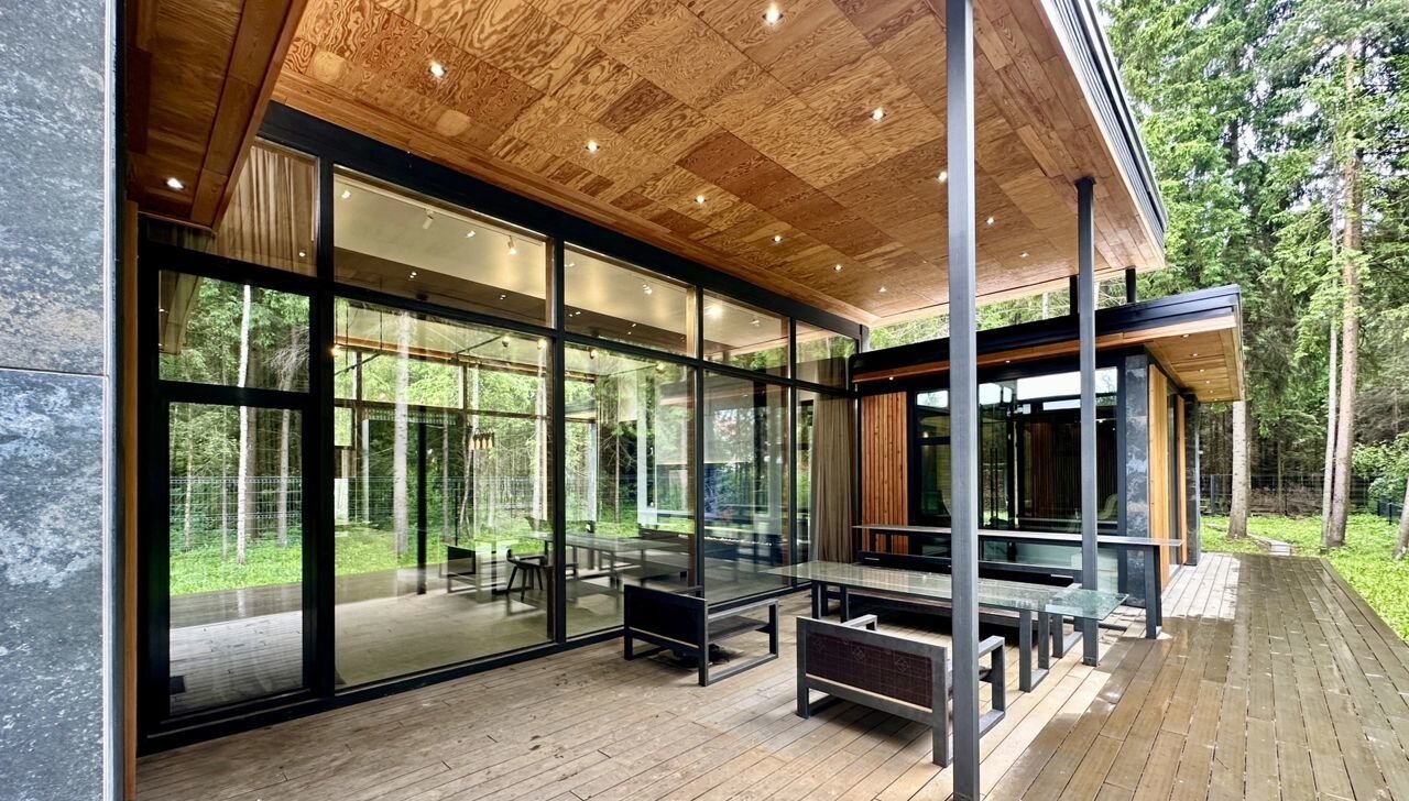 Представленный дом построен в современном стиле с плоской кровлей, одноэтажный, с огромными панорамными окнами от пола до потолка и шириной во всю стену - а из окон открывается неповторимый (точнее даже нереальный) вид на лес.