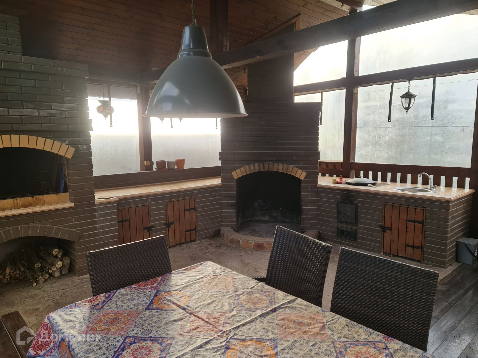 Обустроена зона барбекю на участке, просторная беседка с камином, мангалом, казаном и столом на 8 человек. Беседка закрывается от дождя, снега и ветра прозрачными рол-шторами.