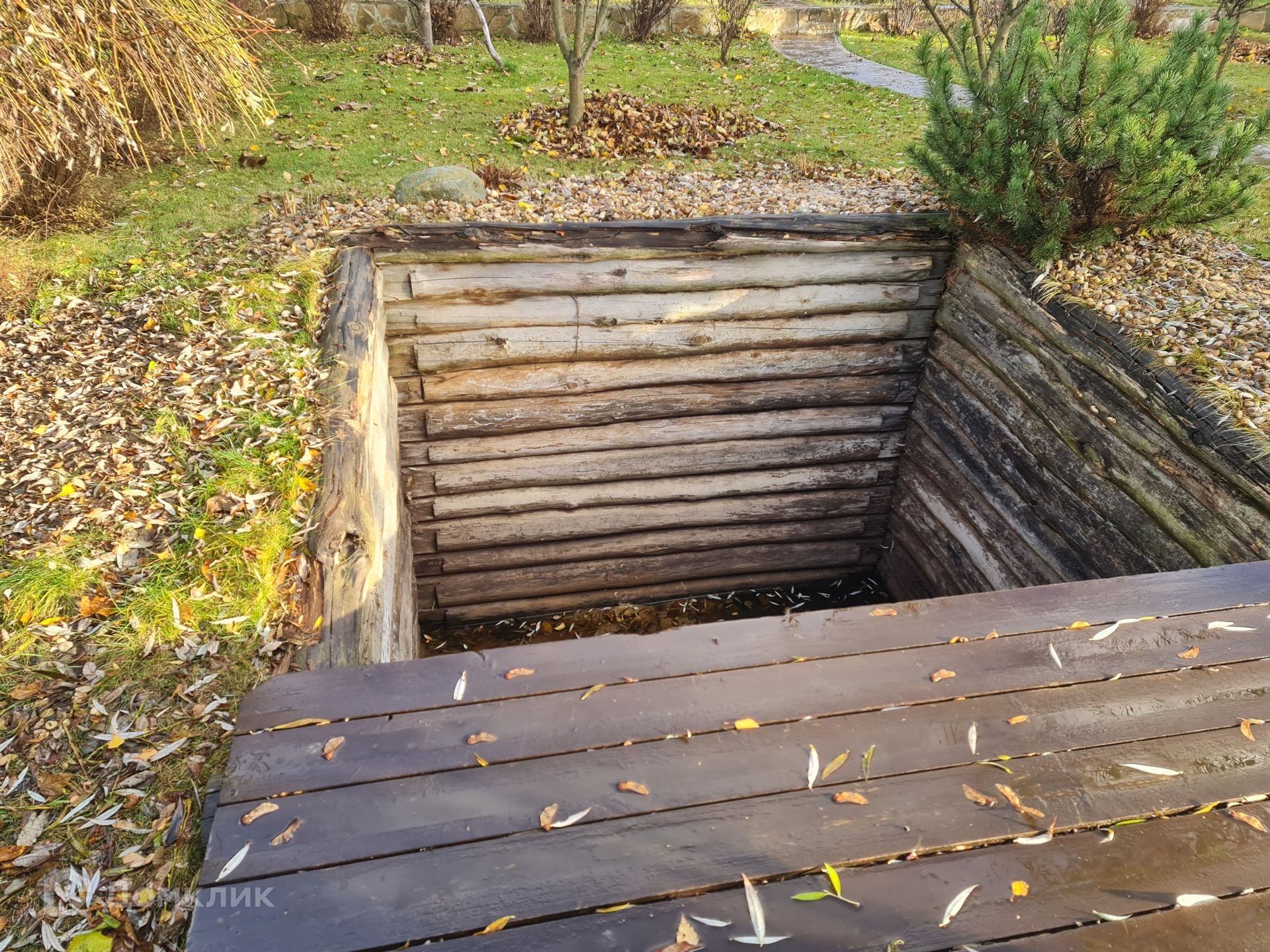 На участке расположена баня с глубокой купелью из цилиндрического сруба. Баня в два этажа, на 1-м парная и место для чаепития, на 2-м зона отдыха.