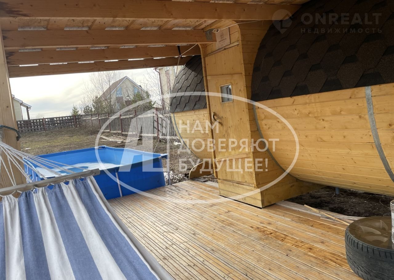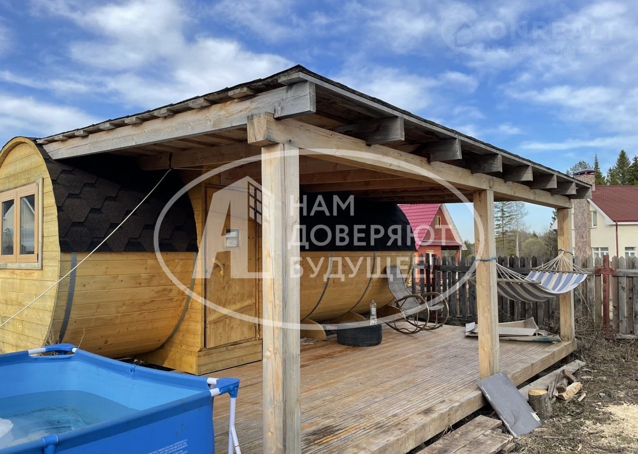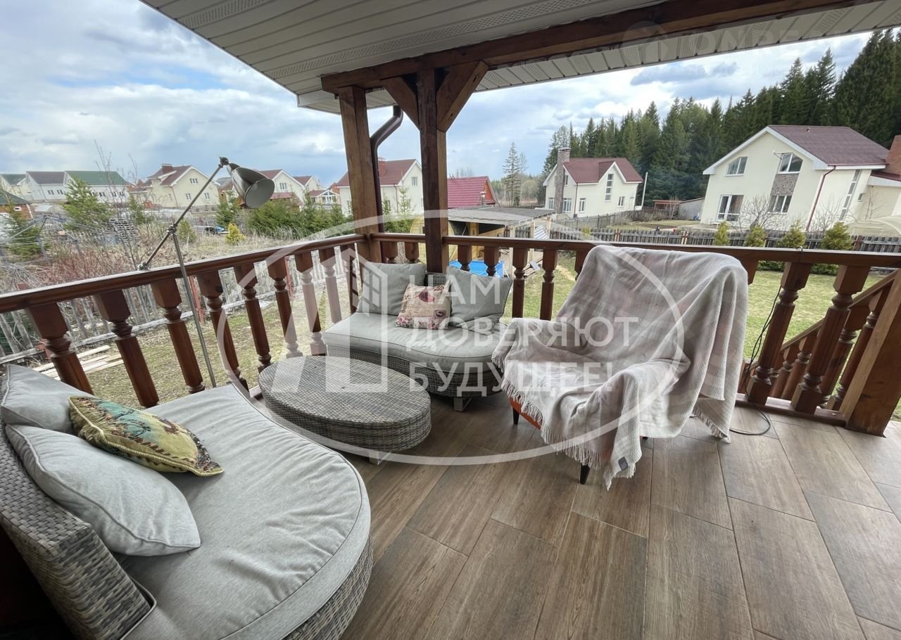 На территории просторная терраса с видом на лес, гараж, баня, ровная зеленая площадка - газон.