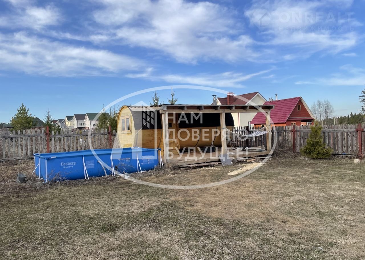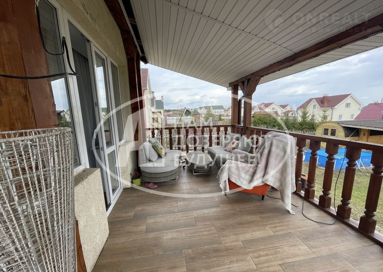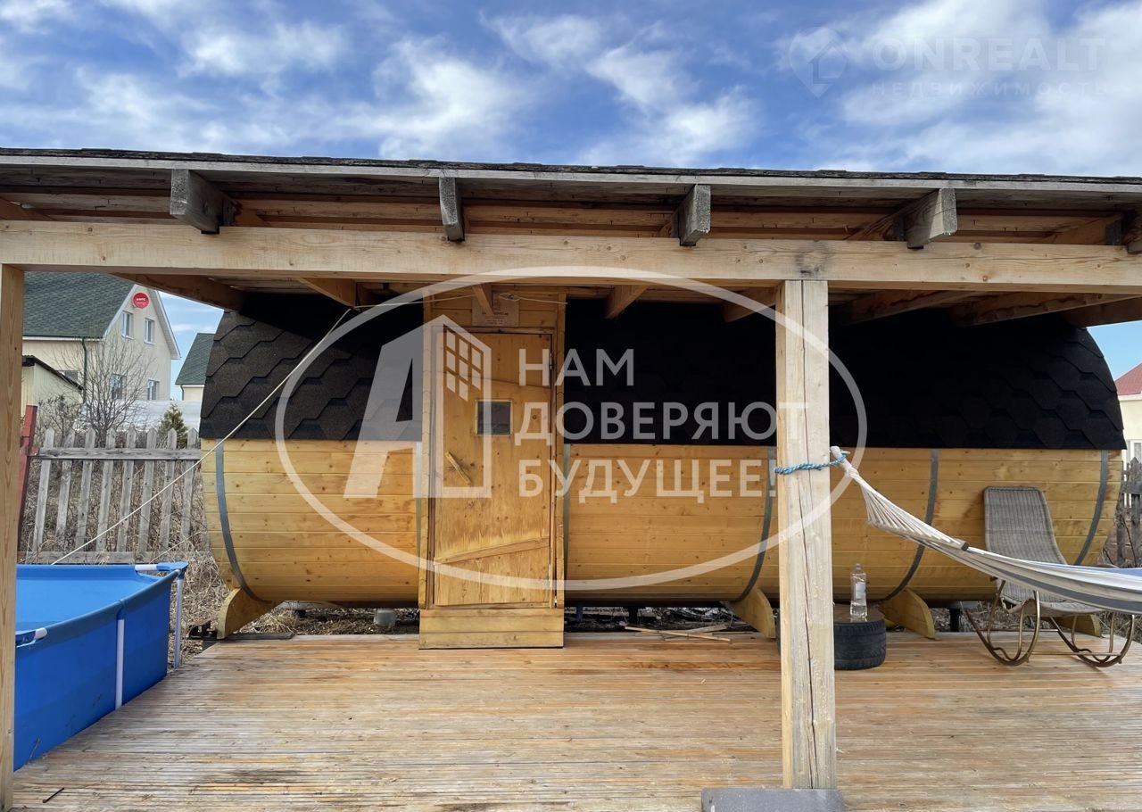 На территории просторная терраса с видом на лес, гараж, баня, ровная зеленая площадка - газон.