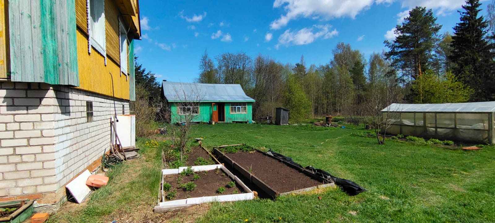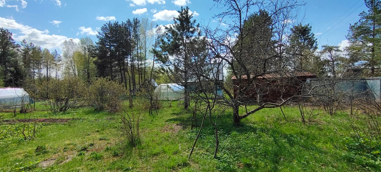 На участке 2 теплицы из поликарбоната и 2 парника. Большой сарай для разного хлама.