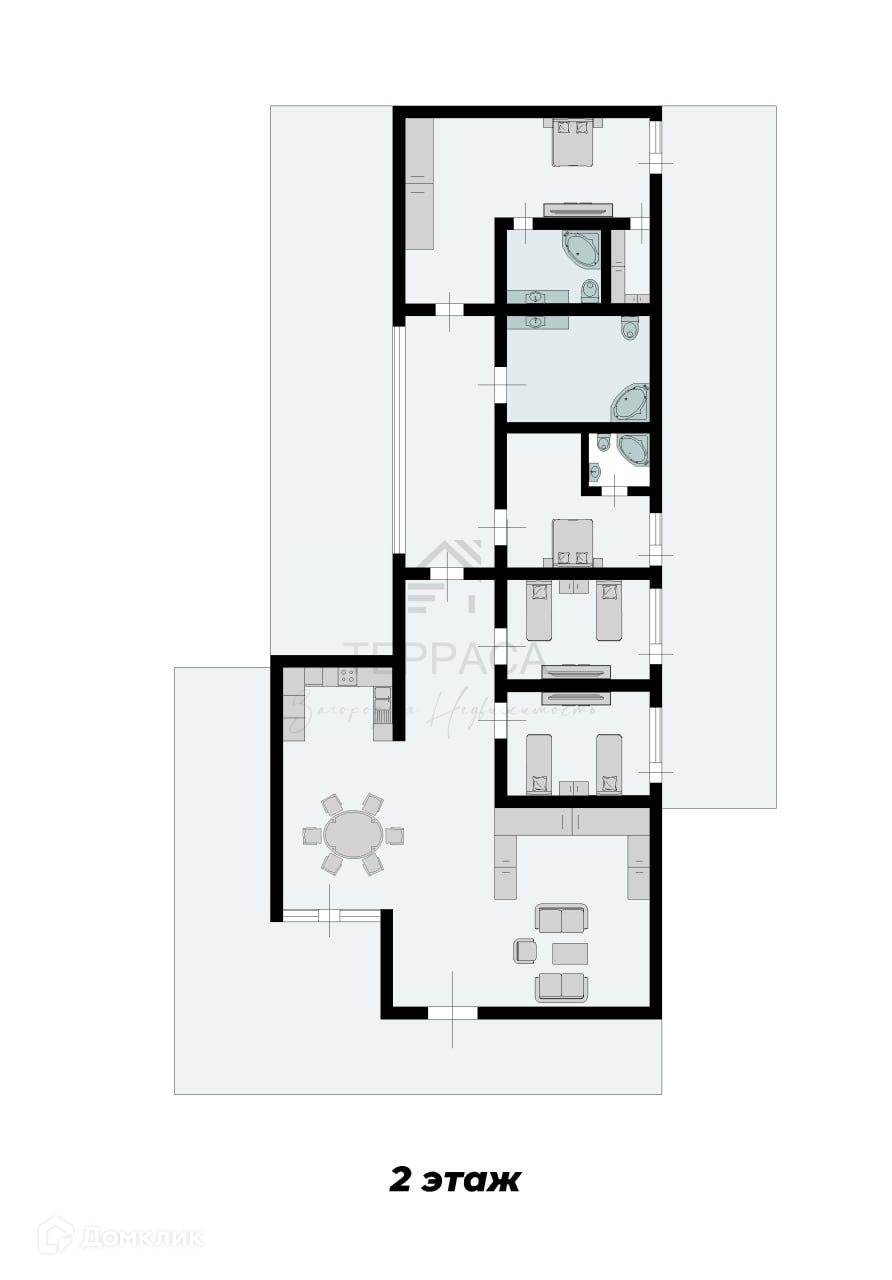 2 этаж – терраса, холл, кухня-гостиная, 2 мастер спальни с с/у, 2 изолированные комнаты, с/у.