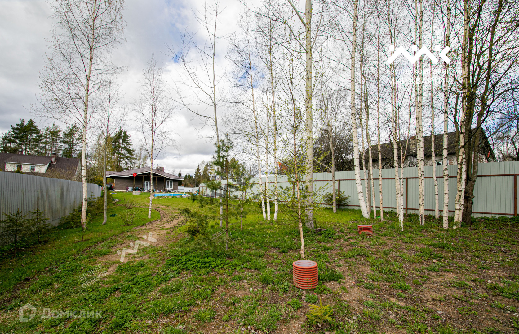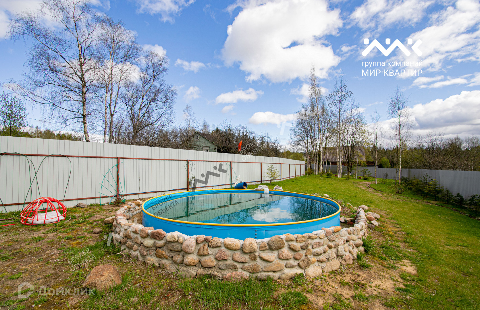 Участок ровный и сухой, посажен газон, высажены многолетние декоративные и плодовые растения. Располагается бассейн 1,5 метра глубины.