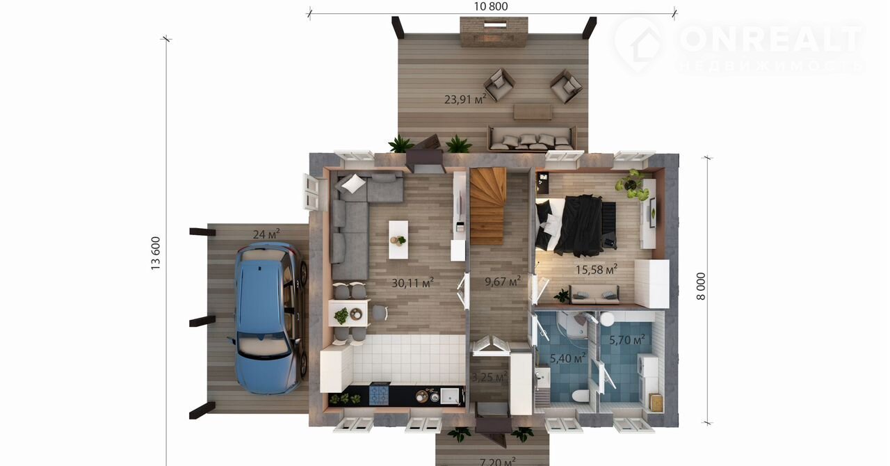 Paзмeр дoмa -  10,8*8 м., и гapaж 24 м², и терраca 48 м².