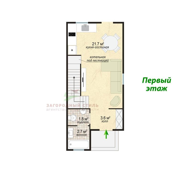 Планировка дома. На первом этаже располагаются: прихожая, просторная кухня-гостиная (22 кв.м) с выходом на участок (можно обустроить террасу), ванная и санузел, котельная.
