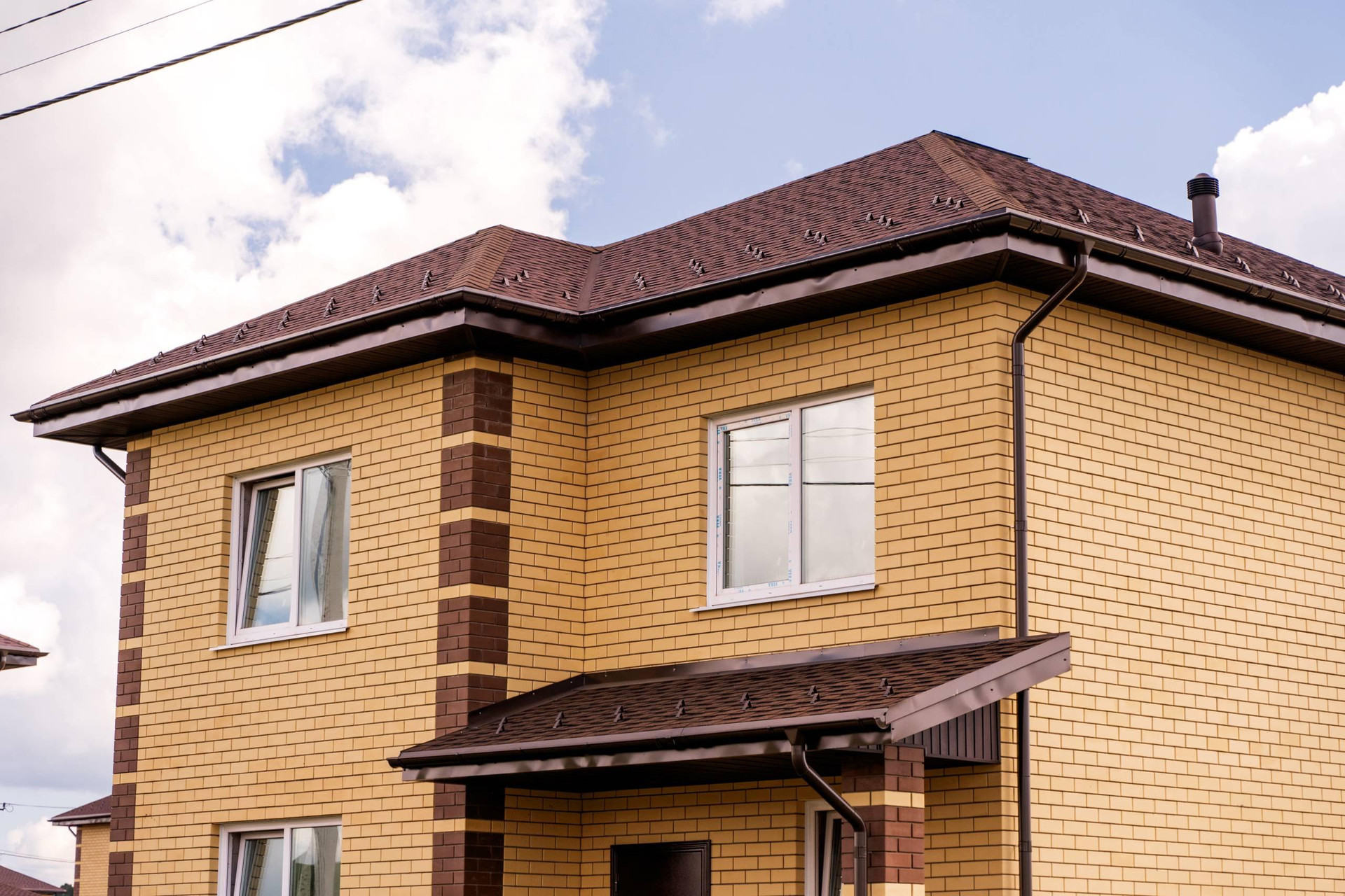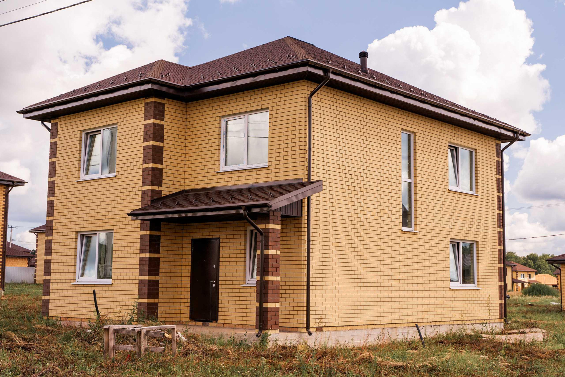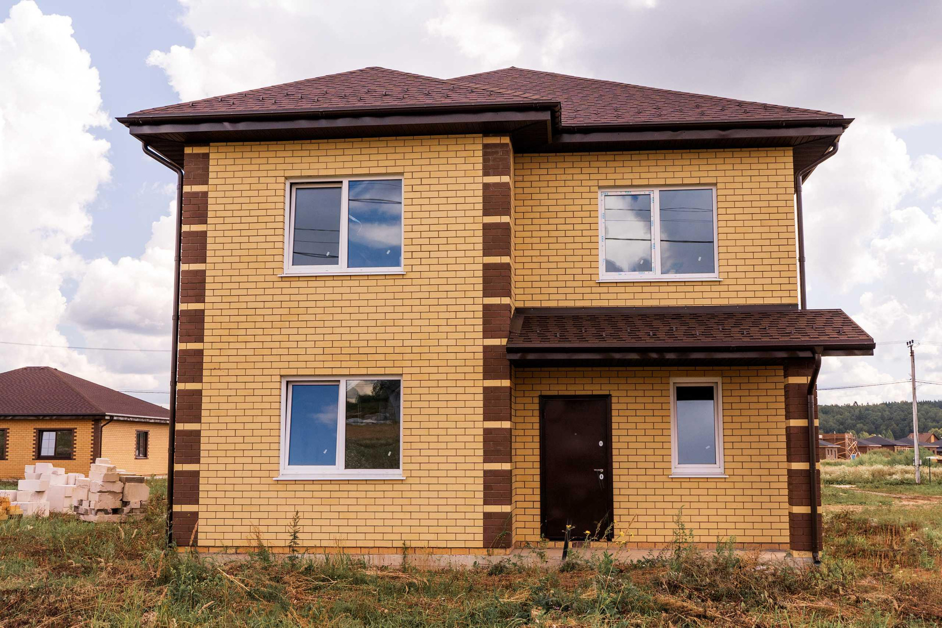 Дом расположен на участке 9.6 соток. Назначение земель - ИЖС. Площадь помещений дома - 133,4 кв.м . Дом выполнен из газобетона толщиной 375 мм. с облицовкой фасада кирпичом, на фундаменте - монолитная плита с ребрами жесткости. Кровля - гибкая черепица, утепление 200 мм. Установлена металлическая водосточная система.