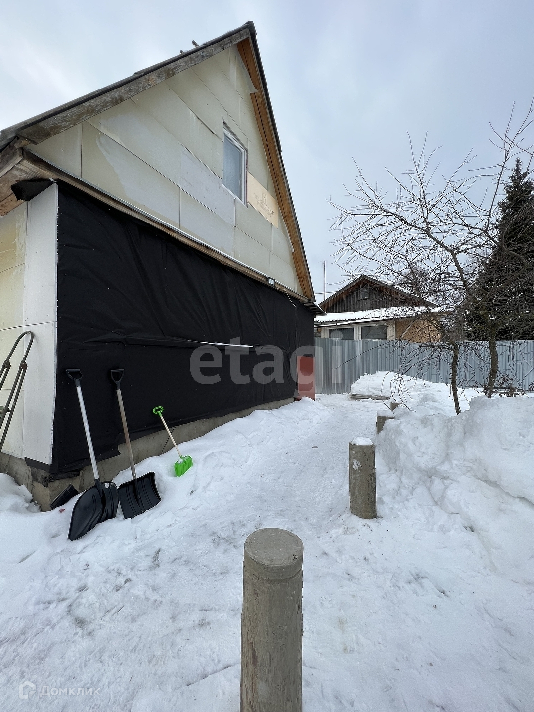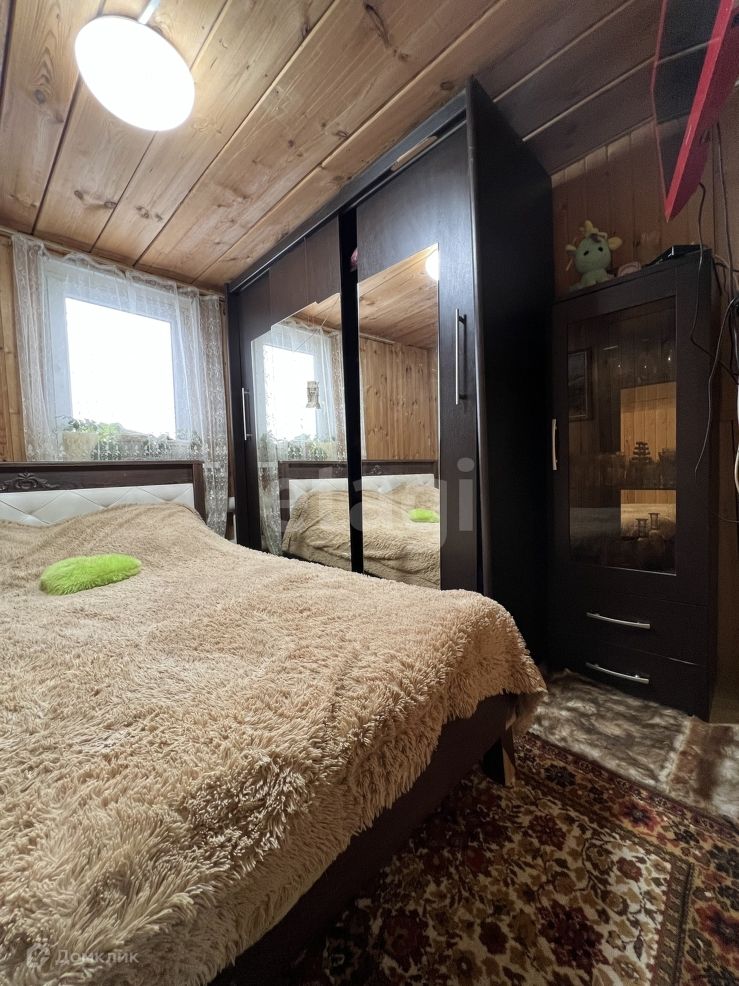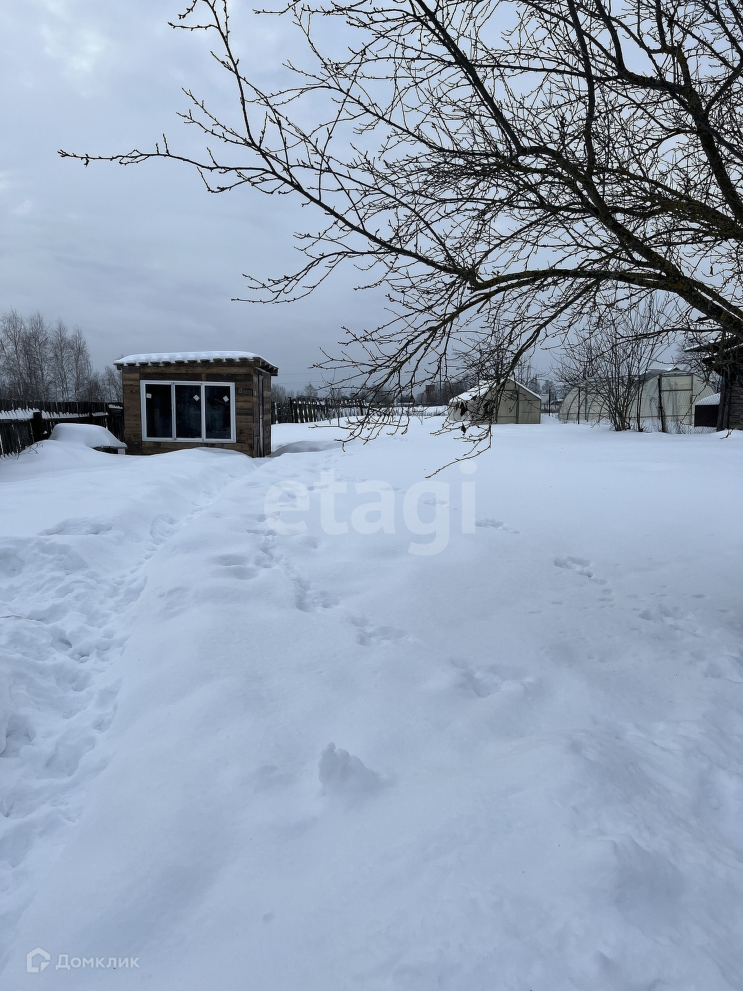 Участок ровный, 20 соток, есть сарай, парник и вольер для собаки. Перед домом парковочное место, впереди ограждение профнастил с воротами, по периметру - сетка-рабица.