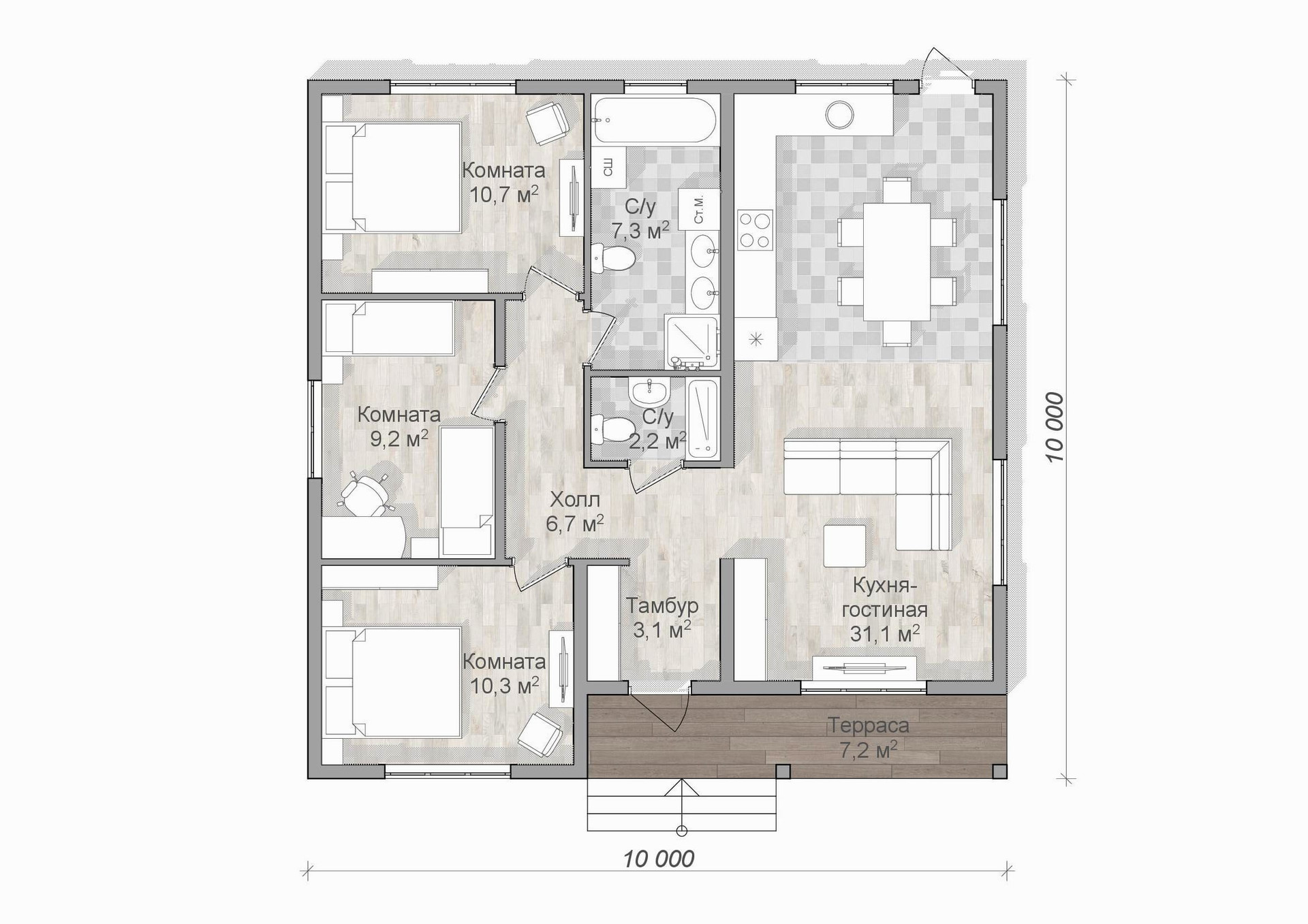 Планировка: 3 спальни, 2 санузла, большая кухня-гостиная, терраса, техническое помещение, прихожая