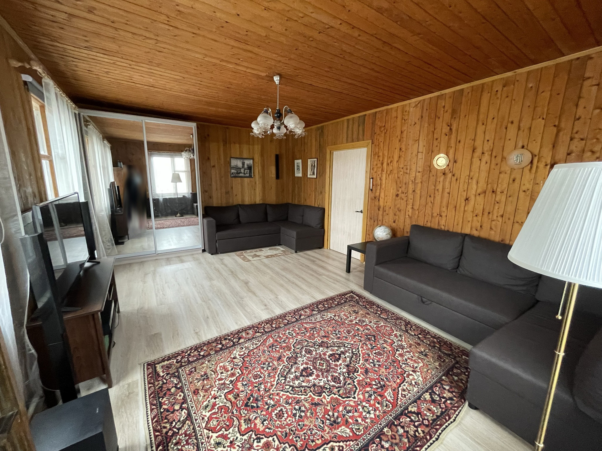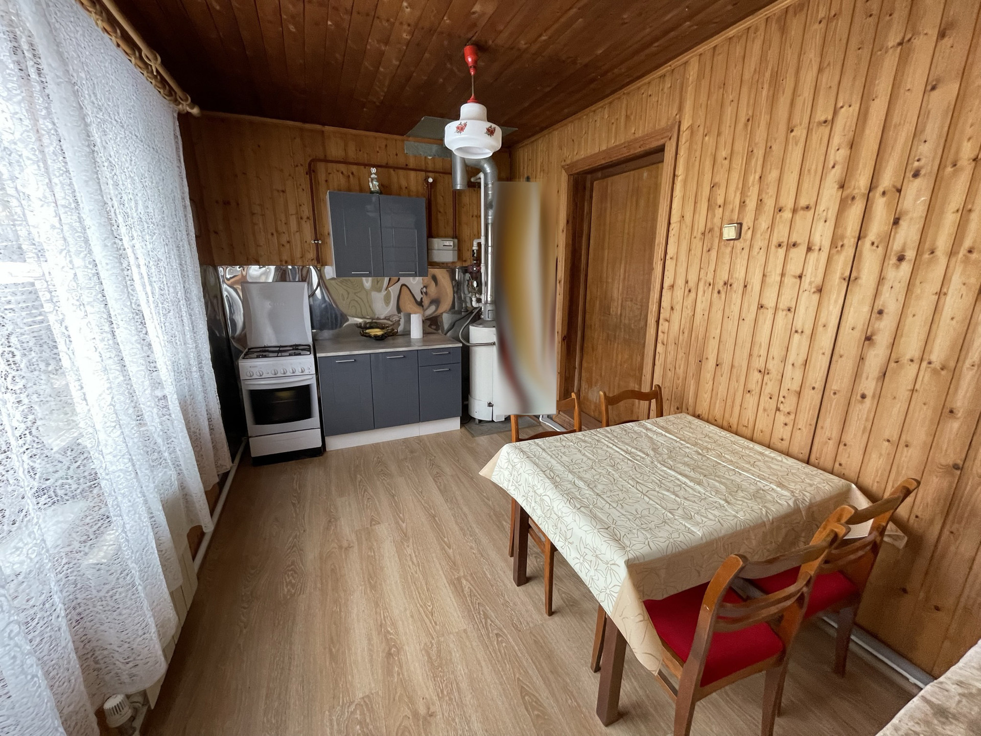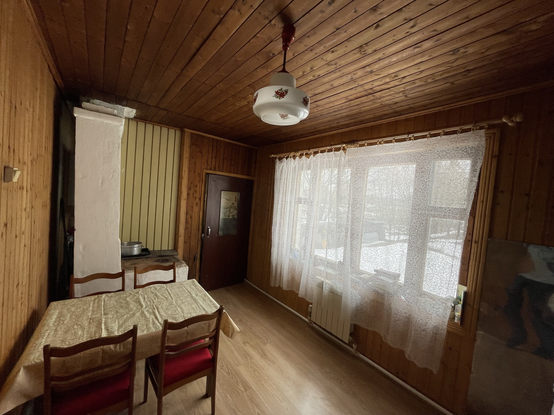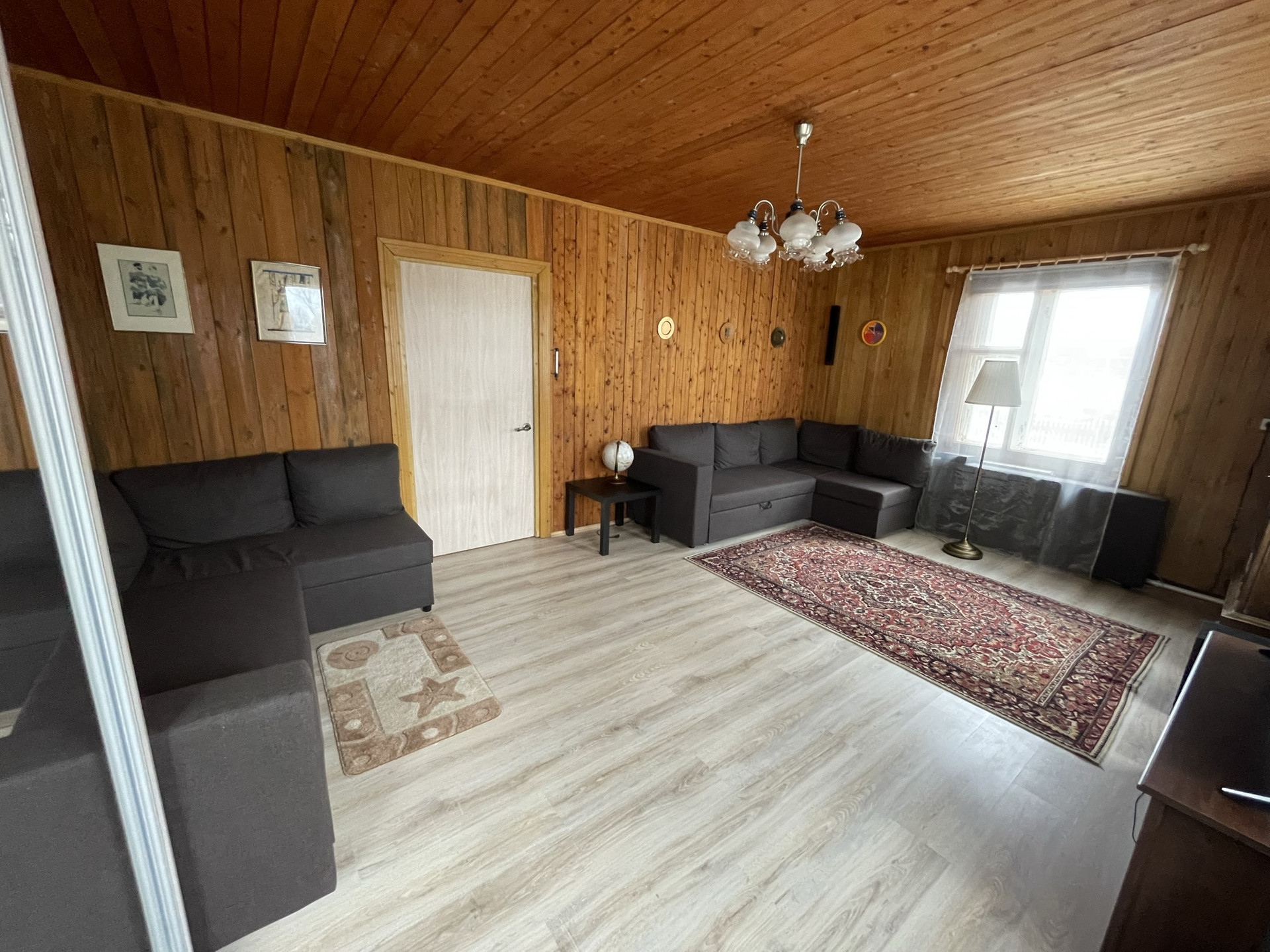 Внутри: полы деревянные, покрытые ламинатом на 1 этаже, окна деревянные, двери- деревянные, стены вагонка, потолок- деревянный.