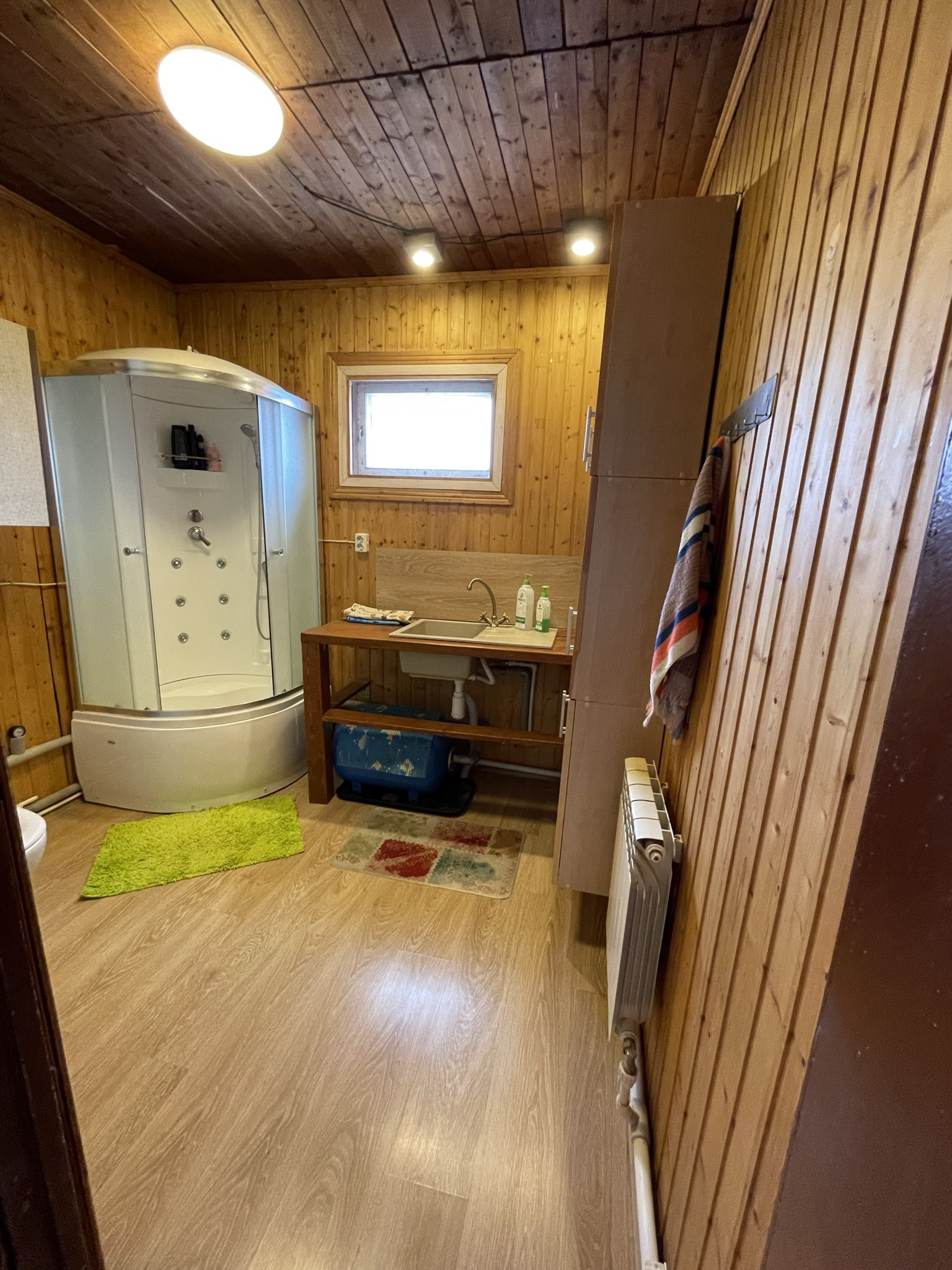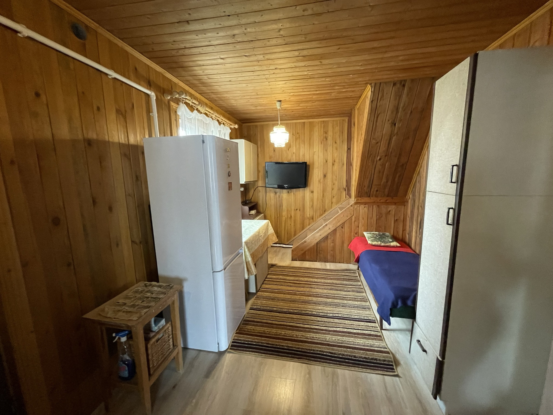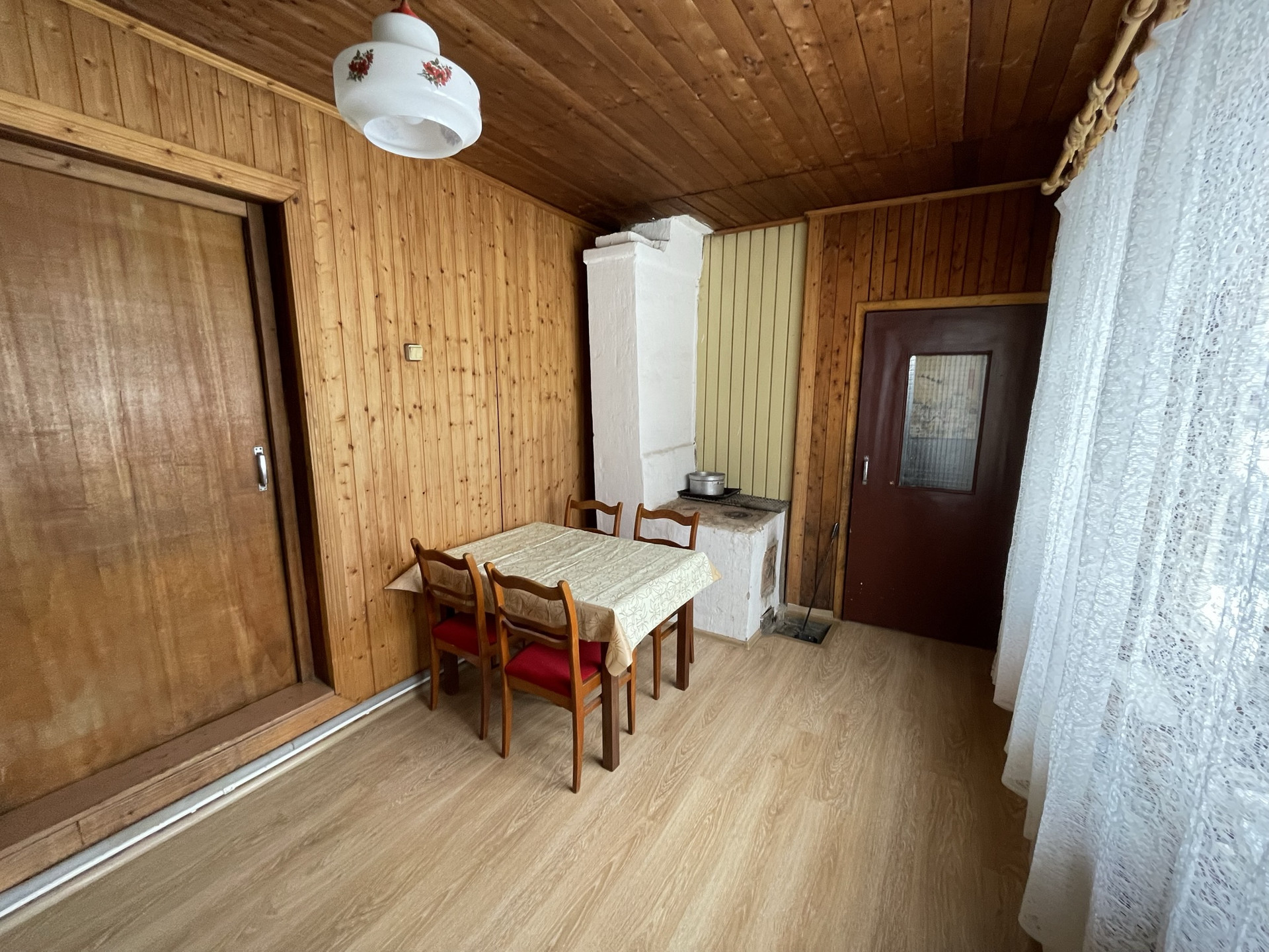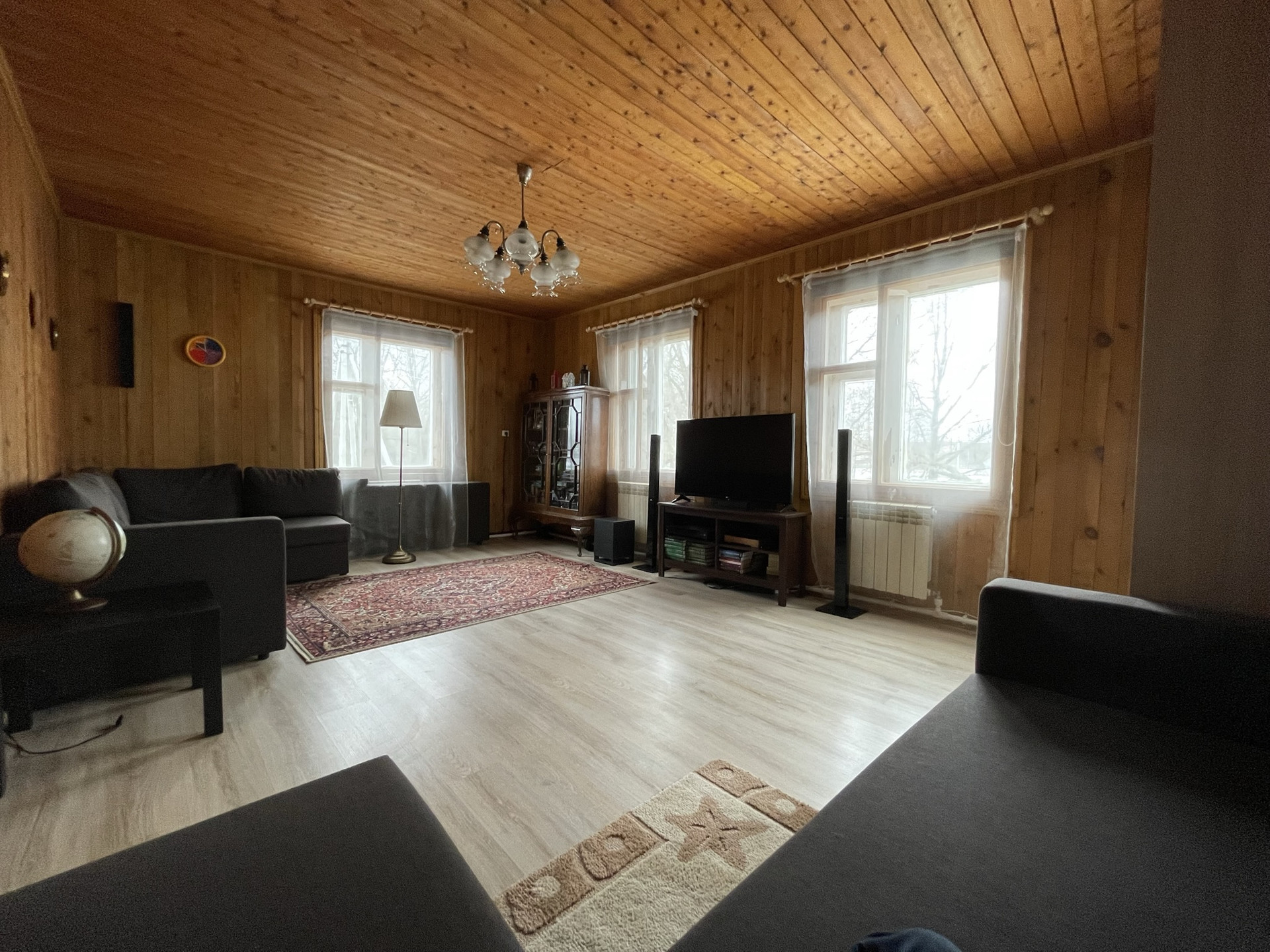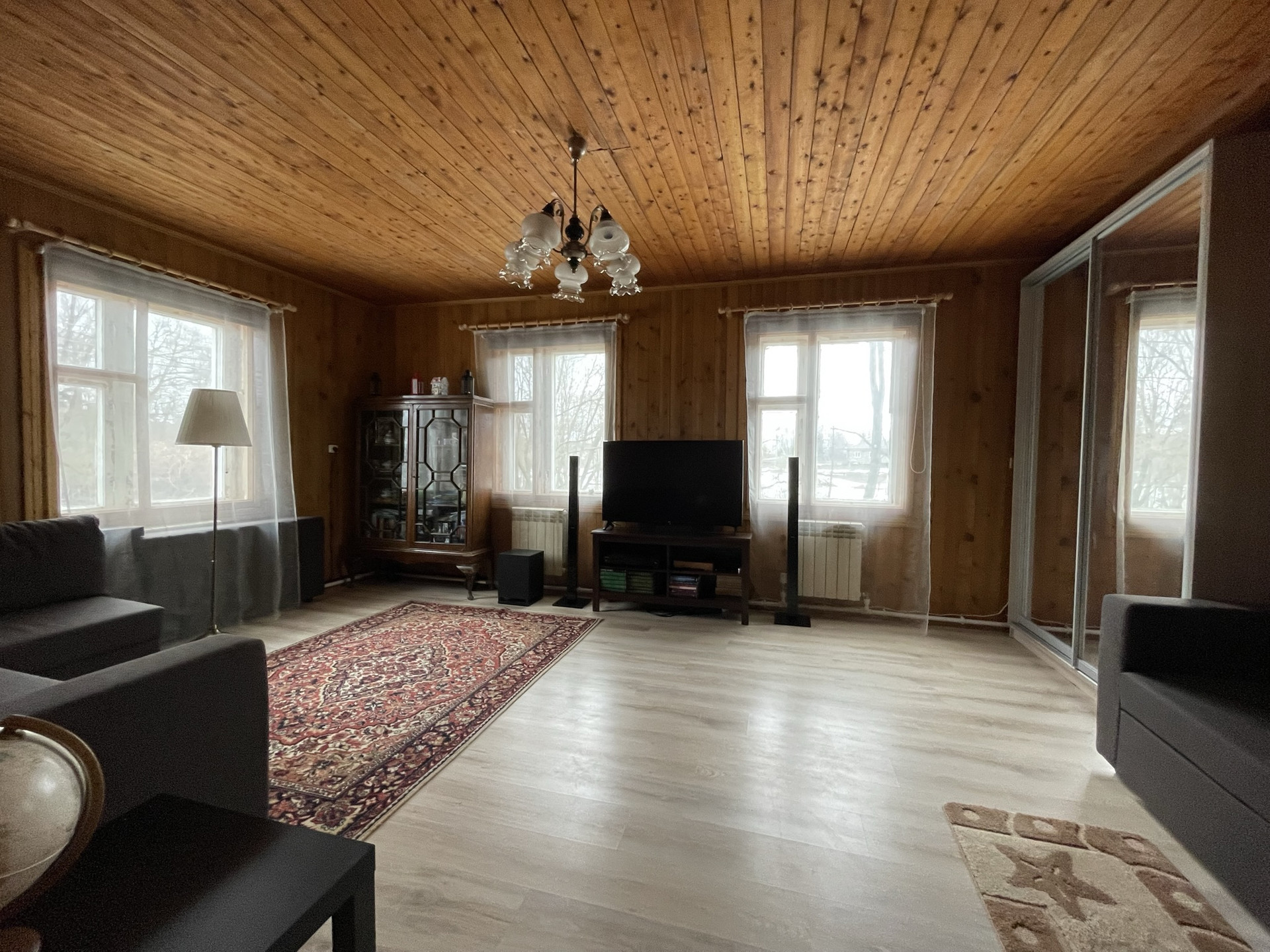 Внутри: полы деревянные, покрытые ламинатом на 1 этаже, окна деревянные, двери- деревянные, стены вагонка, потолок- деревянный.