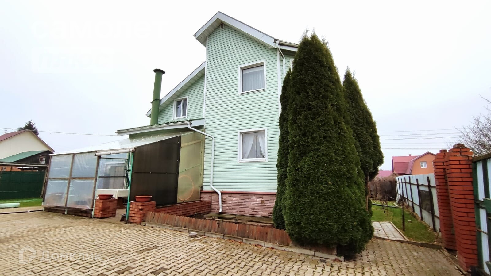На участке, кроме дома, кирпичный гараж, двухэтажная бревенчатая баня, сад, огород, красивый цветник. Все постройки зарегистрированы официально. Вдоль замощенных дорожек растут туи. В самой дальней части участка полноценный курятник.