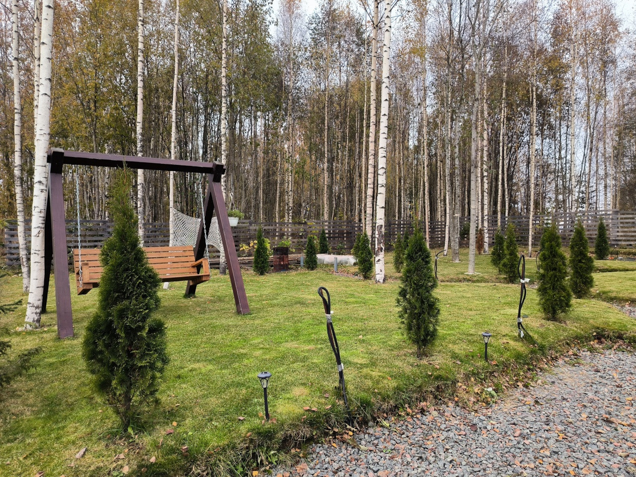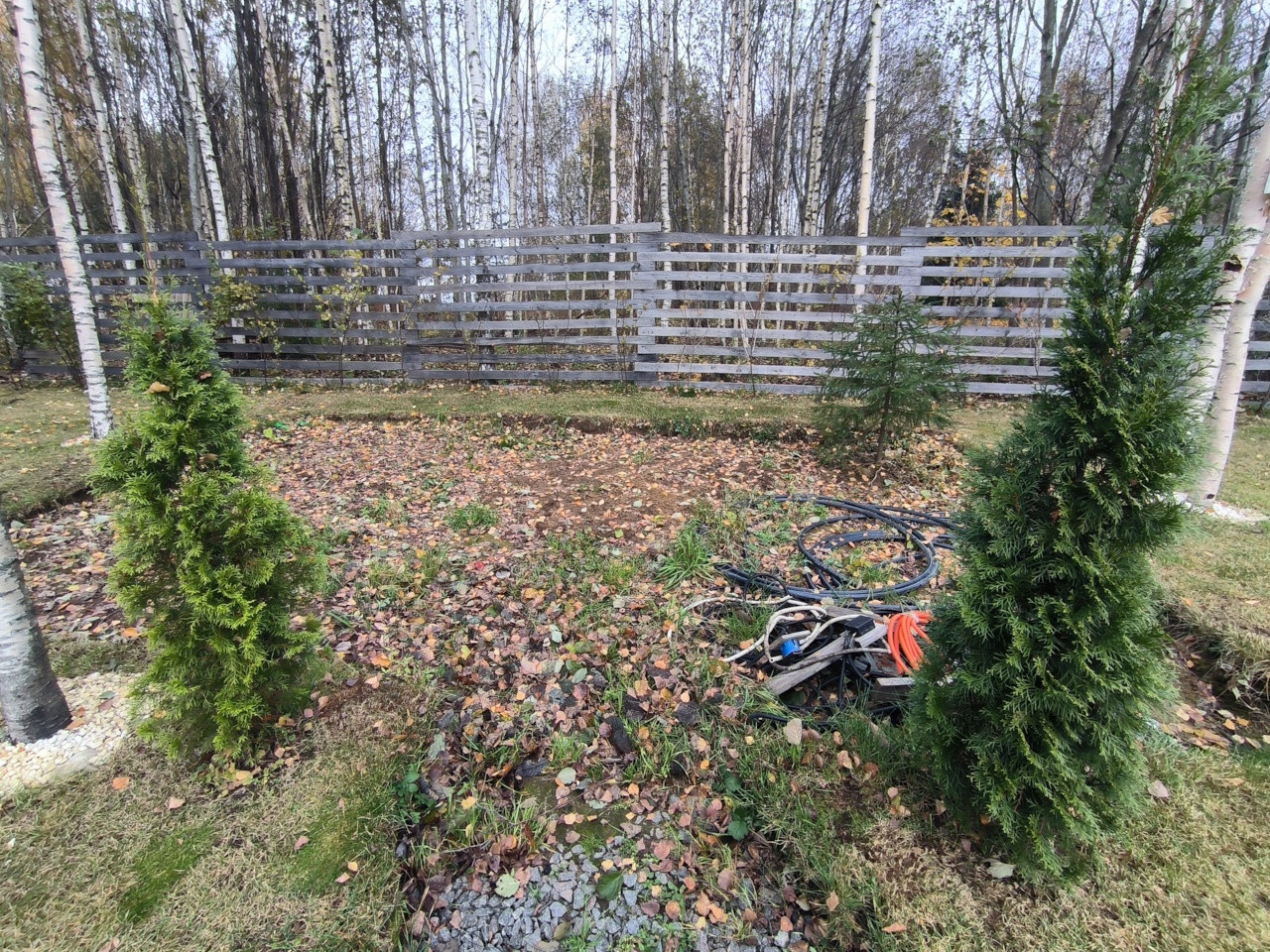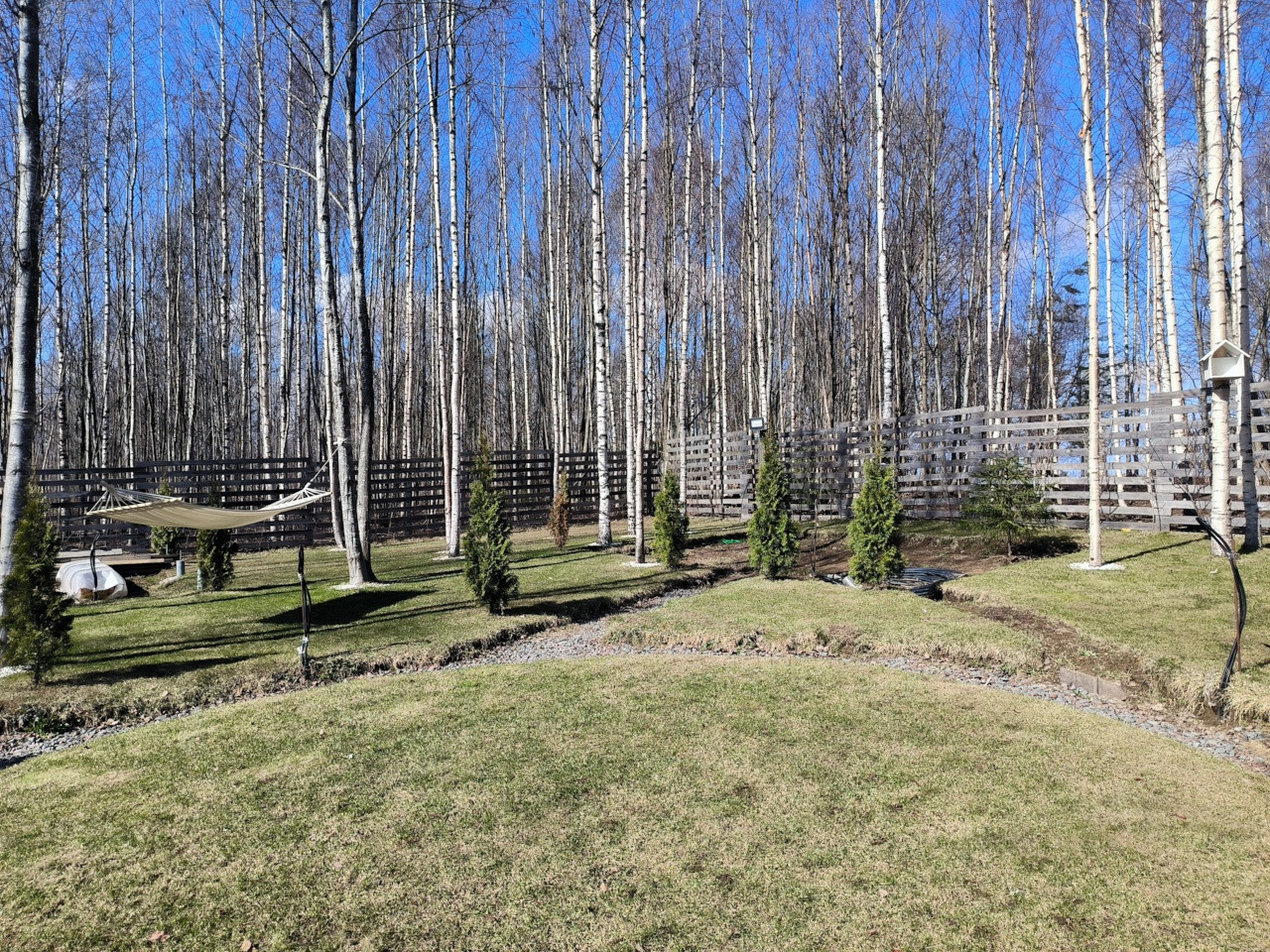 На участке подготовлено место под небольшую баню (вода, электричество, забиты сваи), так же подготовлено все для установки уличного электрического освещения)