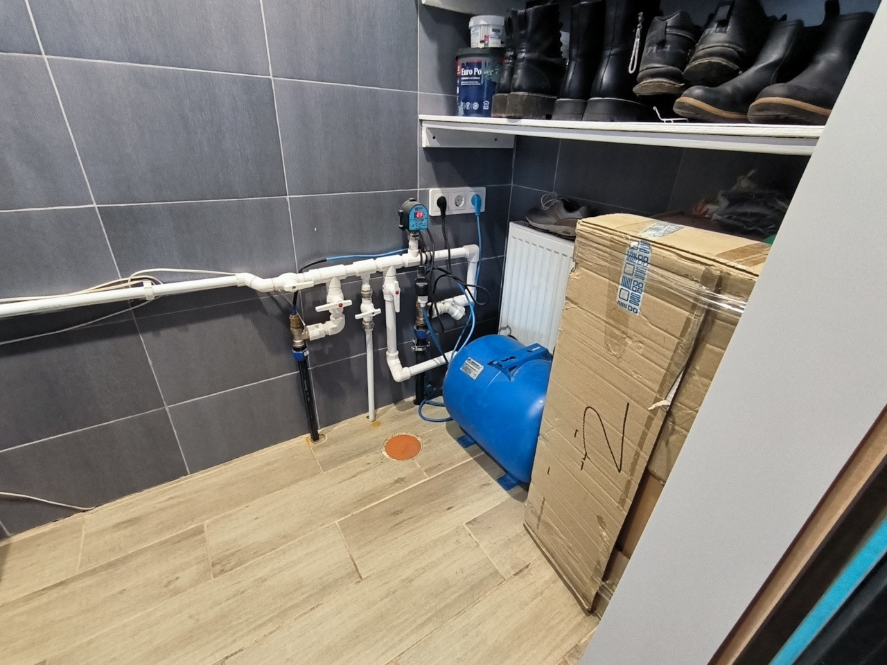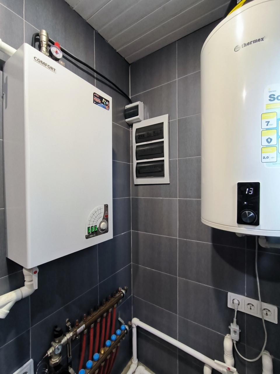 Коммуникации: вода-скважина (глубина скважины -38 метров (требуется доп фильтр, чтобы можно было пить воду); канализация-локальная биостанция на 4-5 человек; -отопление- электрический котел (до 180 кв м, 9 КВт), горячая вода-бойлер (80 литров); электричество 15 КВт (тариф день 5.30р ,ночь 3.10р)