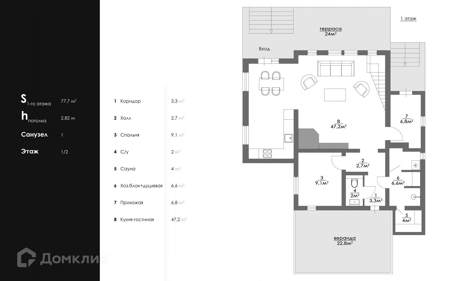 •      Продуманная планировка: большая кухня-гостиная с выходом на террасу, два санузла, постирочная, сауна и 3 комнаты.