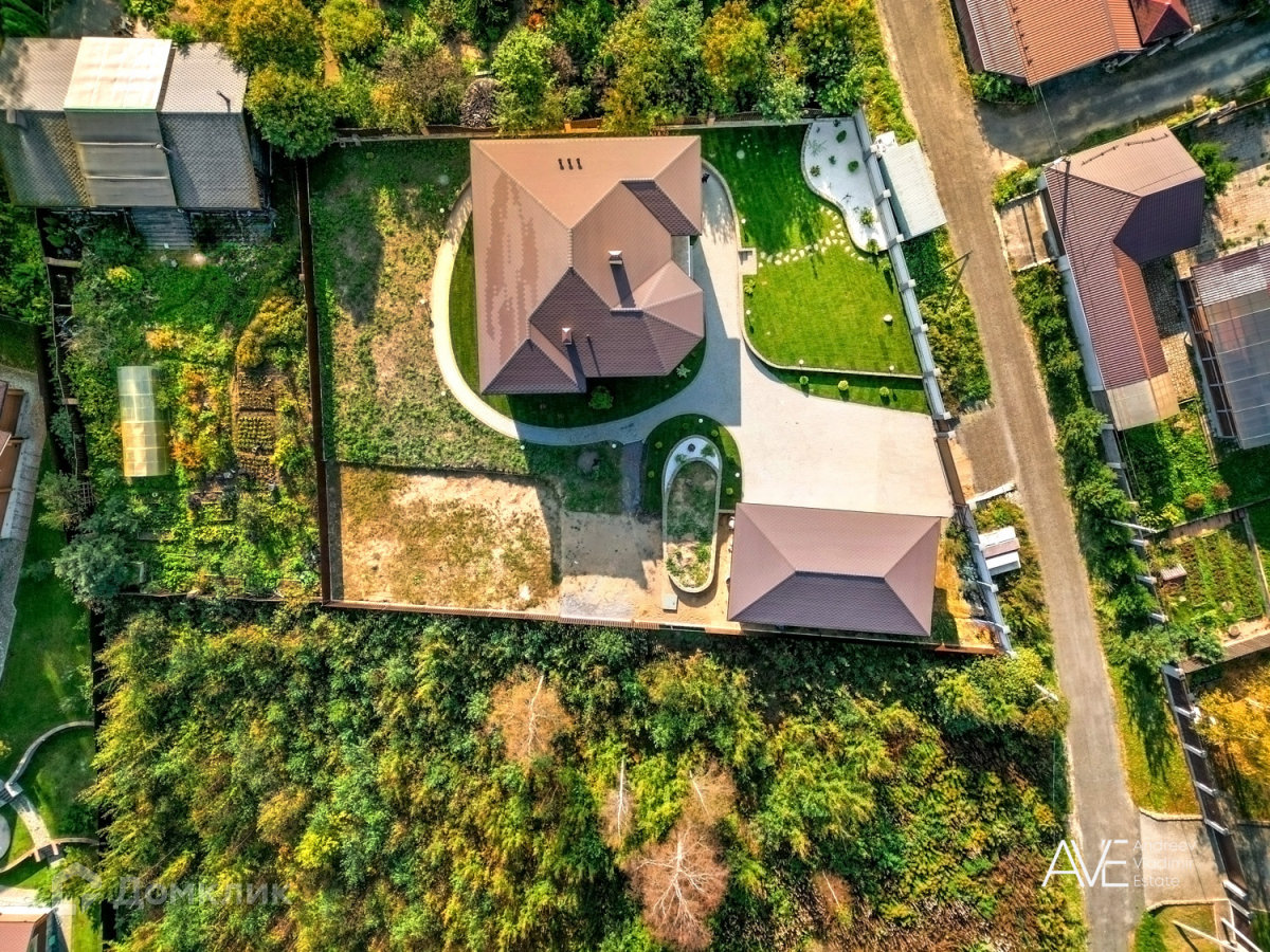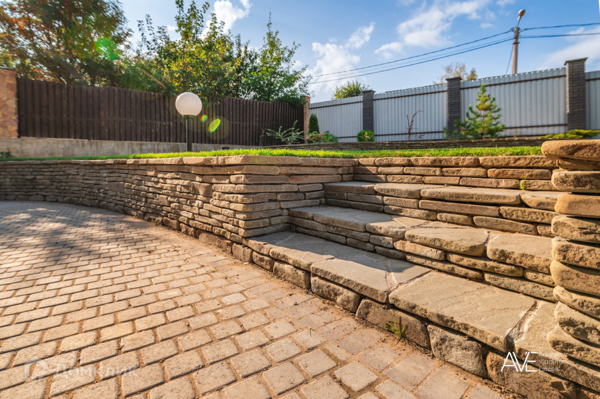 Участок огорожен забором, выполнено ландшафтное планирование, озеленение и мощение, установлены автоматические откатные ворота.
