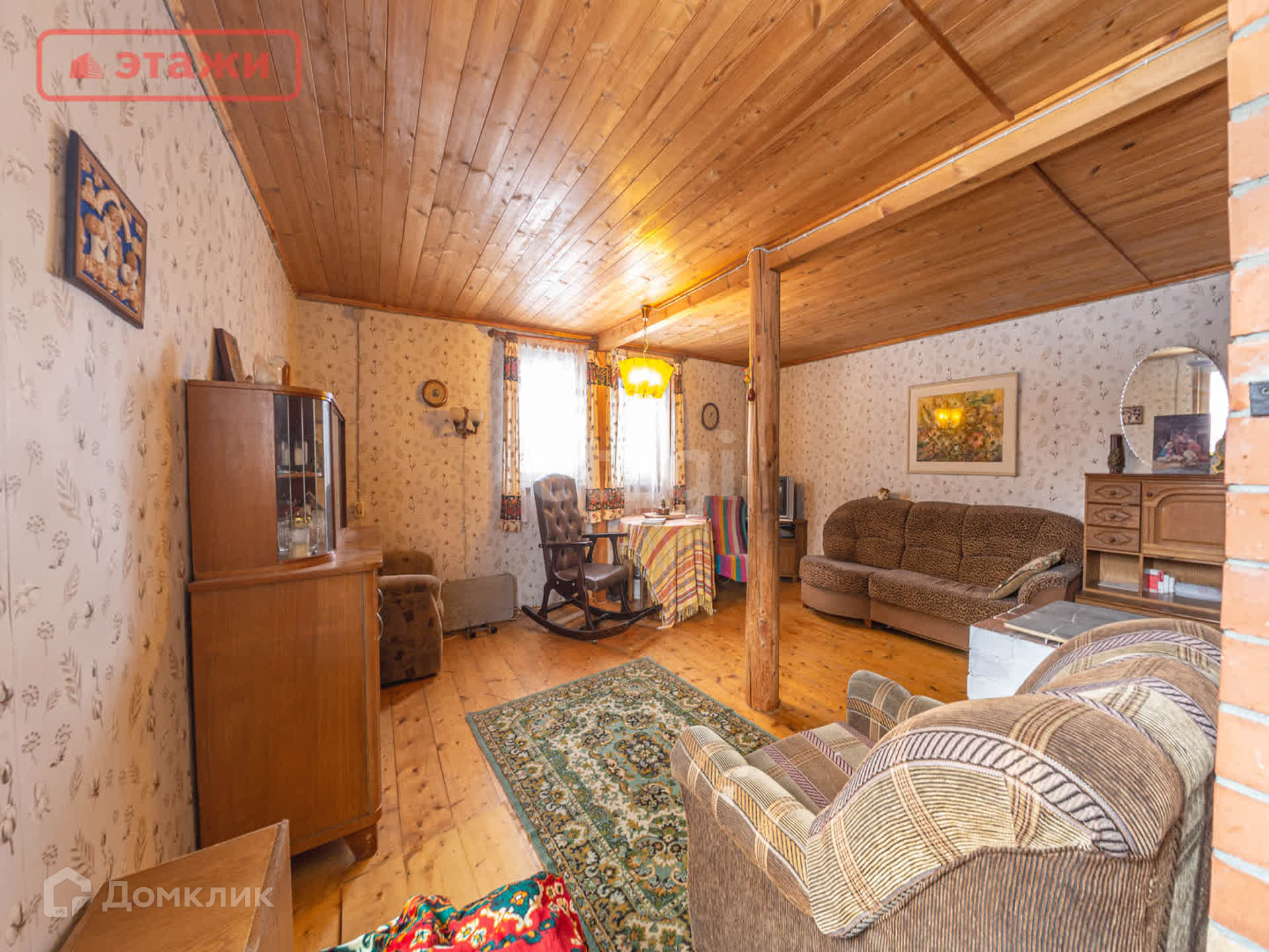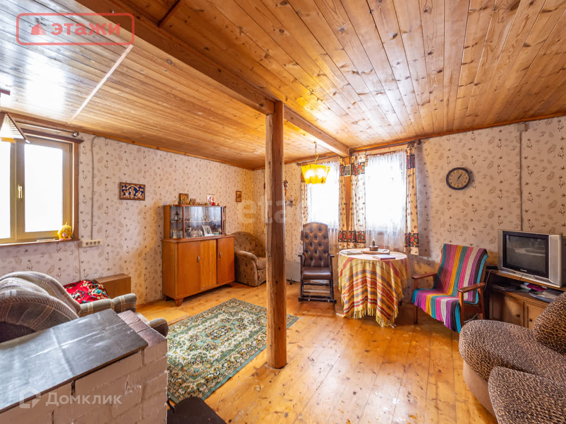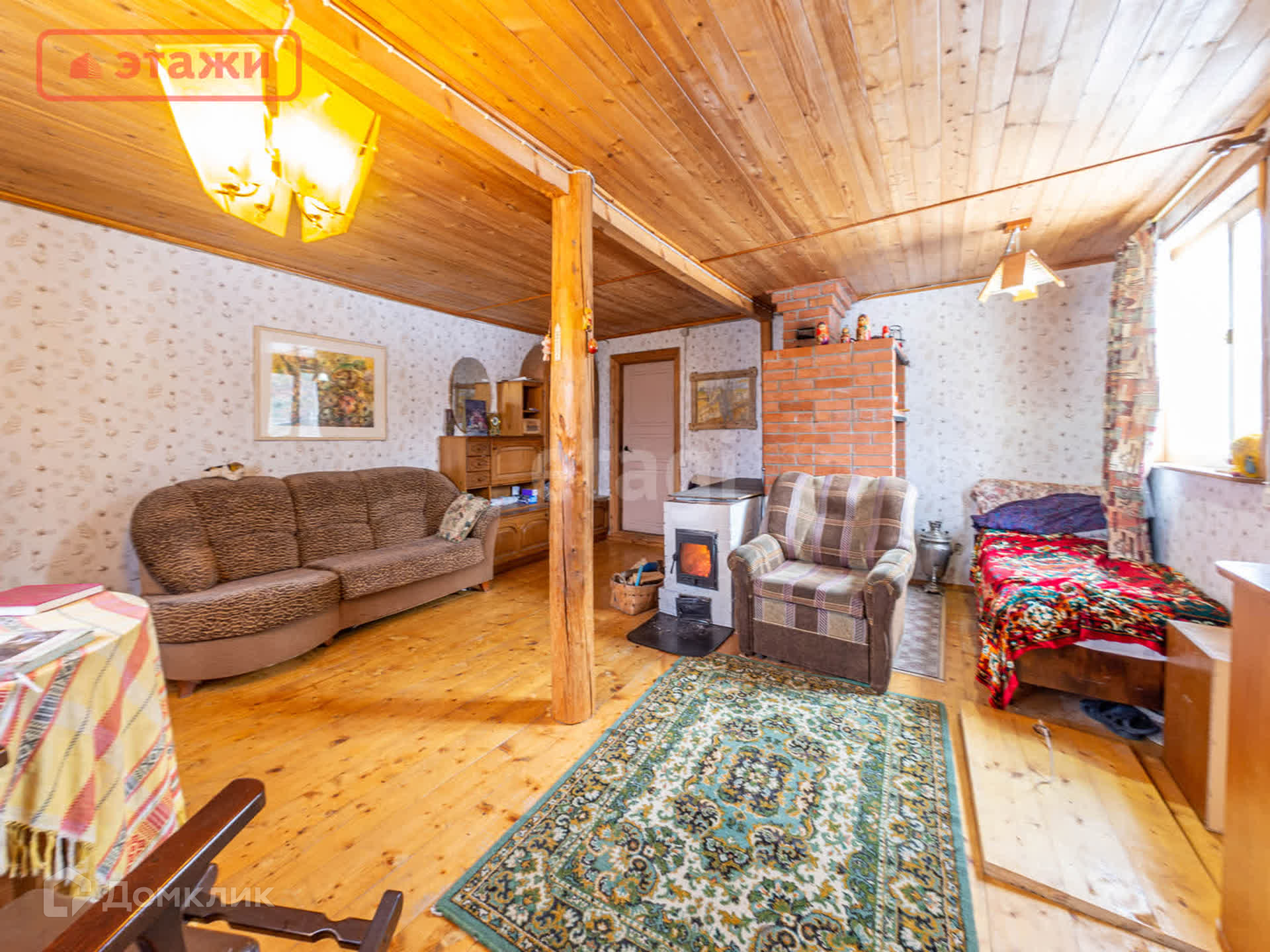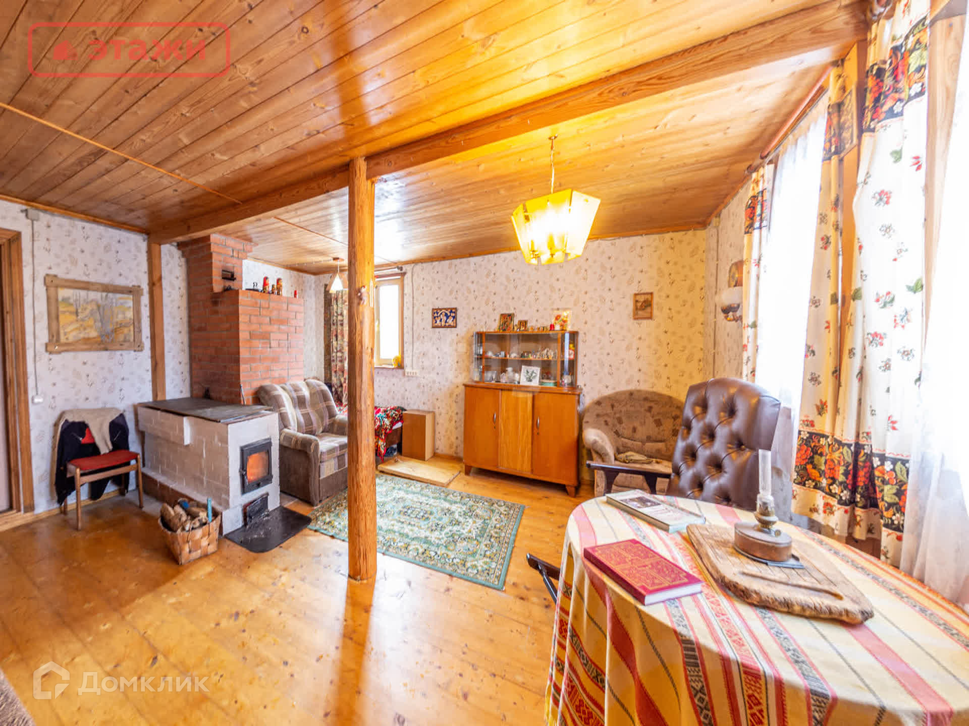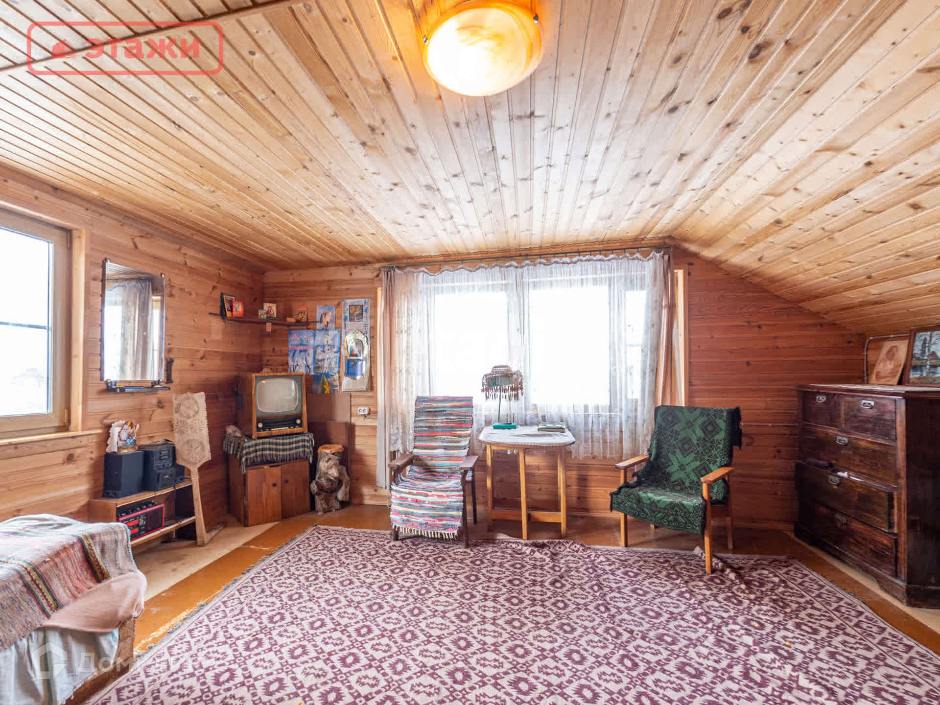 Большая гостиная с дровяной печью. Напольное покрытие лакированная доска. Потолочное перекрытие обшито вагонкой. На окнах установлены пластиковые стеклопакеты. Интерьер выполнен в Карельском этническом стиле с декоративными элементами ручной работы и винтажными предметами быта. Мебель из массива. Оборудован погреб для хранения.