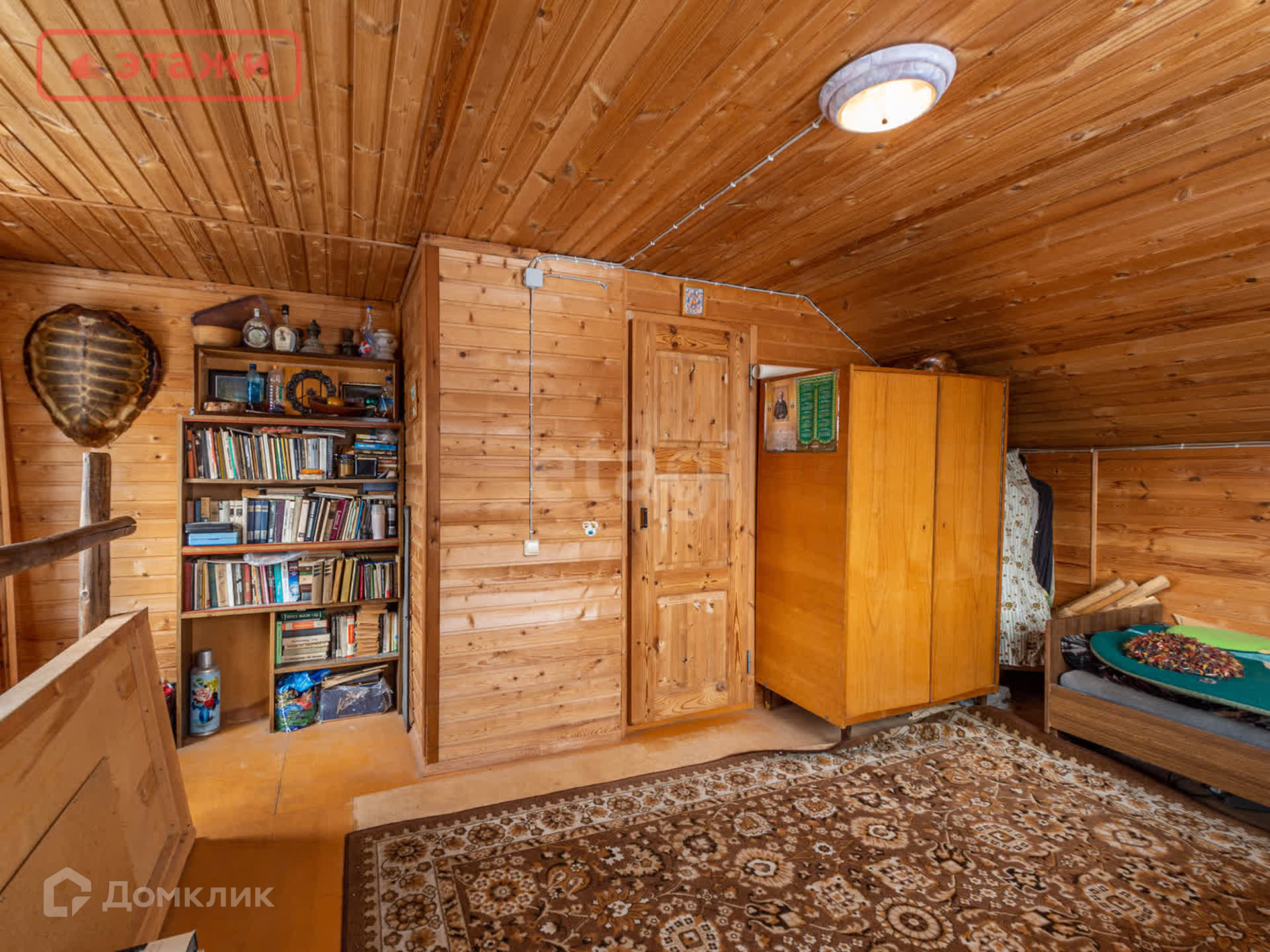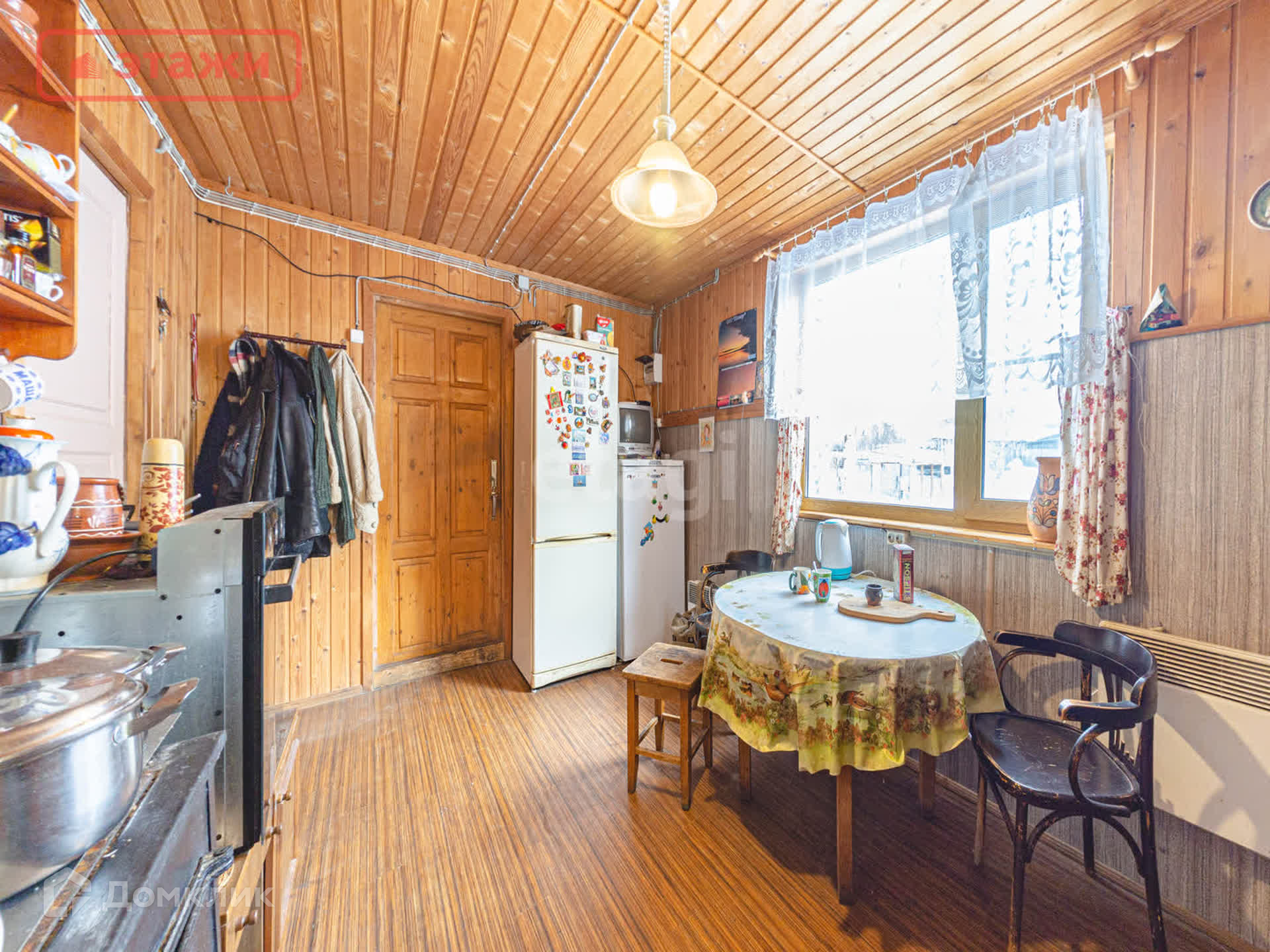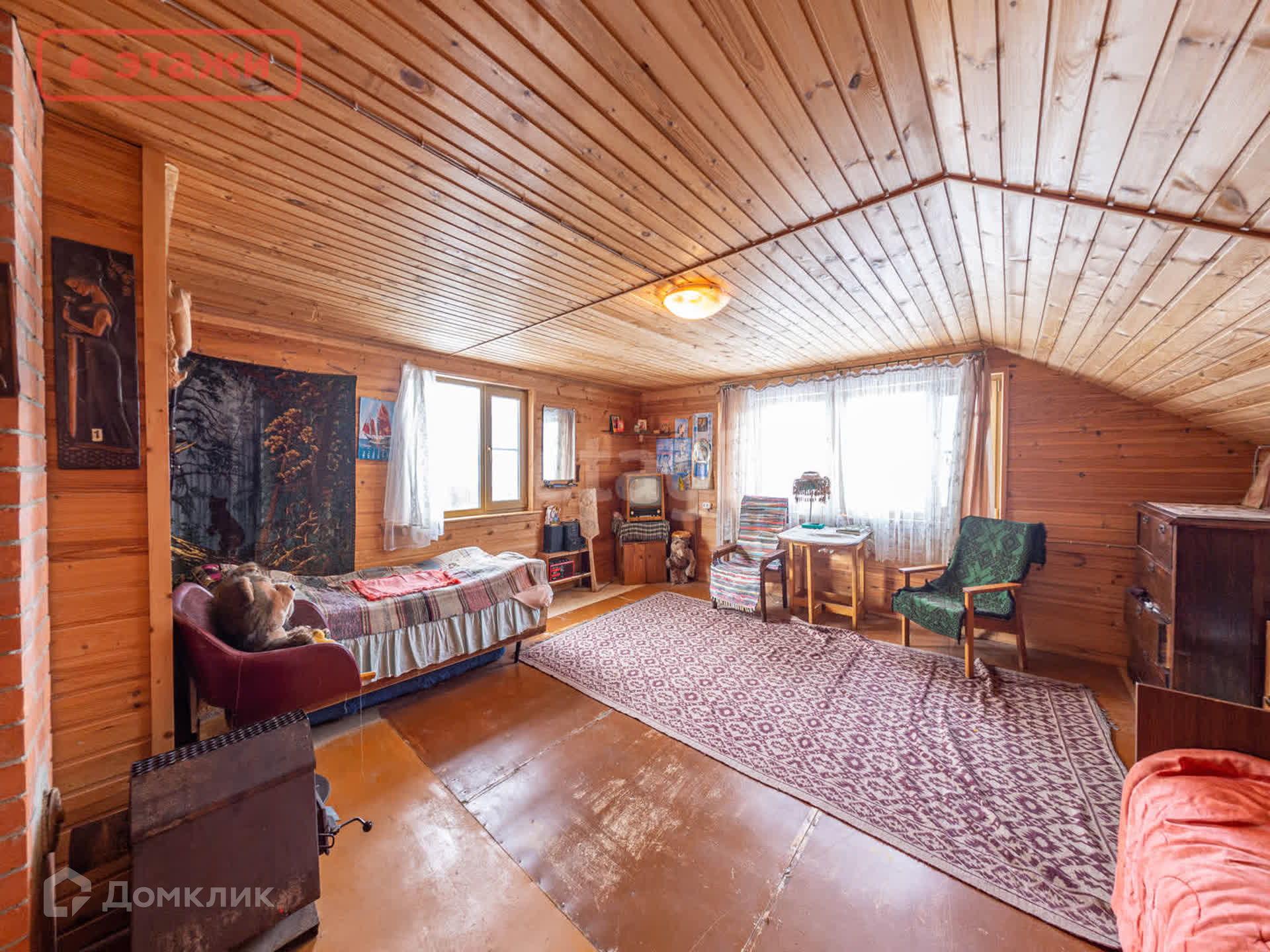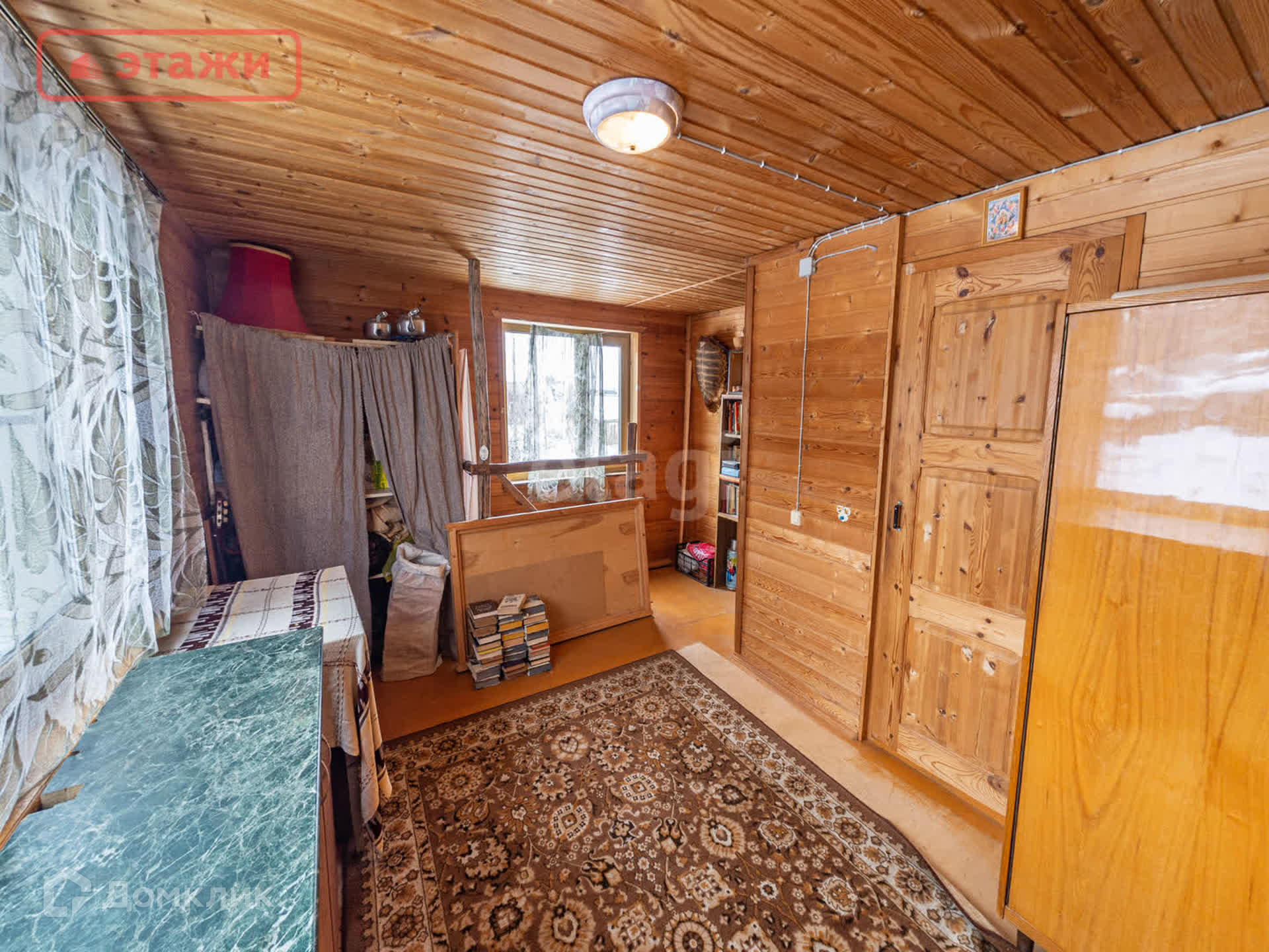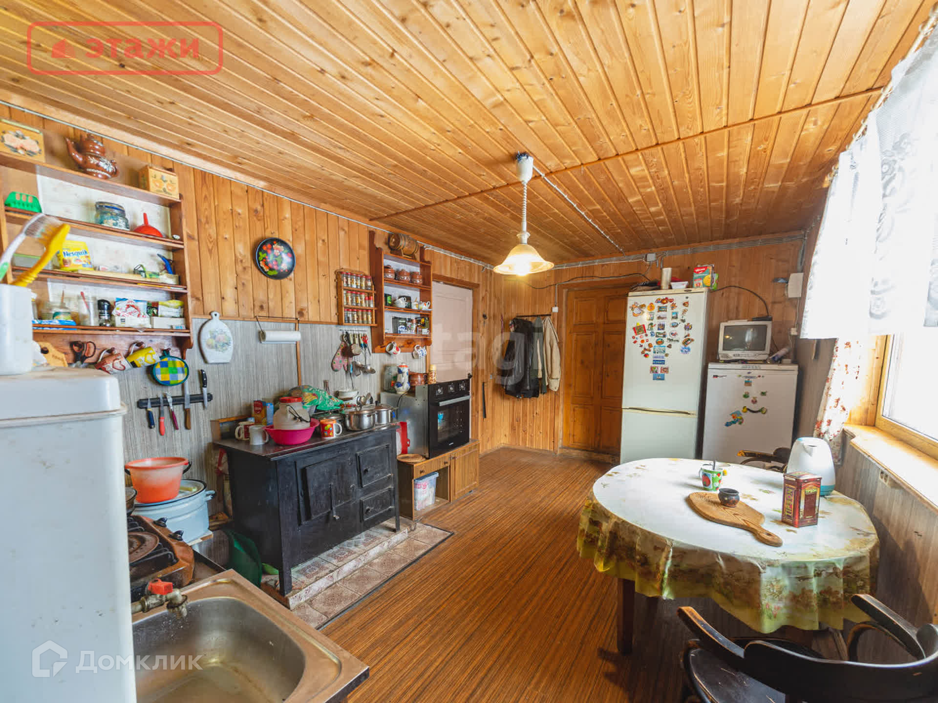 Большая гостиная с дровяной печью. Напольное покрытие лакированная доска. Потолочное перекрытие обшито вагонкой. На окнах установлены пластиковые стеклопакеты. Интерьер выполнен в Карельском этническом стиле с декоративными элементами ручной работы и винтажными предметами быта. Мебель из массива. Оборудован погреб для хранения.