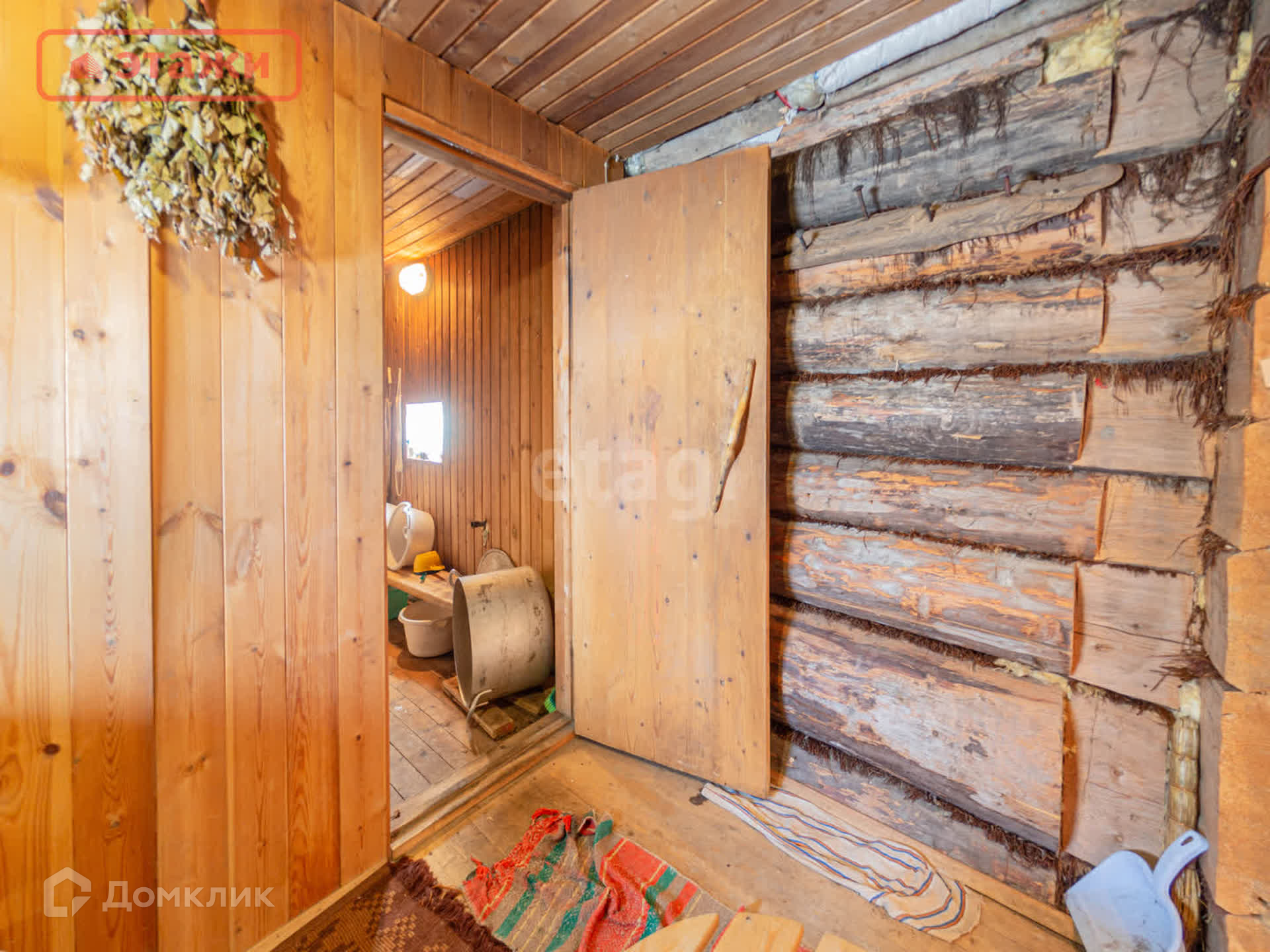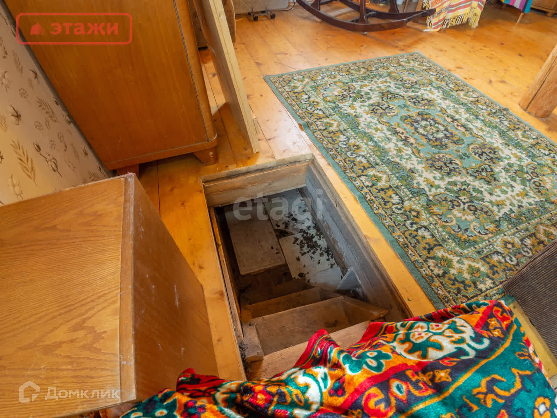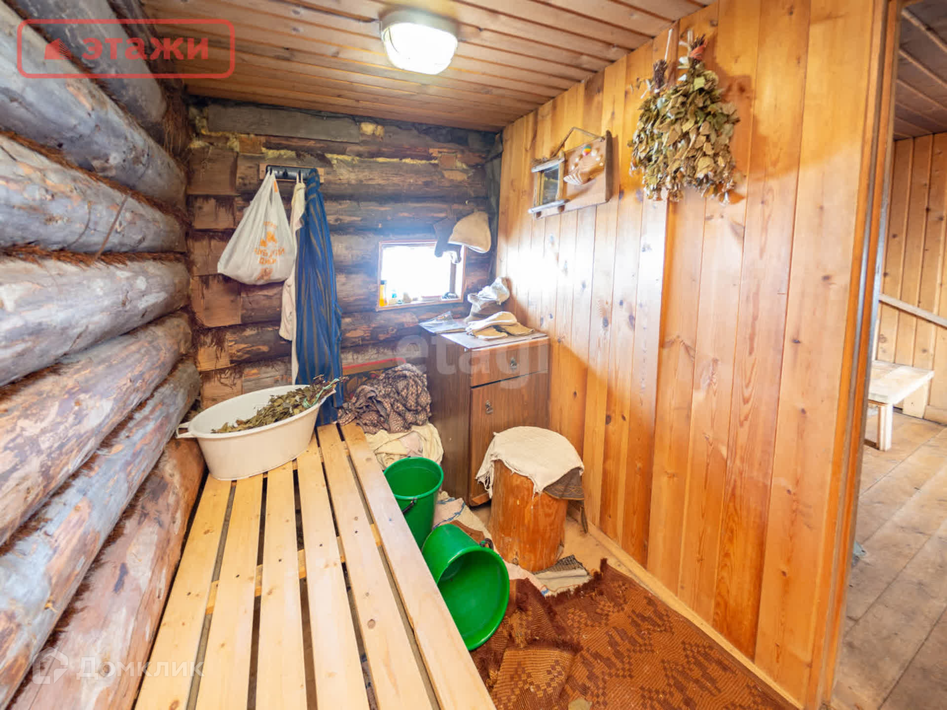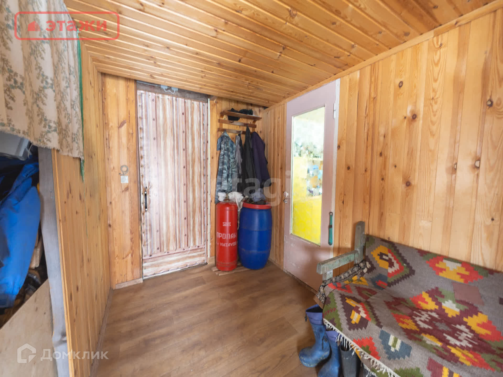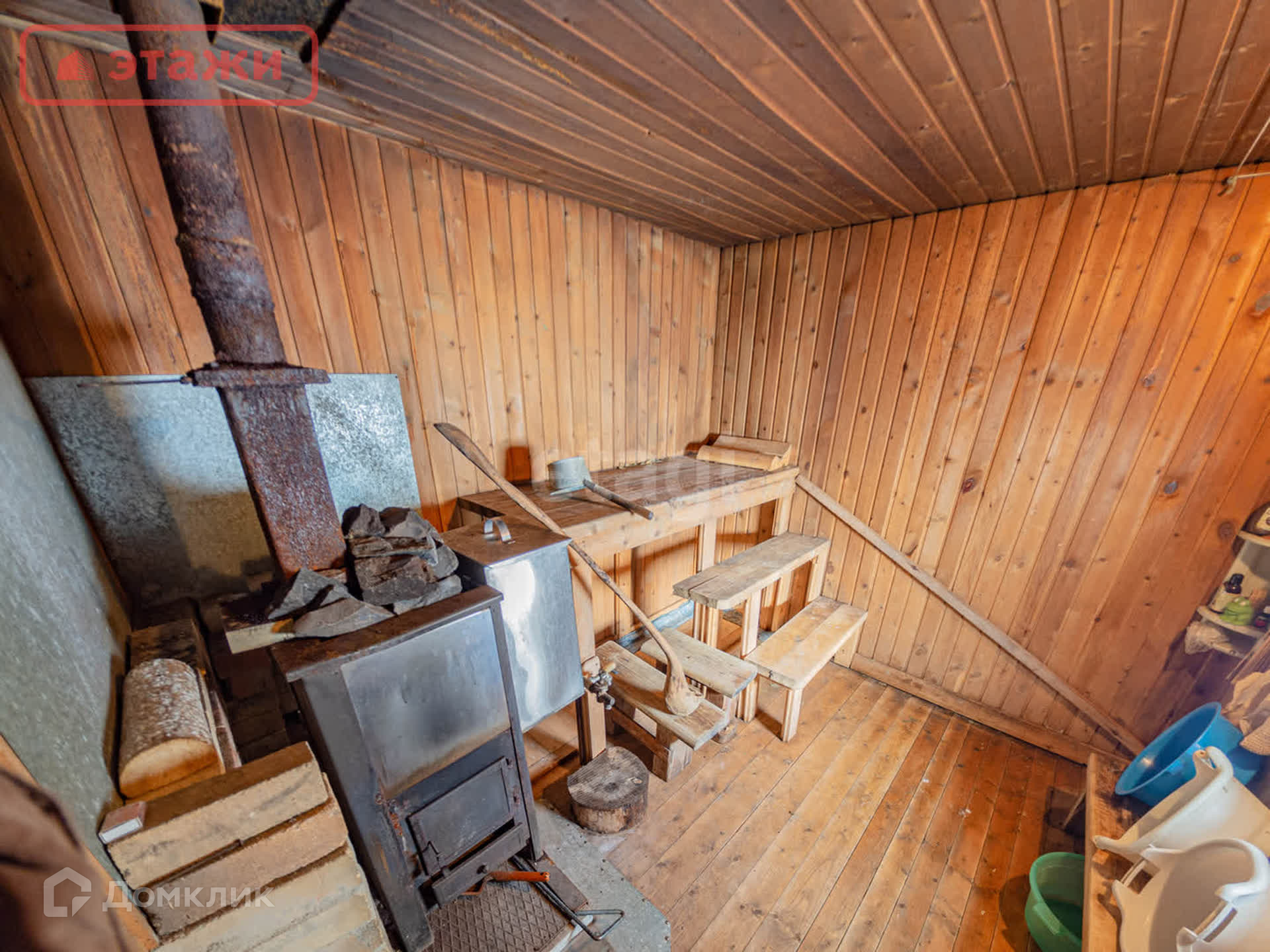 Большая гостиная с дровяной печью. Напольное покрытие лакированная доска. Потолочное перекрытие обшито вагонкой. На окнах установлены пластиковые стеклопакеты. Интерьер выполнен в Карельском этническом стиле с декоративными элементами ручной работы и винтажными предметами быта. Мебель из массива. Оборудован погреб для хранения.