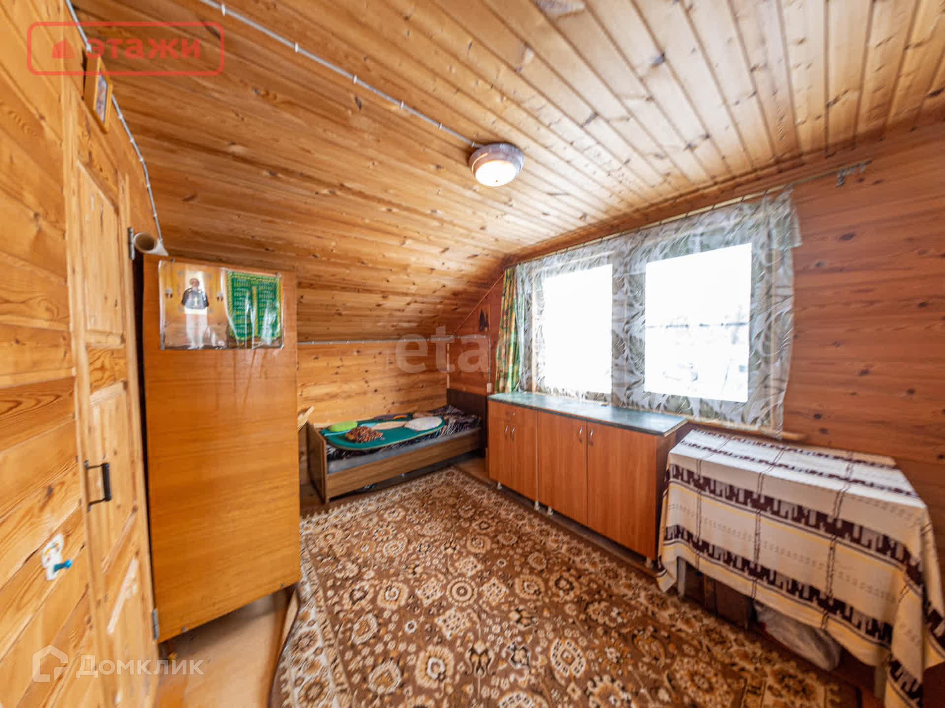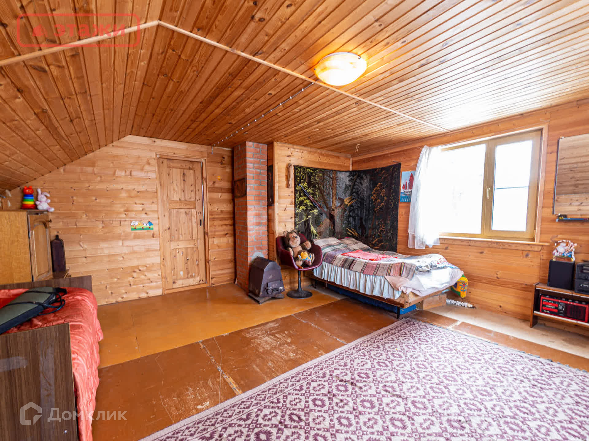 На втором этаже расположены 2 смежные комнаты одна из которых оборудована как детская. Помещения обшиты вагонкой. Окна с видом на озеро.