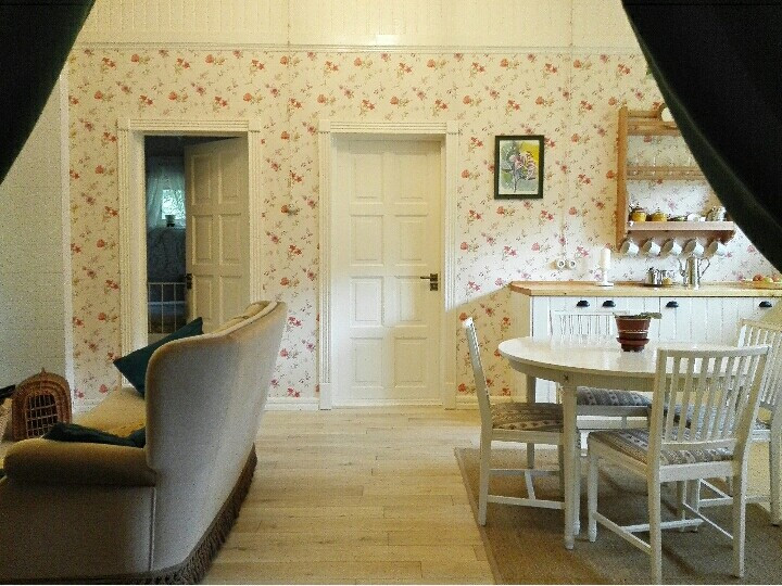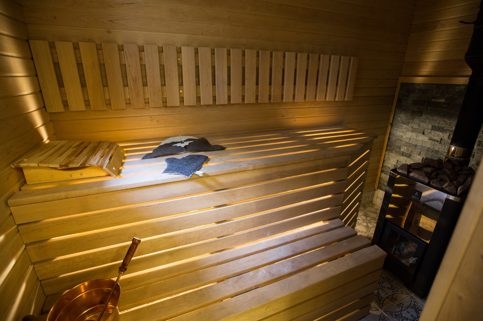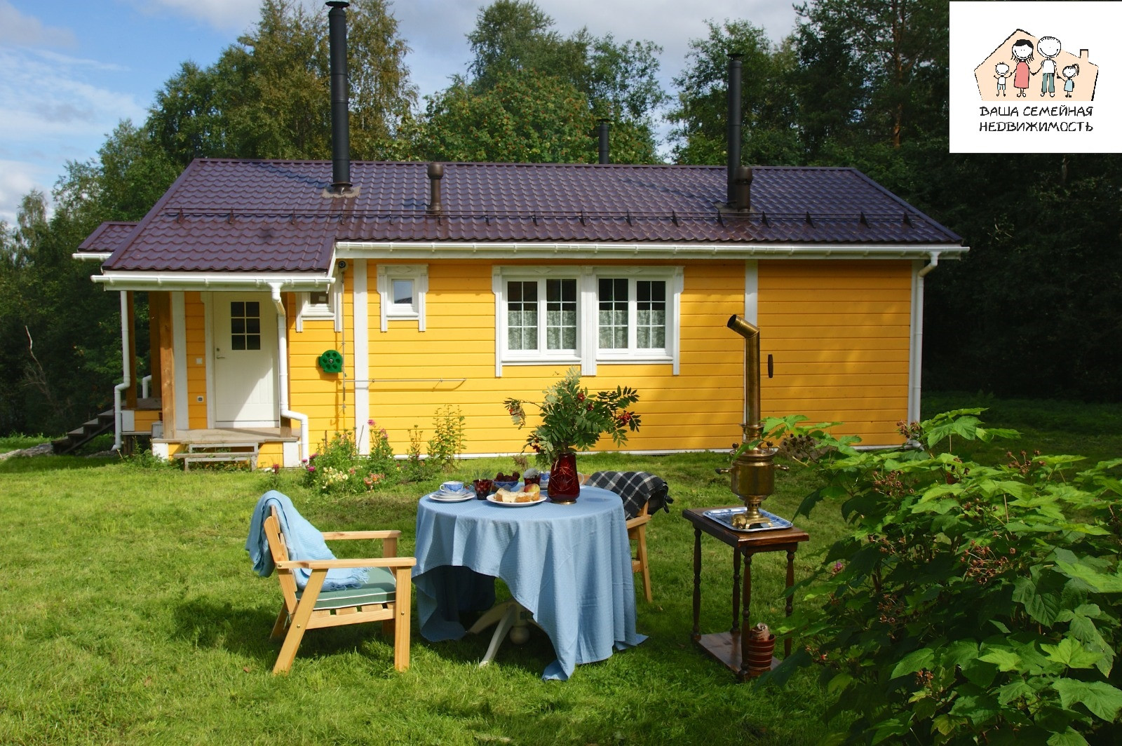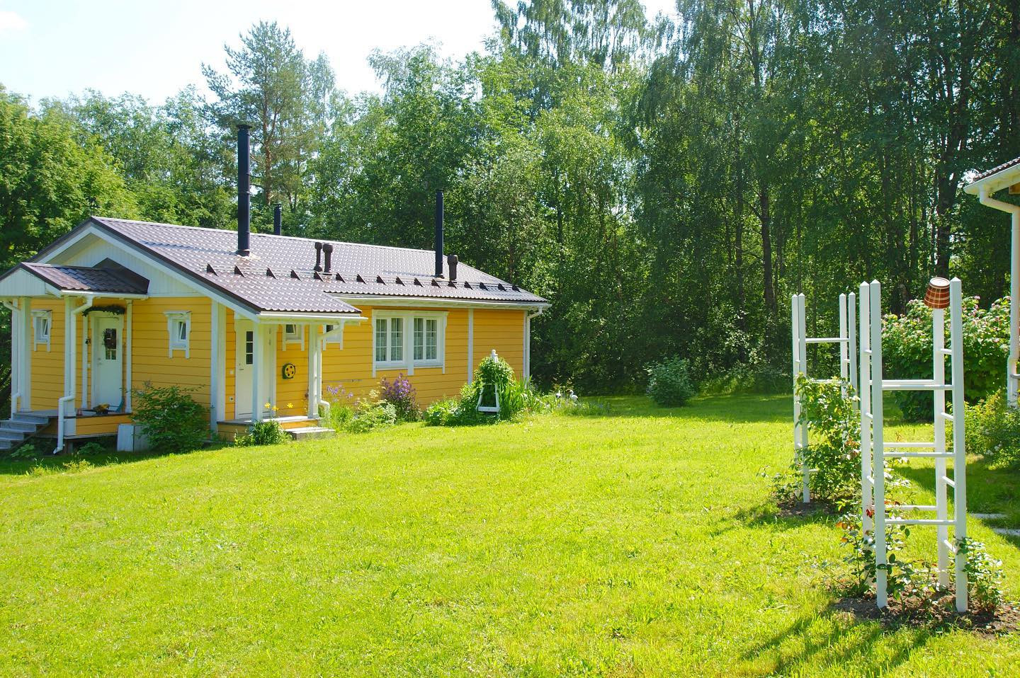 Гостевой дом, площадью 71,6 кв. м, с террасой и крыльцами - 99,4 кв. м. Дом оборудован всем необходимым для продолжительного комфортного проживания: большая кухня с необходимой бытовой техникой (холодильник, плита с духовым шкафом, стиральная и посудомоечная машины) и деревянной столешницей из массива; два санузла; просторная душевая; финская сауна из чёрной ольхи, благотворно влияющей на здоровье. В сауне установлена финская печь-каменка Kastor Karhu 20PK, в которой в качестве камней используется малиновый кварцит, дающий «легкий пар», этим он обязан своей высокой плотности и низкой теплопроводности, что, в совокупности, дает максимальную тепловую отдачу в течение длительного времени; уютная гостиная с печью-камином Dovre 250CBS от эксклюзивного норвежского бренда Dovre, который называют идеальным производителем. Две спальни с двухместной и двумя одноместными кроватями; терраса. Полы в гостиной и спальнях - массив дубовой доски, толщиной 2 см. На кухне, в санузлах и коридоре - плитка. В холода можно растопить печь-камин и любоваться живым огнём за приятной беседой в кругу близких людей. Через французские окна гостиной можно попасть на террасу, с которой открывается замечательный вид на лес и озеро.