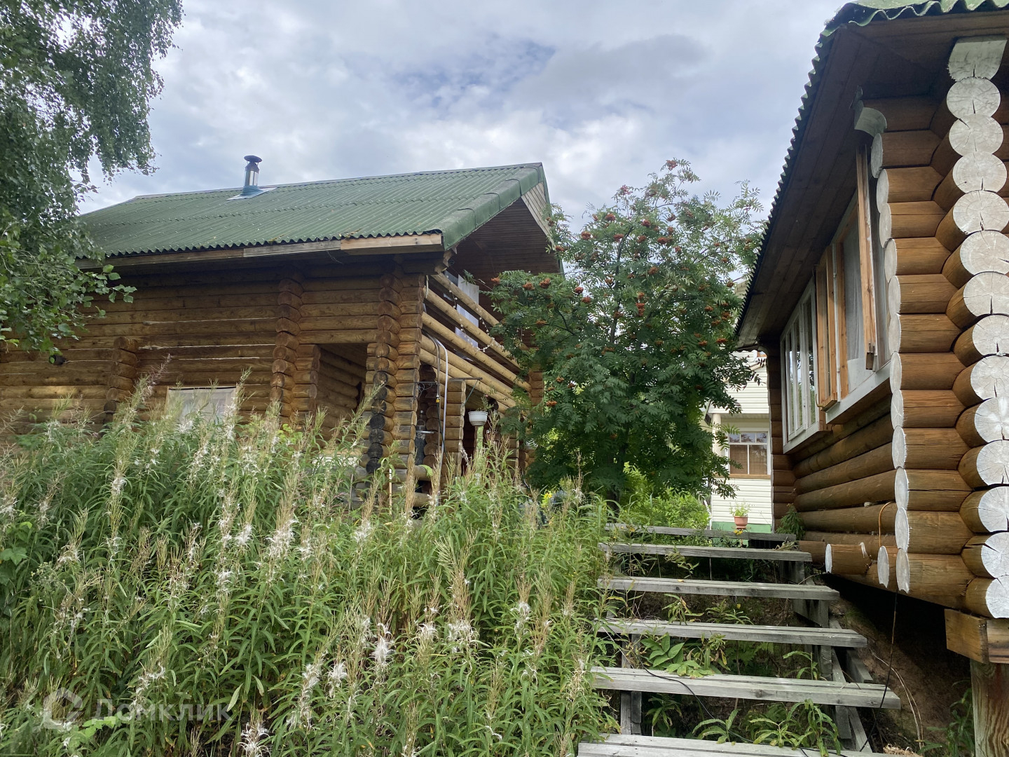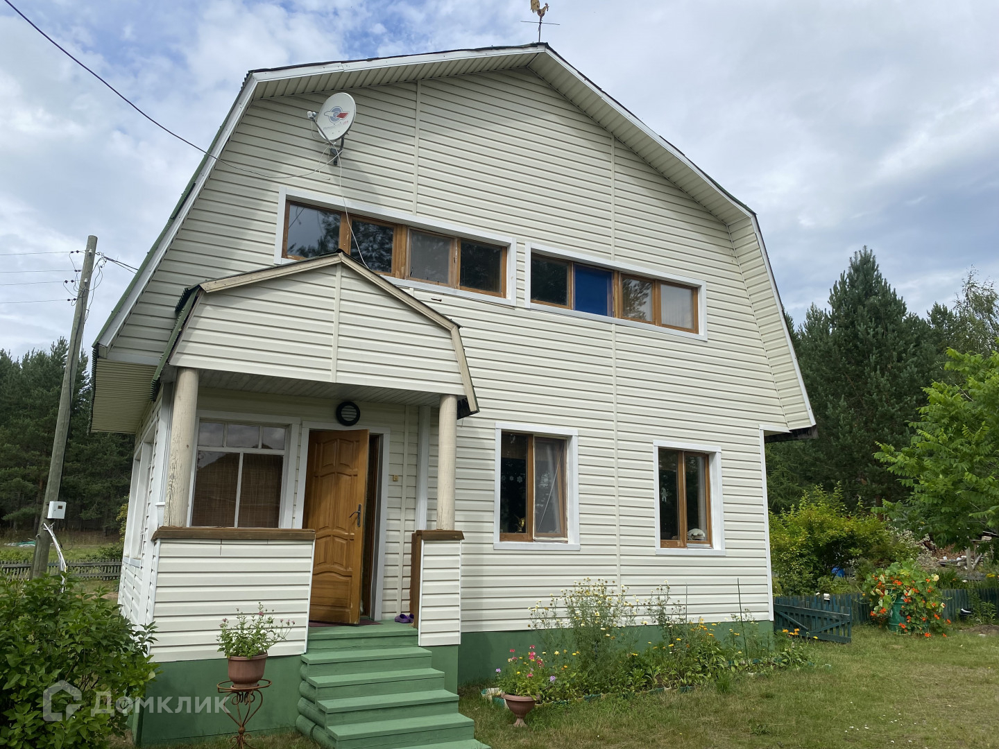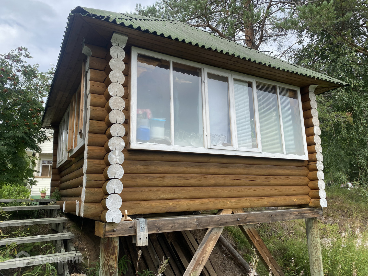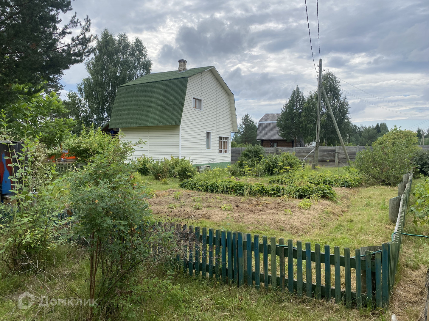 В составе усадьбы дом двухэтажный мансардного типа, баня двухэтажная мансардного типа из оцилиндрованного бревна, на втором этаже спальня, гараж деревянный, беседка остекленная из оцилиндрованного бревна, используемая в качестве летней кухни и столовой, мастерская, оборудованная из старой бани, мостки для выхода к воде, дровяник , уличный туалет с биоунитазом и электроотоплением, парник, скважина с насосом, обработанный участок с культурными растениями: смородина, жимолость, крыжовник, черноплодная рябина, клубника, ирга, рябина, сирень, цветы. Культивированы ландыши. Усадьба огорожена деревянным забором высотой 2 м.