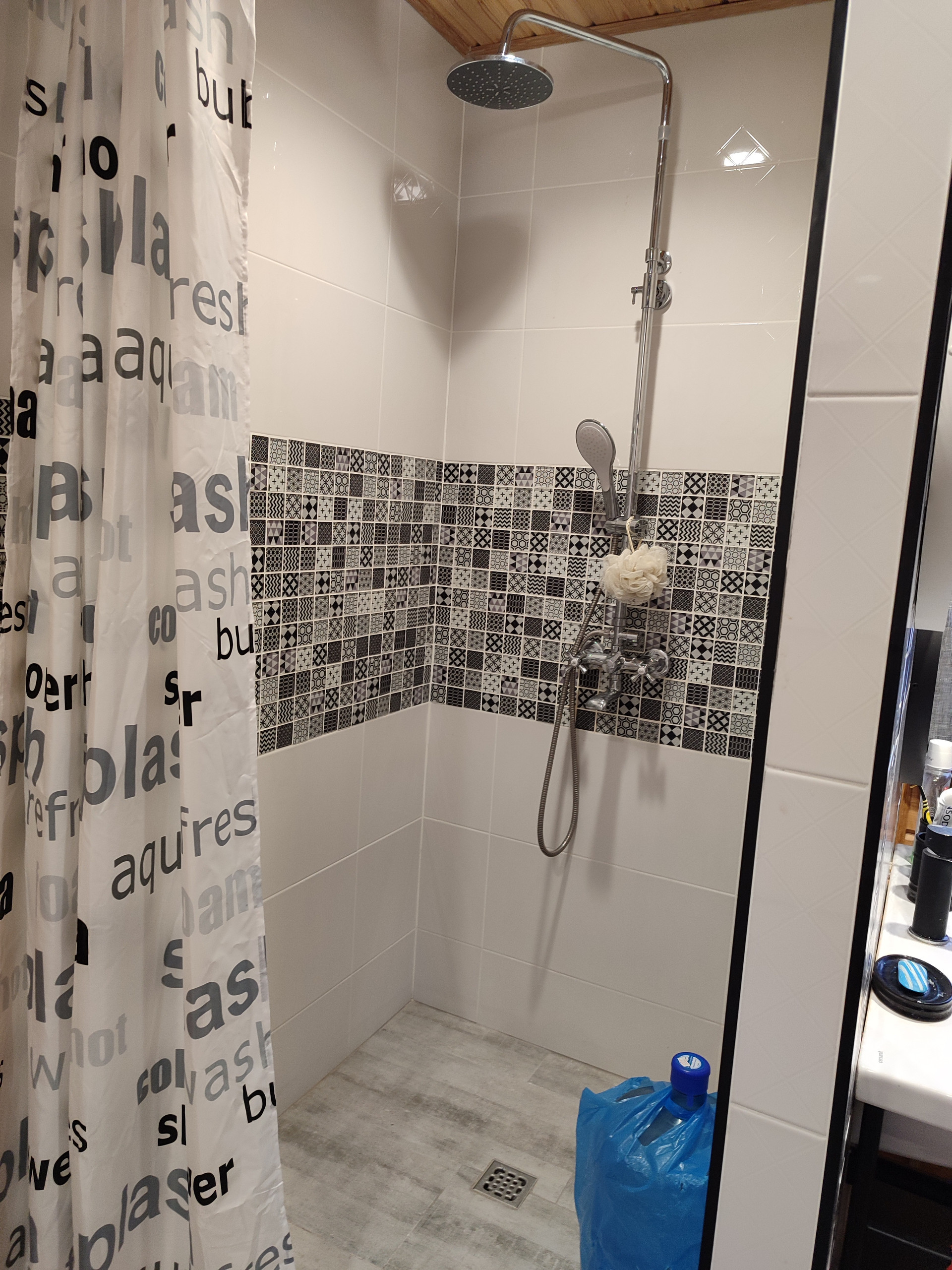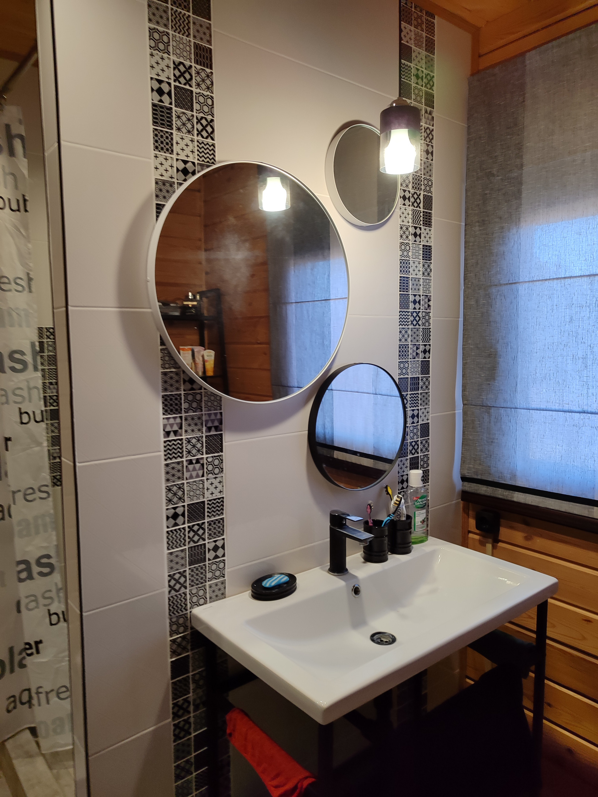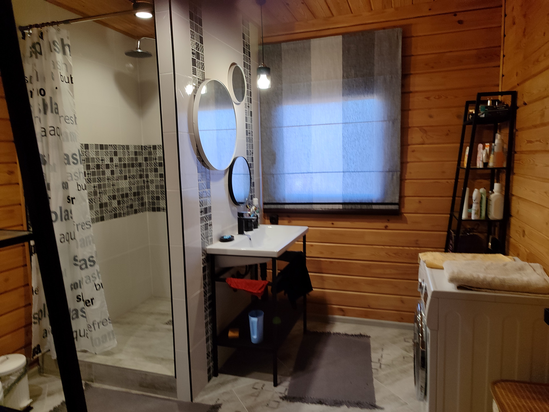 В санузле душевая, выложенная кафелем, шкаф для хранения, бойлер на 100 л, стиральная машина LG, раковина, зеркала и этажерки в стиле лофт.