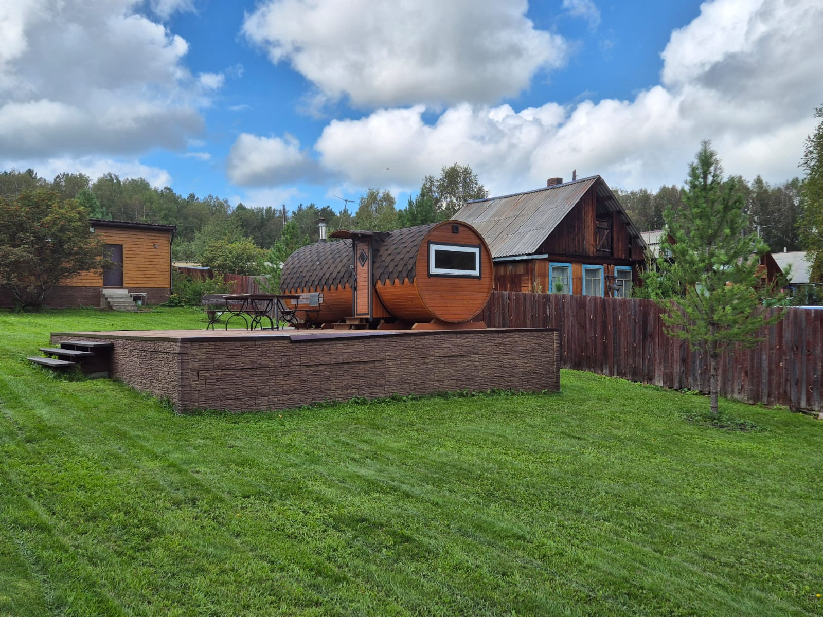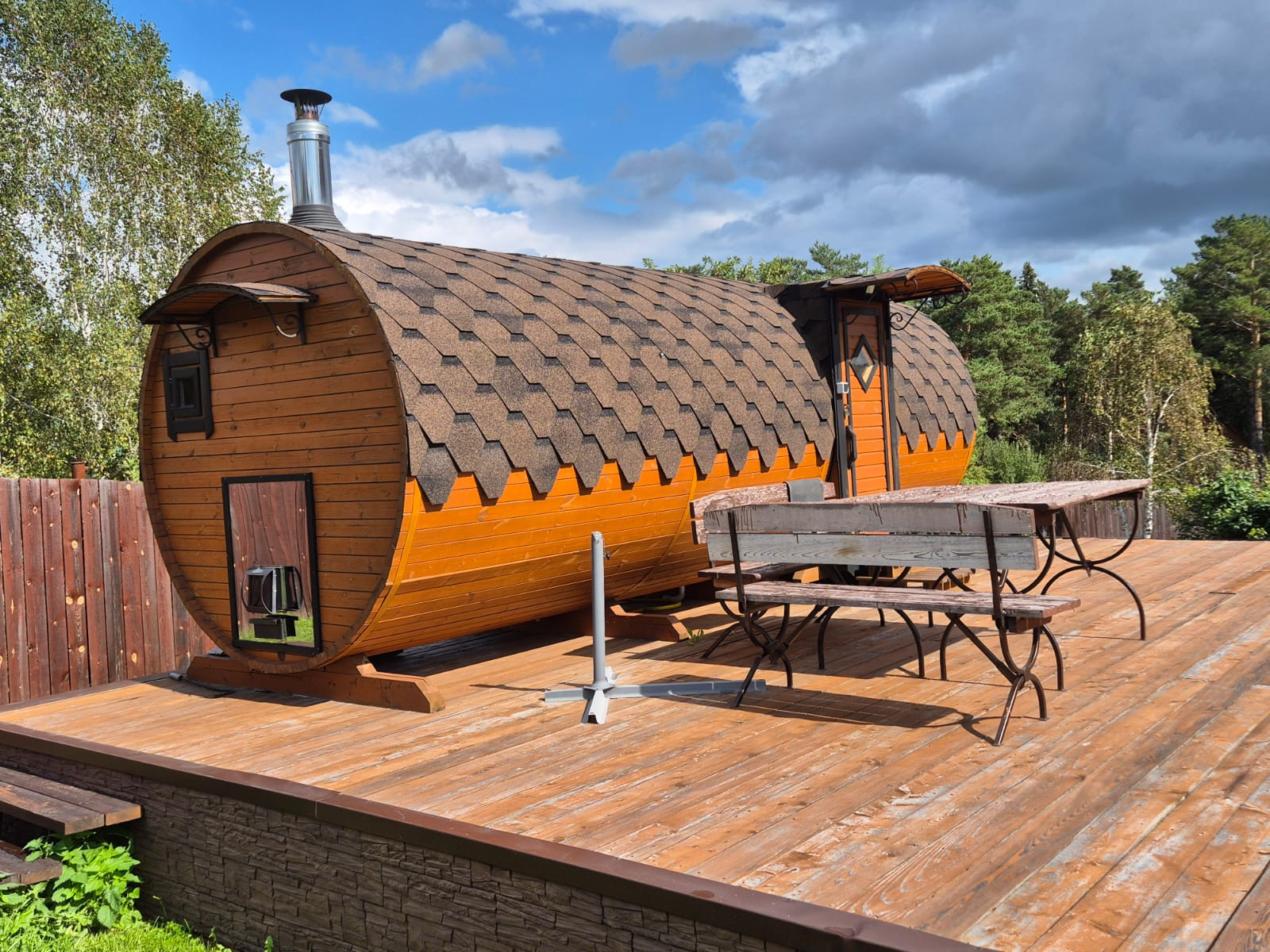 Баня-бочка на подиуме из лиственницы.