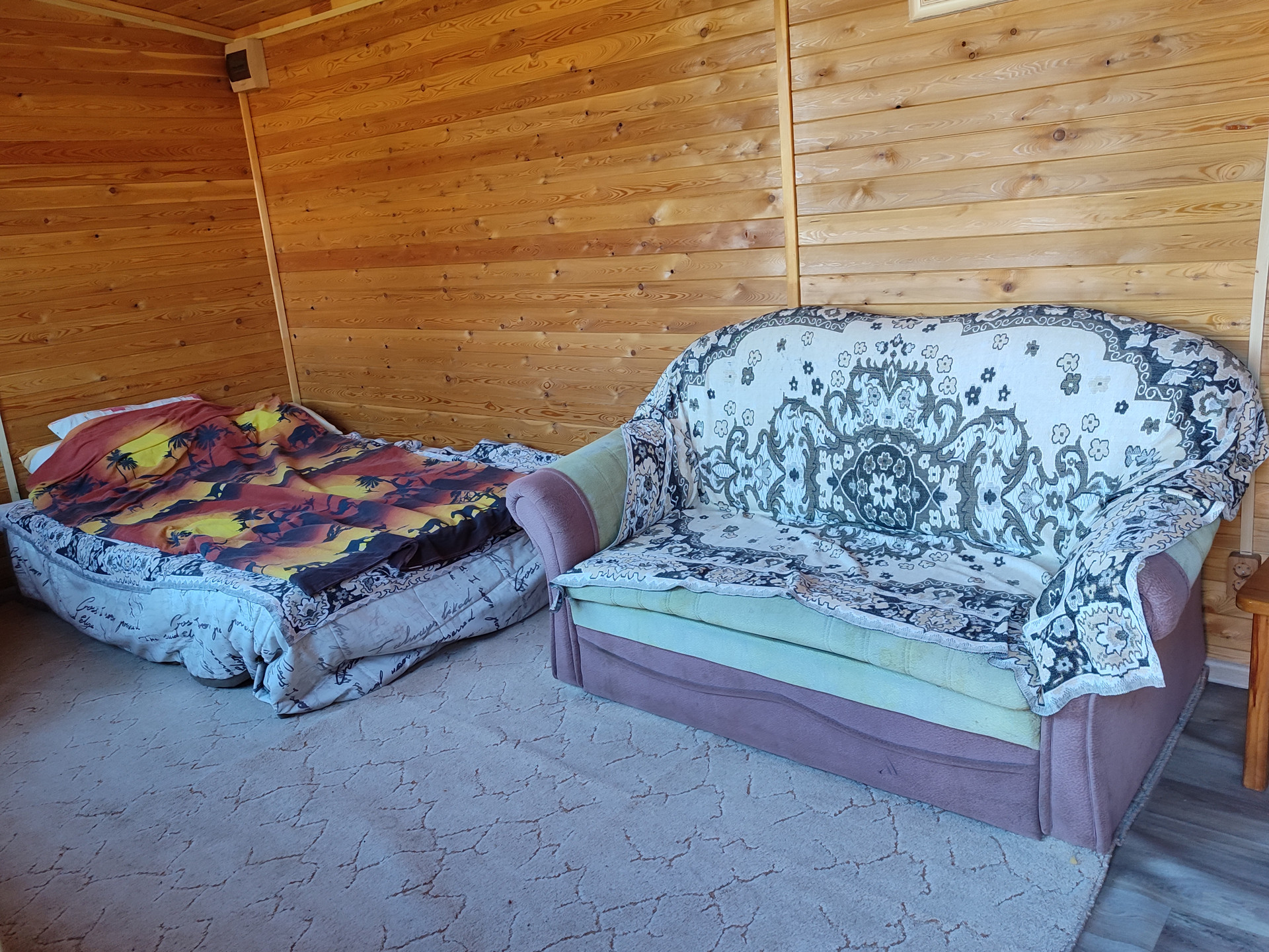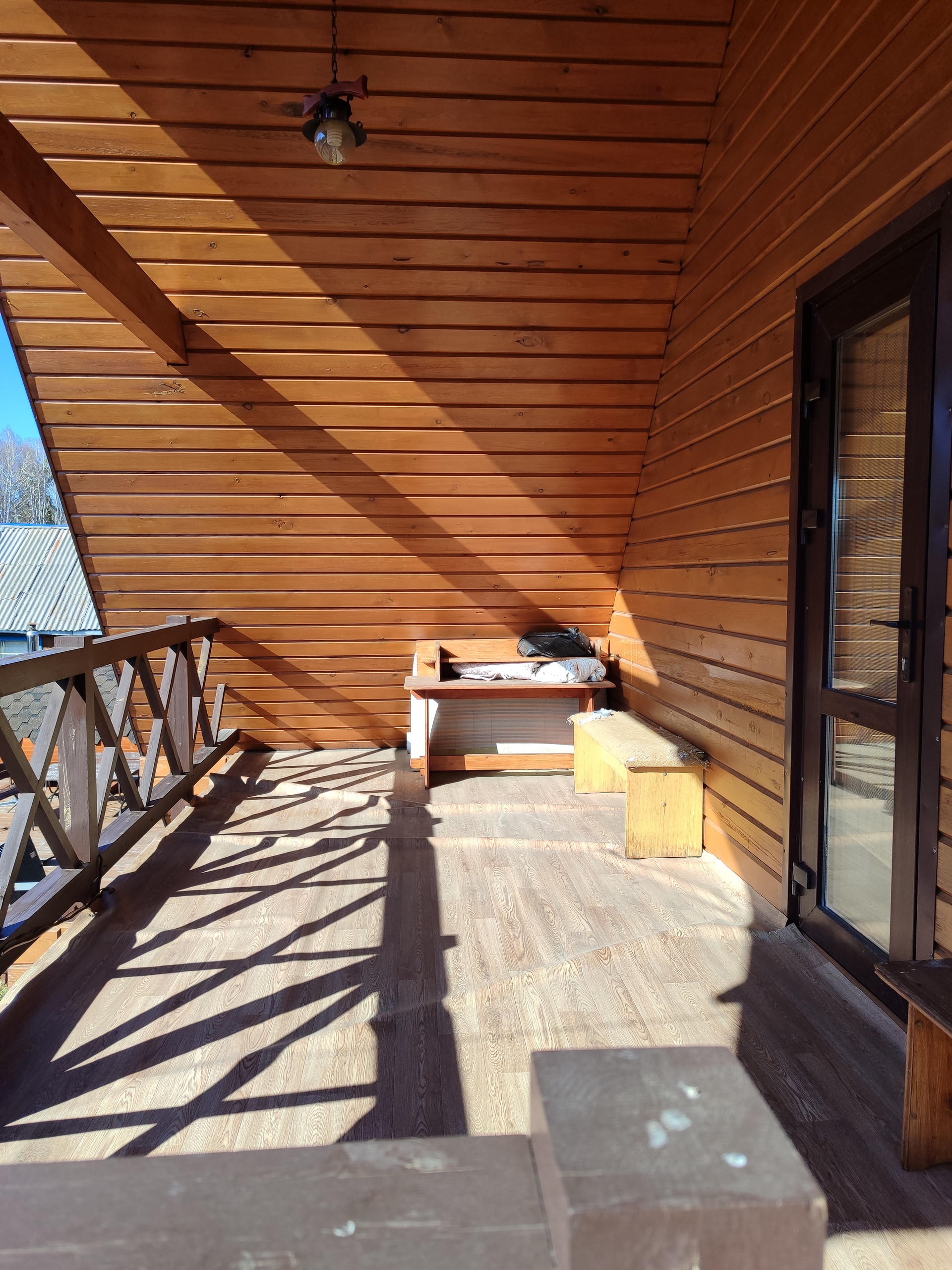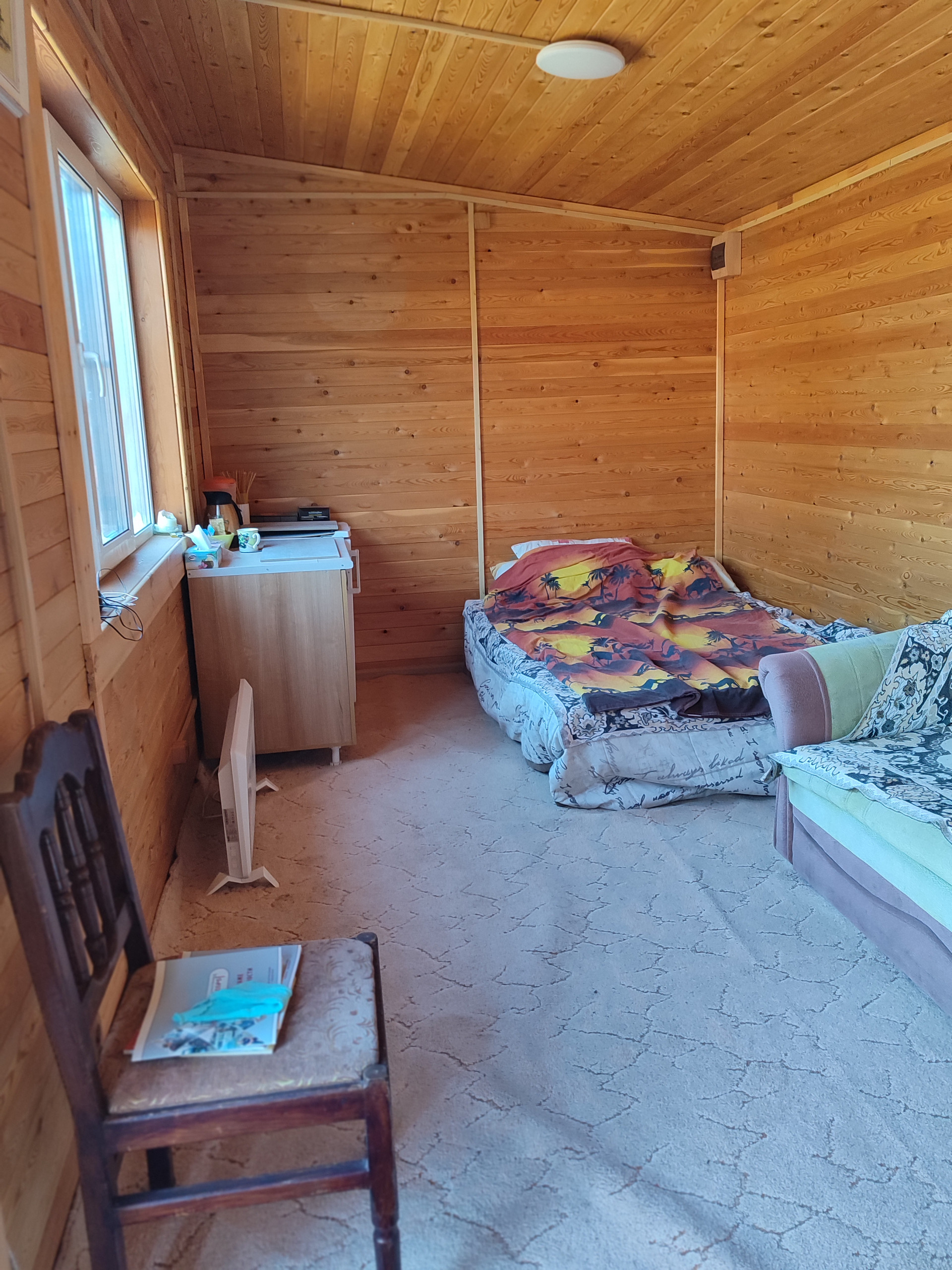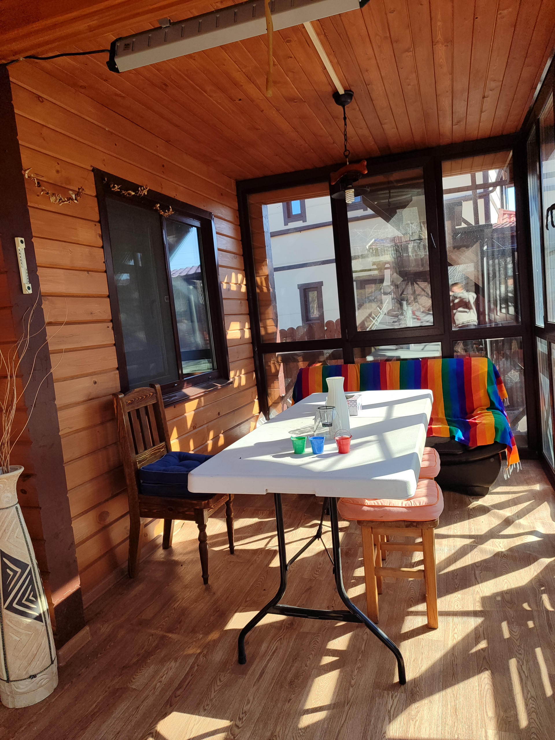 Имеется инфракрасная лампа для обогрева в холодное время года, позволяет пользоваться верандой до октября, диван.