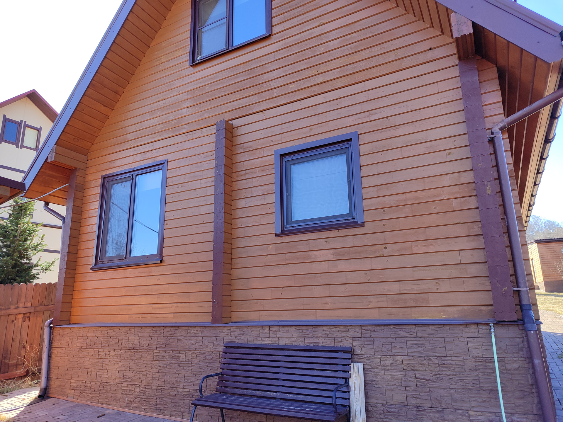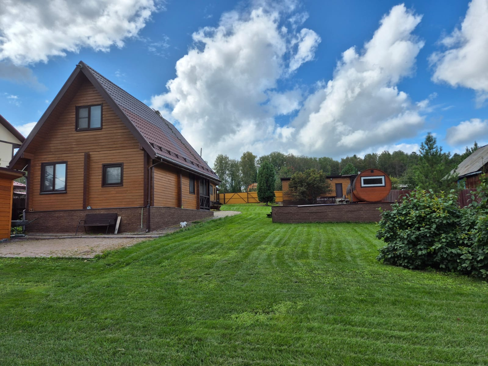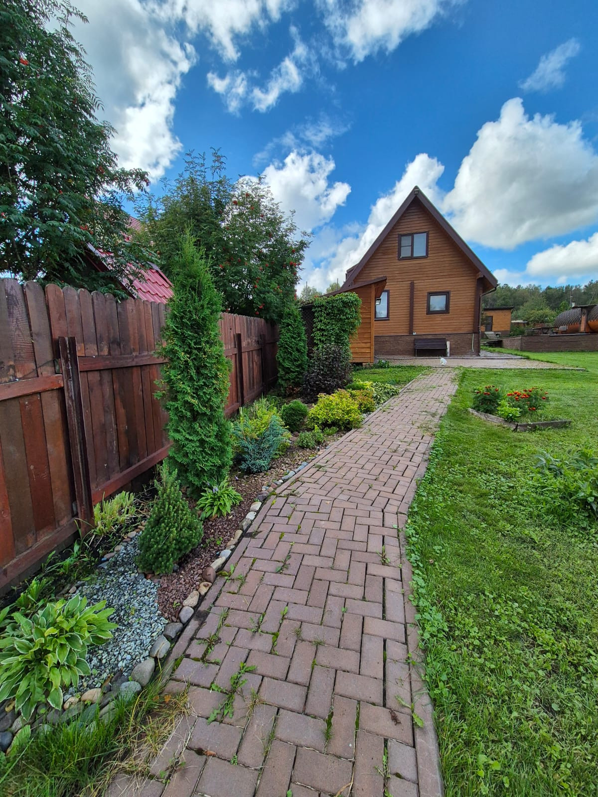Площадка перед и позади дома, а также дорожки выложены брусчаткой.