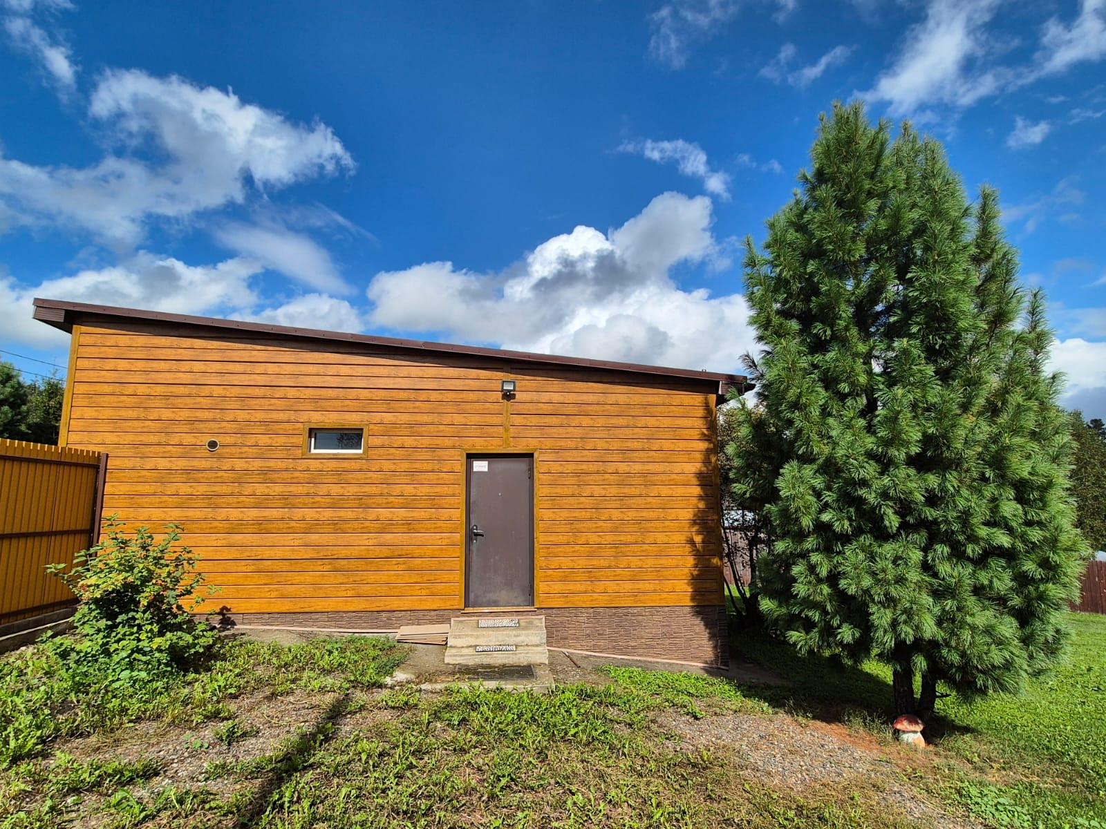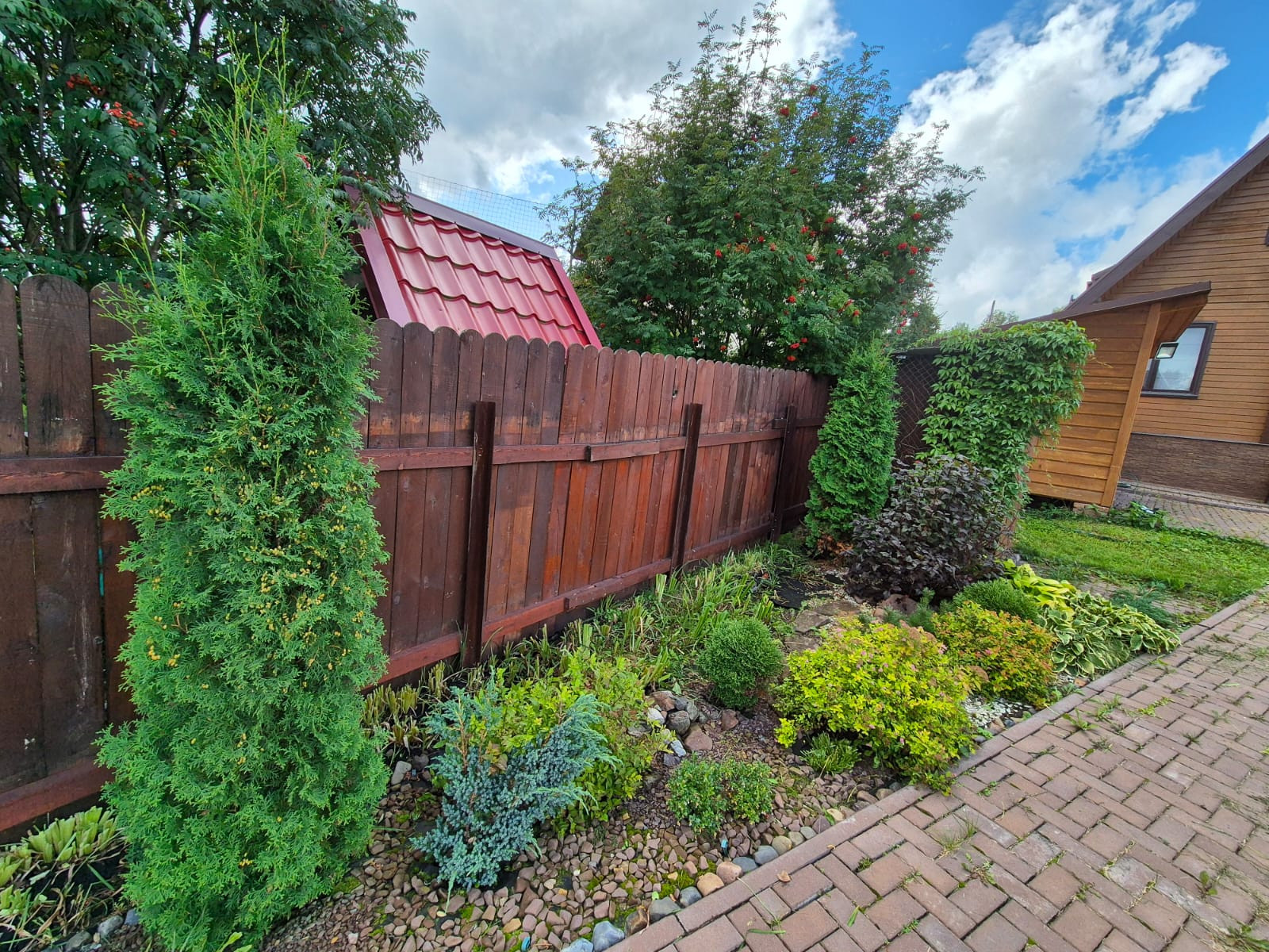 Участок ровный, ландшафтный дизайн, высажены деревья-крупномеры - кедр (плодоносит шишки с орехом), 3 сосны, ель, береза, клен, рябина, сирень, туи, калина-бульданеш.