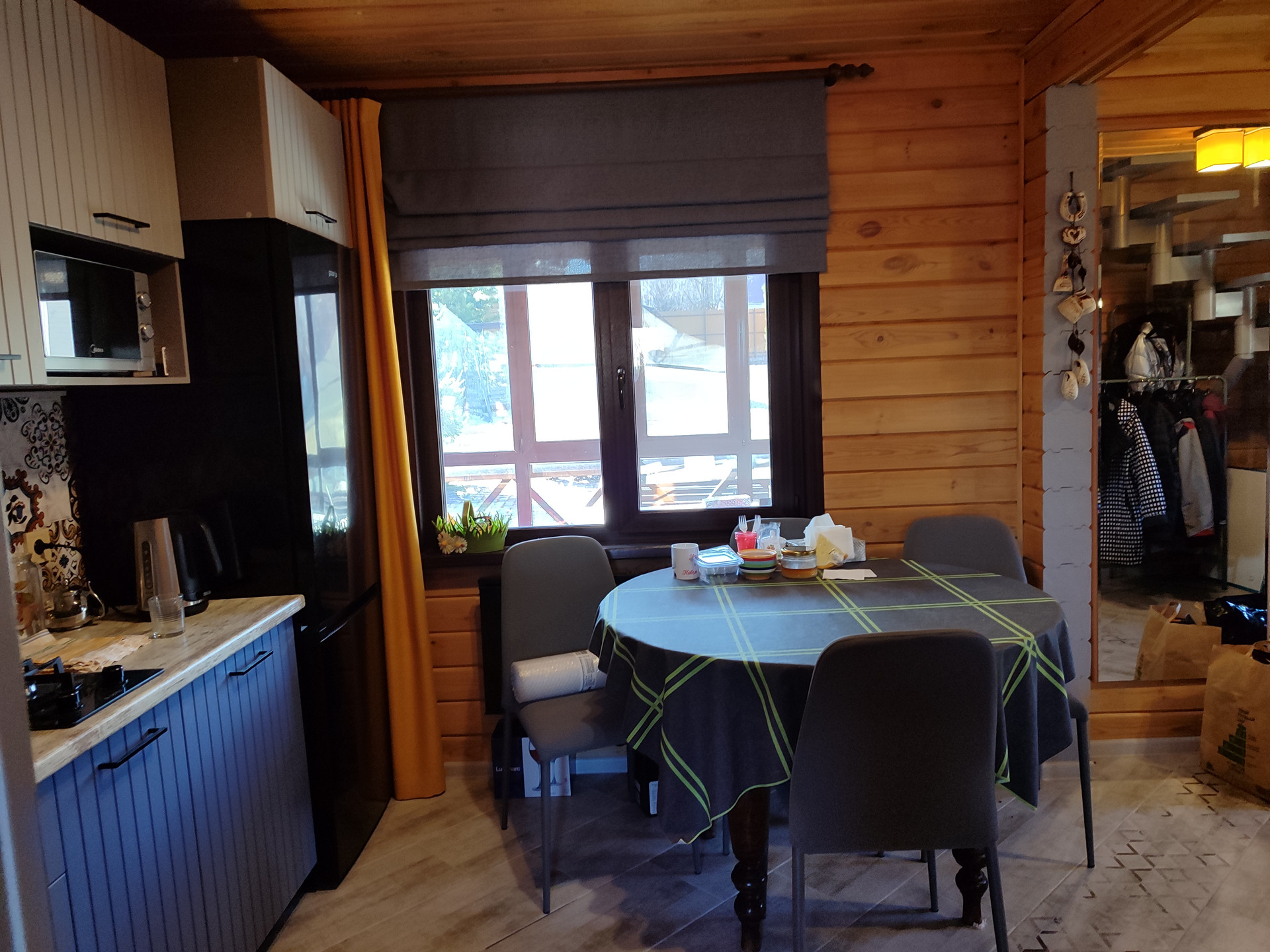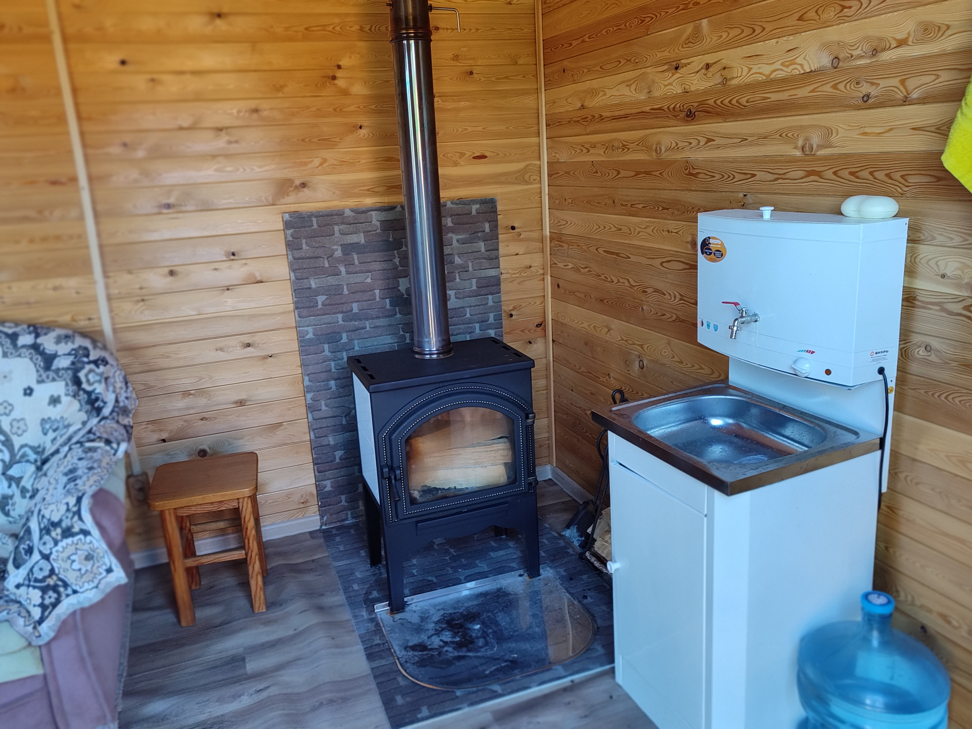 Установлена современная интерьерная дровяная печь, в мороз нагревает помещение за полчаса.