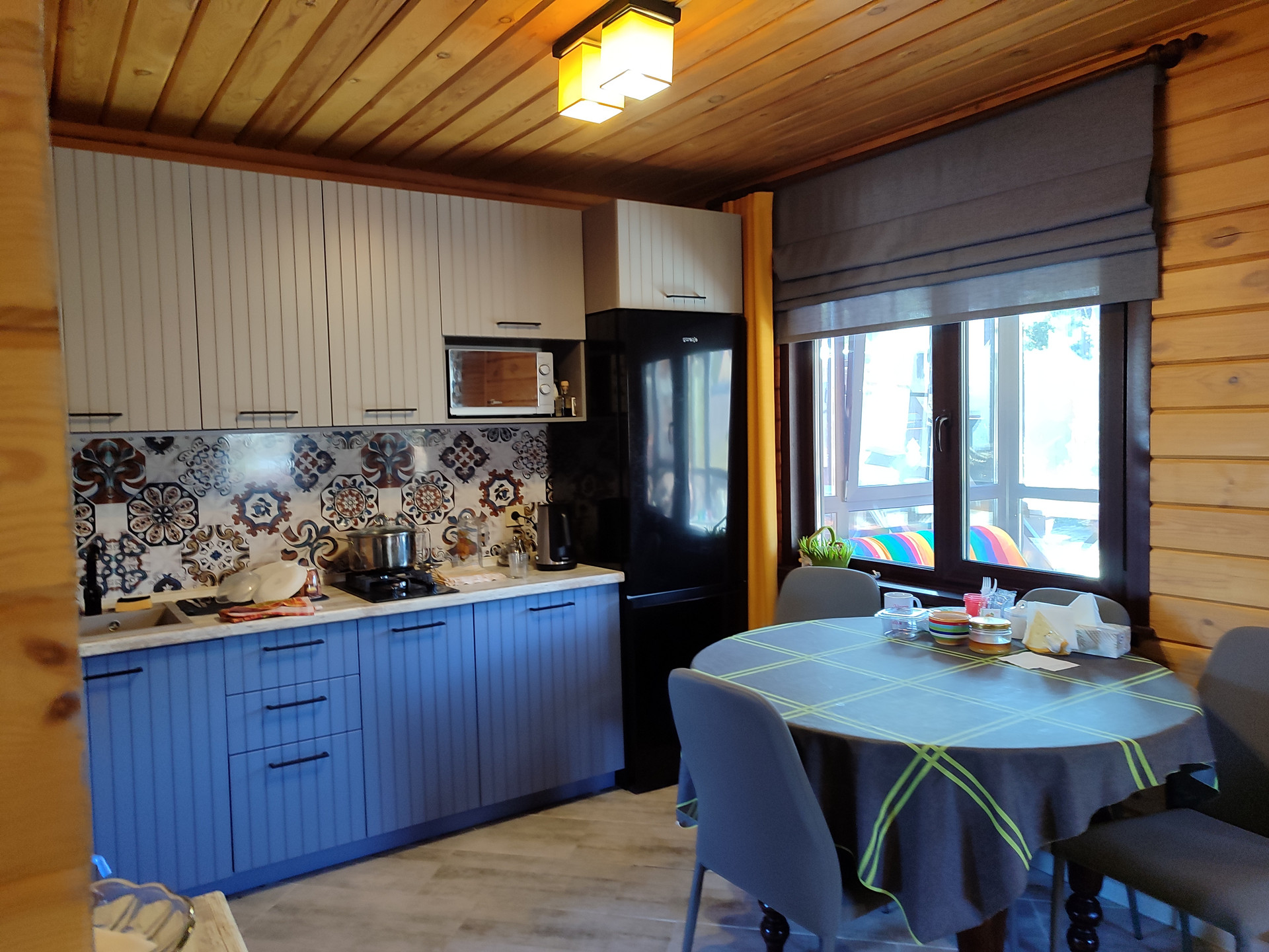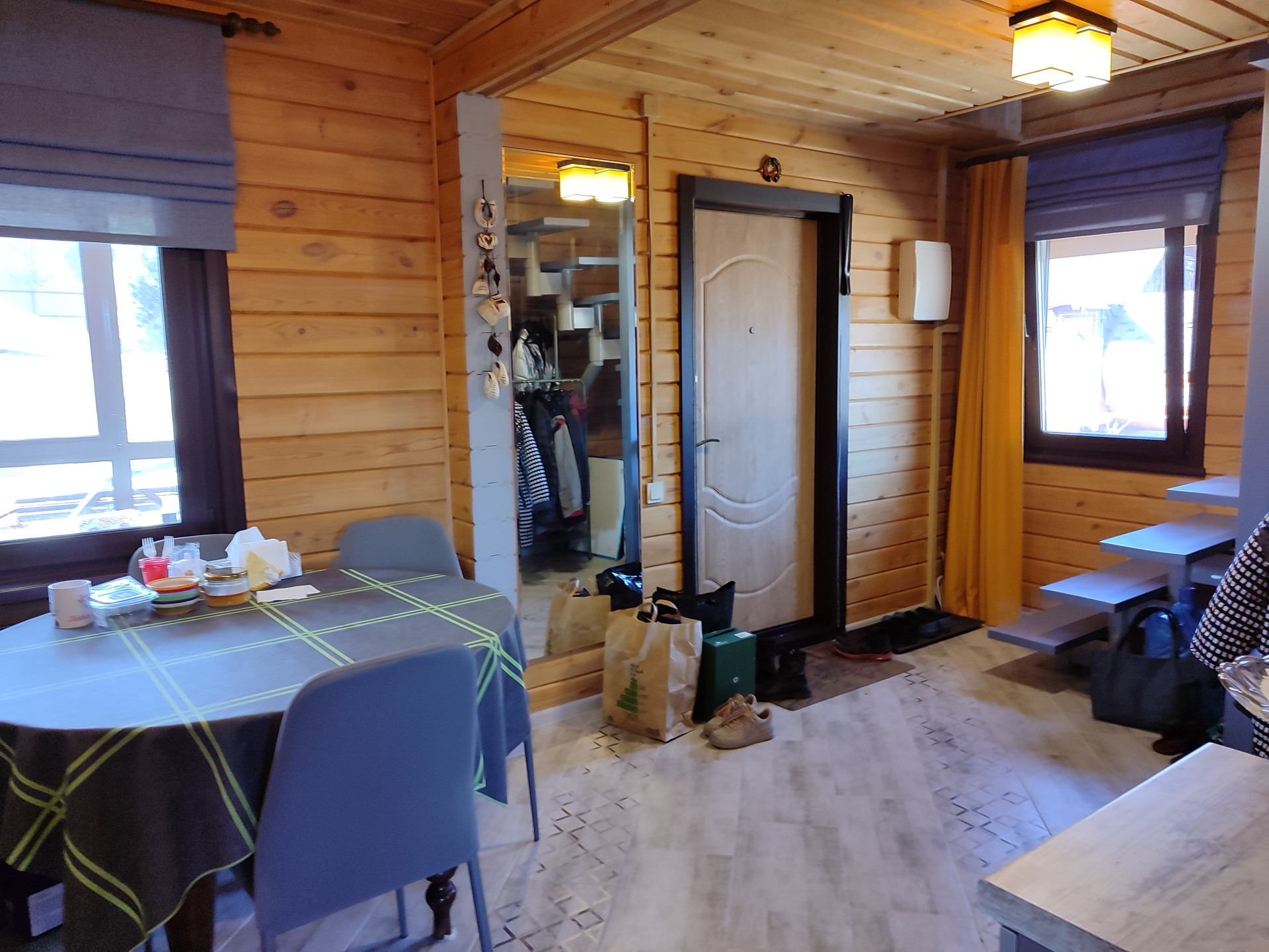 Дом обогревается электричеством - теплофоны по два на каждом этаже + теплый пол на кухне, в гостиной комнате и в санузле.