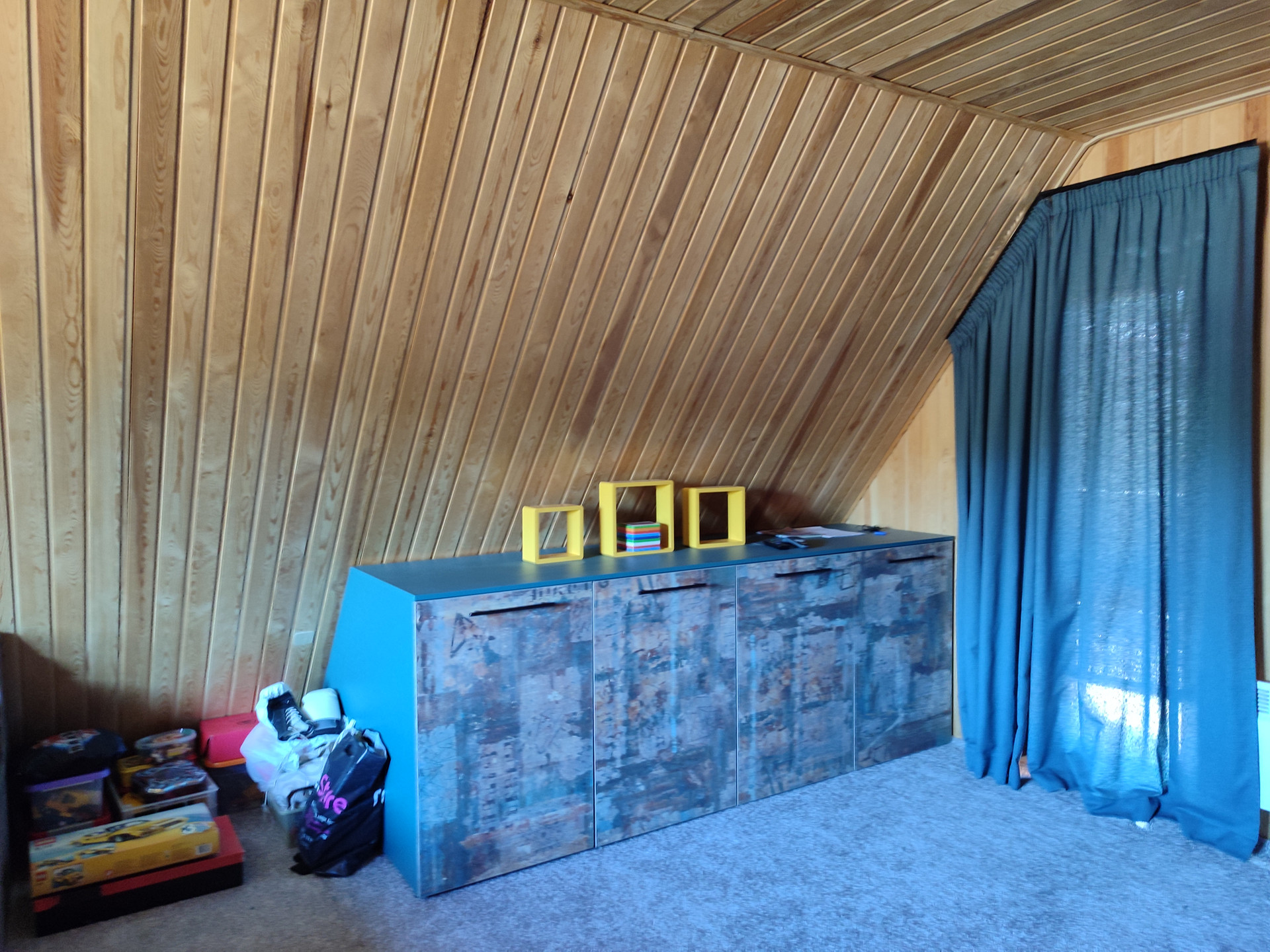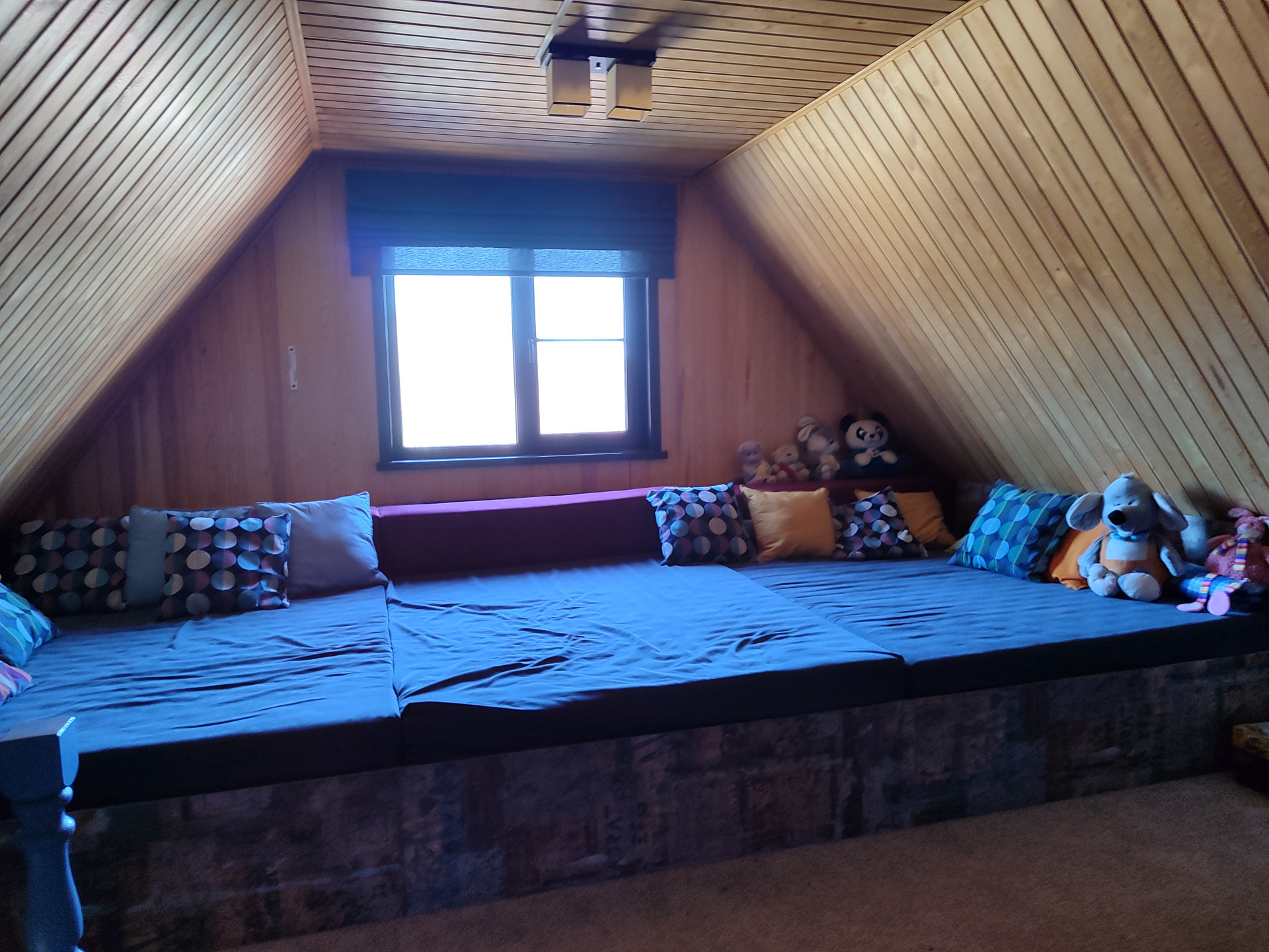 В комнате подиум, состоящий из трех двухспальных матрасов 180*220, каждый в индивидуальном чехле, в подиуме система хранения, много диванных подушек.