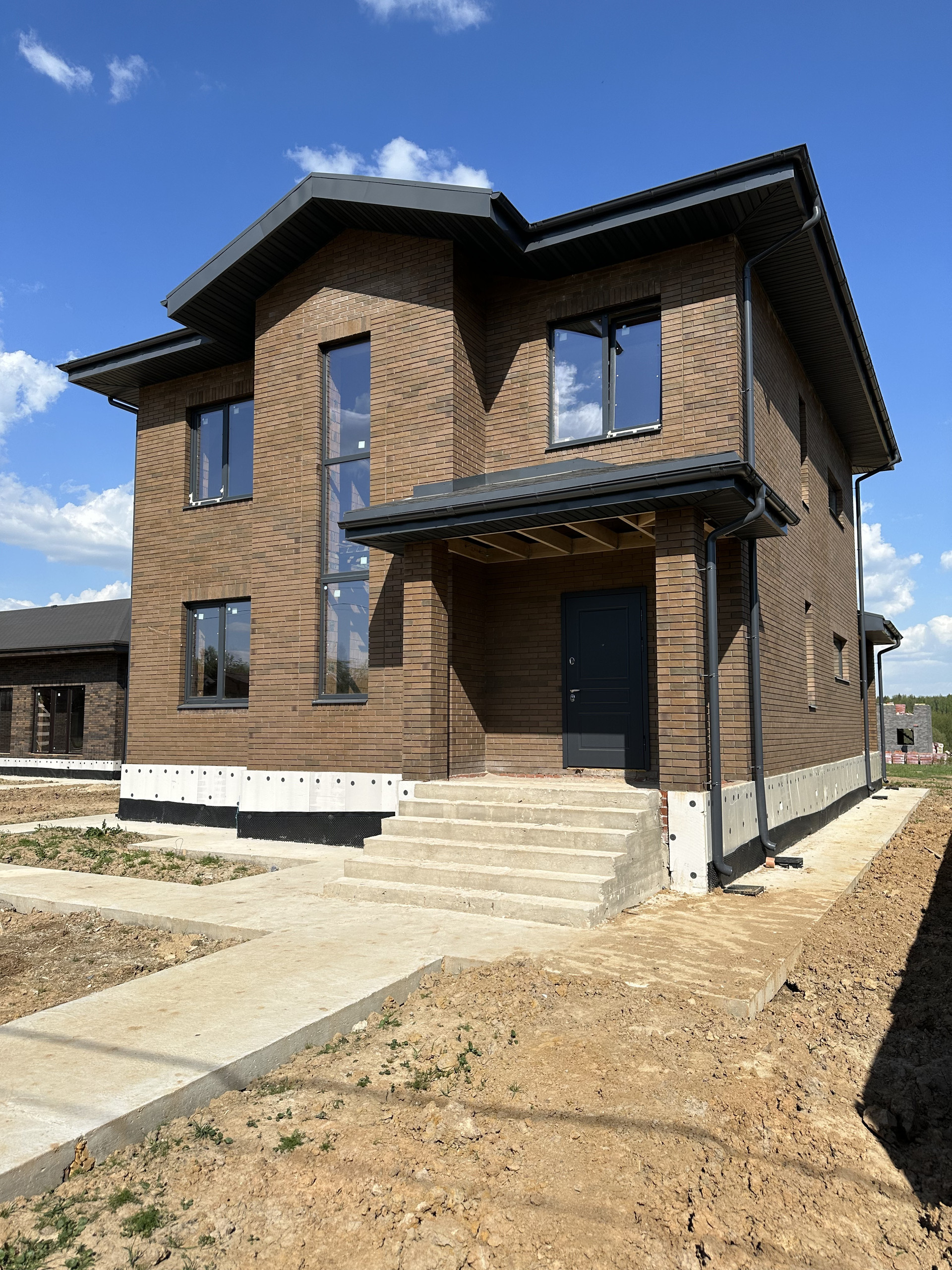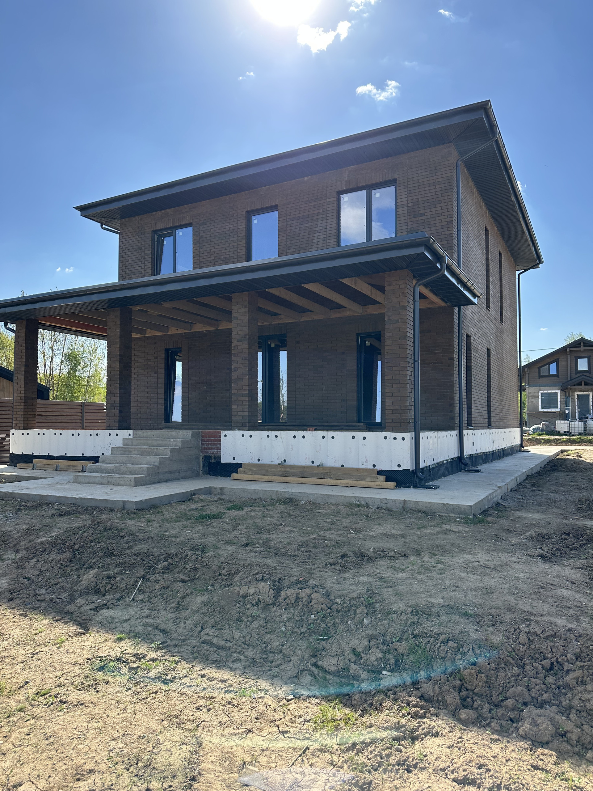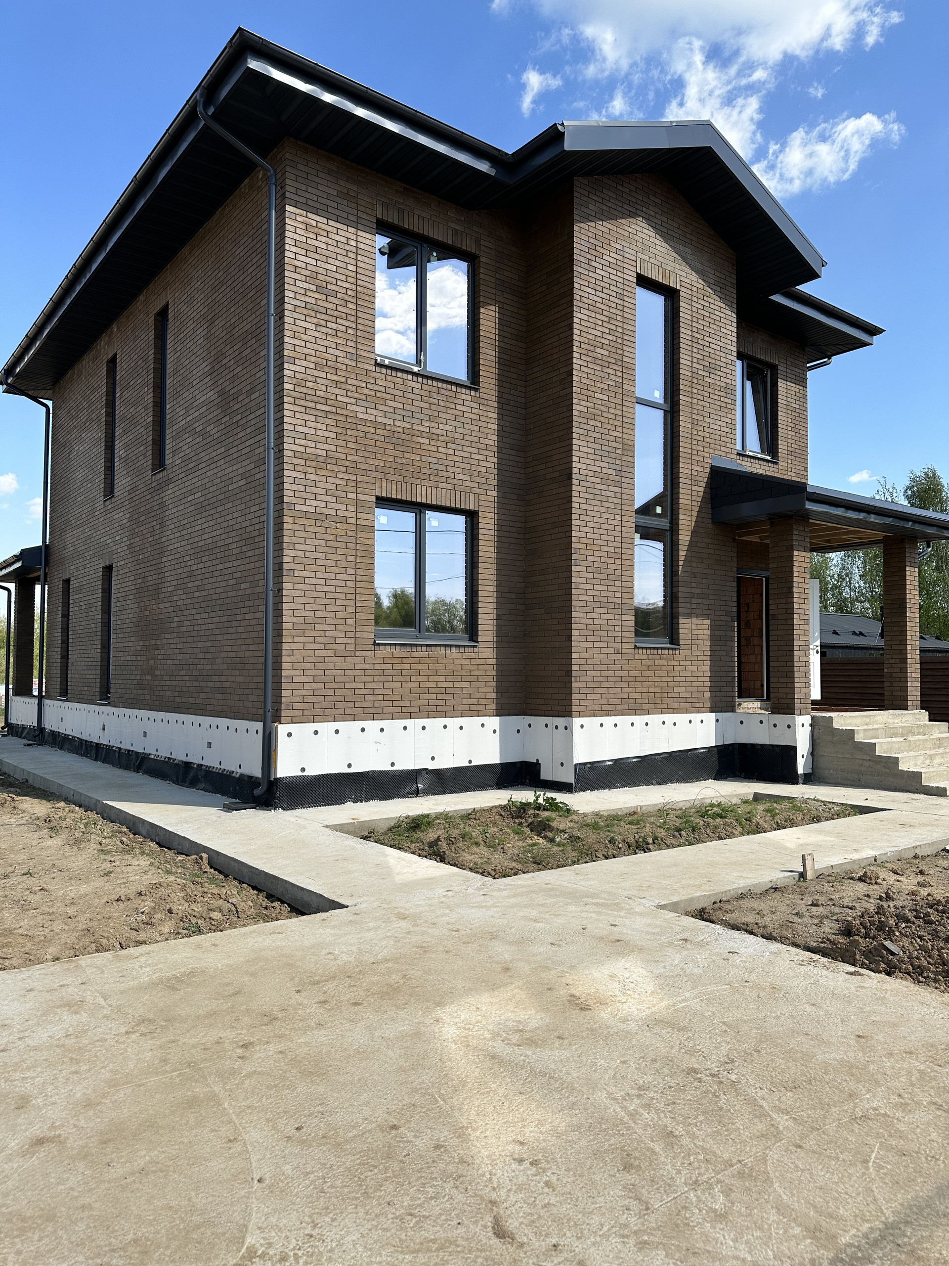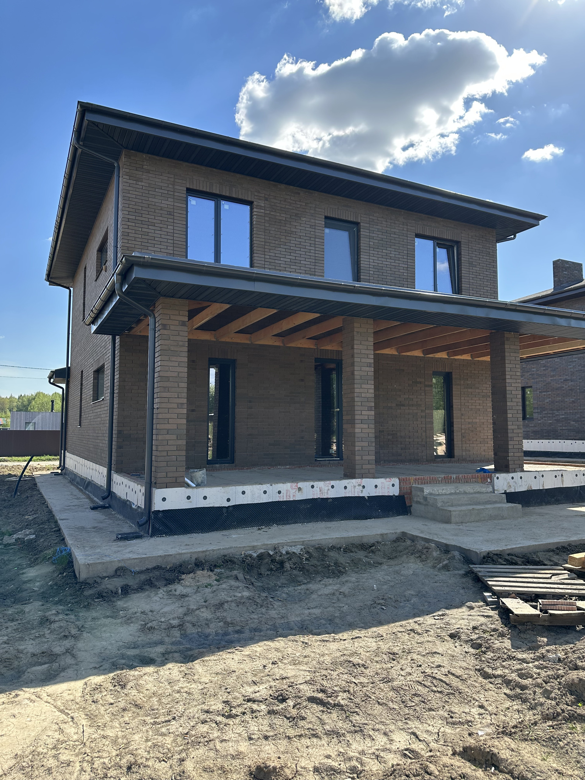 Дом состоит из керамических блоков Porotherm, межэтажные перекрытия монолитные, толщина стены до слоя черновой штукатурки 50 см. Фасадная отделка из дорогого керамического кирпича Braer, цвет шоколад. Высота потолков первого этажа 3,20 м до заливки. Окна с ламинацией 70 мм. Высота потолков 2 го этажа 3м (до заливки). Мягкая кровельная черепица docke premium. По периметру дома установлена система водоотлива, выполнен дренаж по участку.