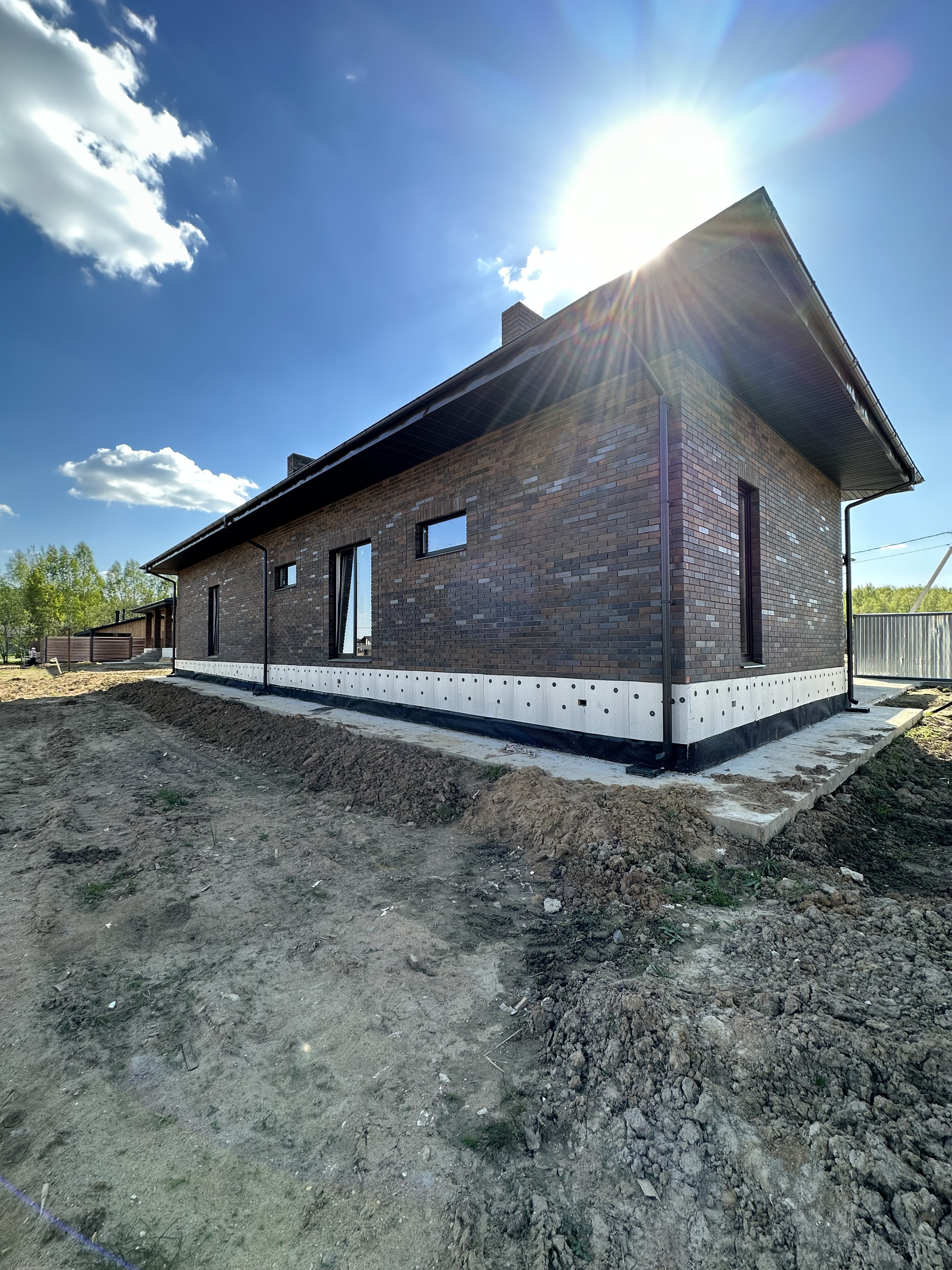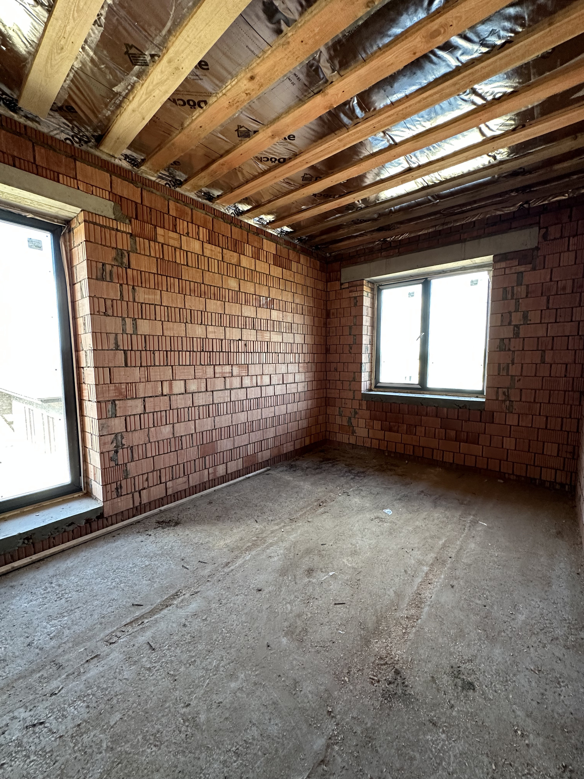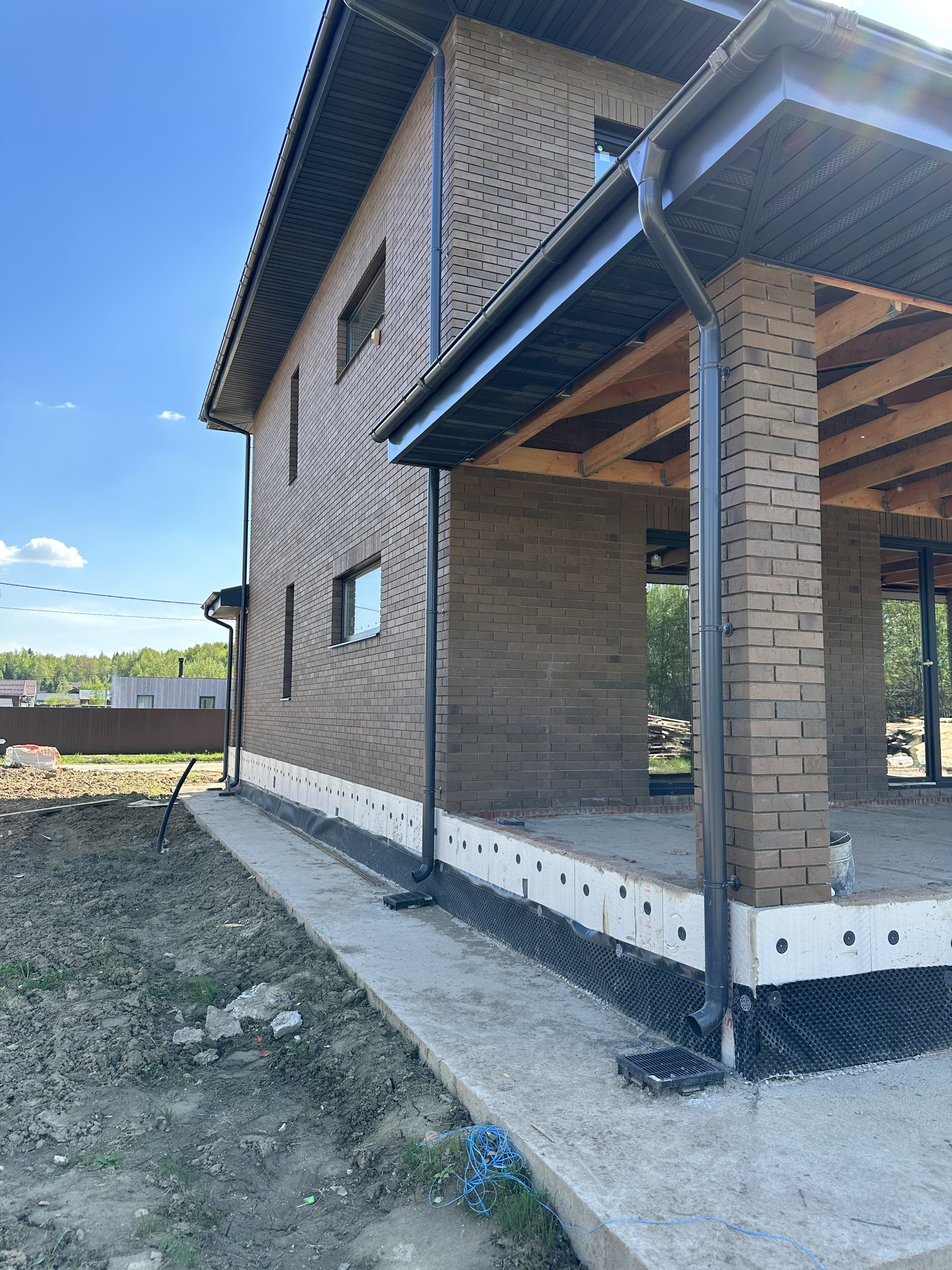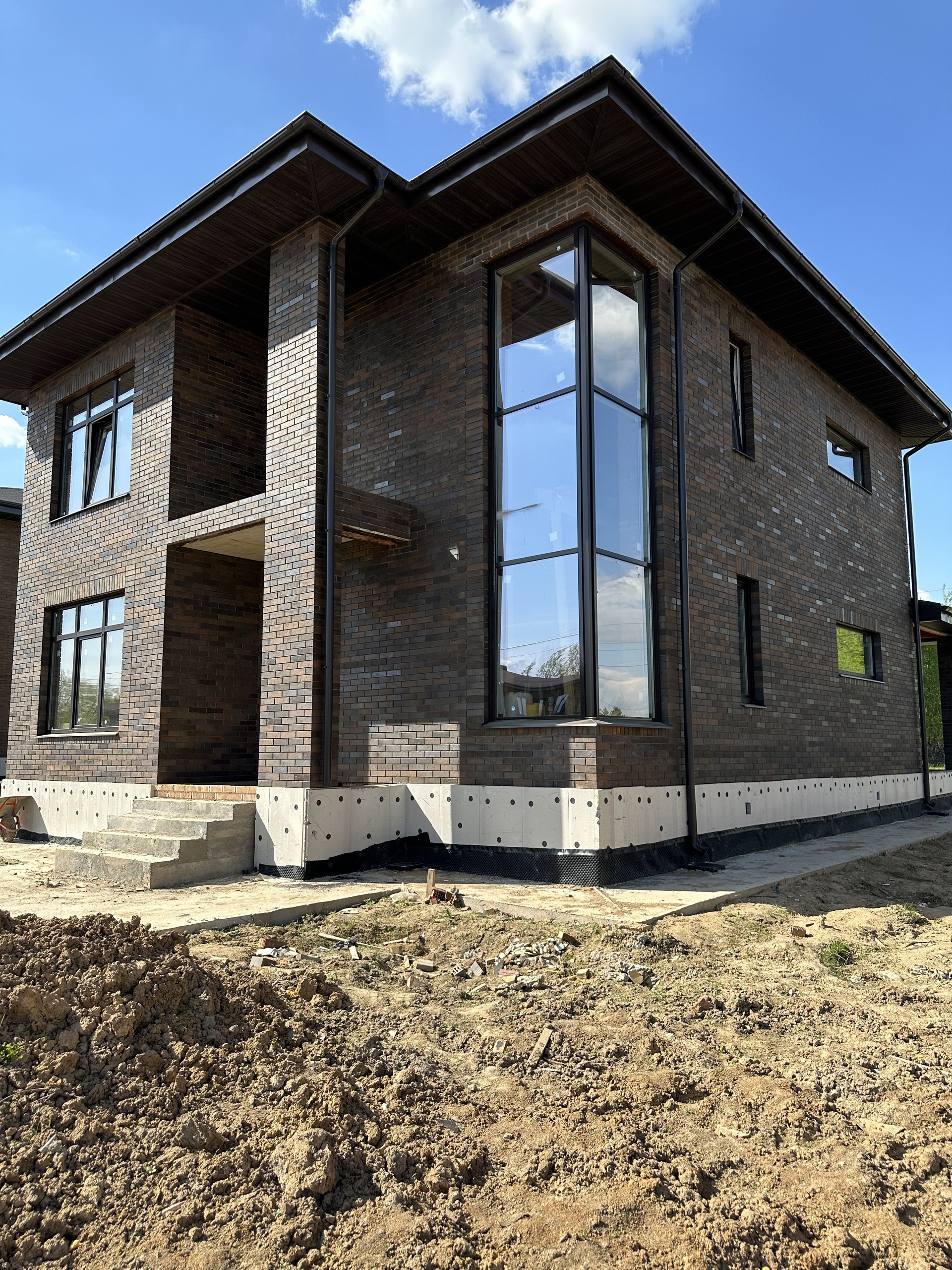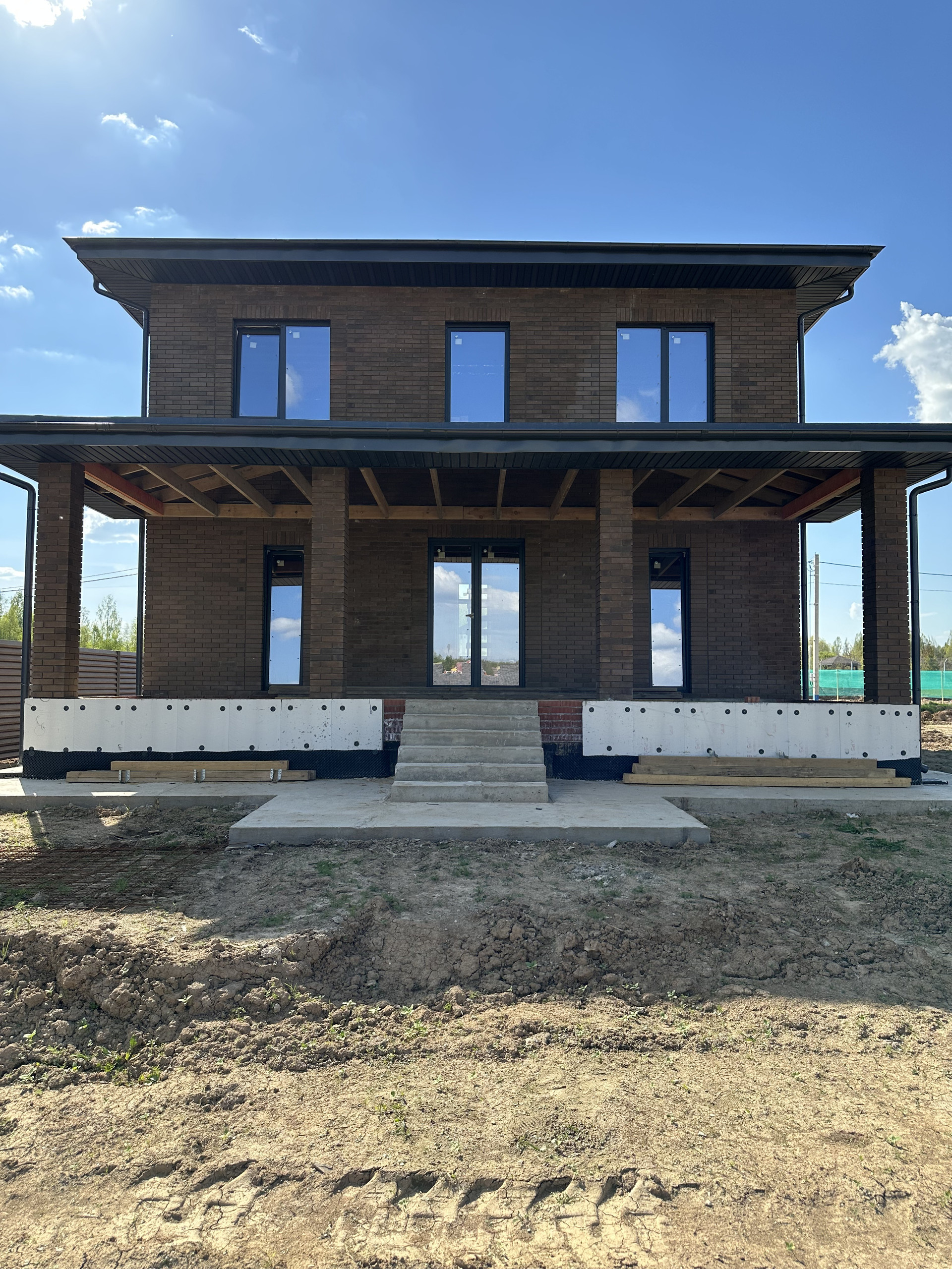 Дом состоит из керамических блоков Porotherm, межэтажные перекрытия монолитные, толщина стены до слоя черновой штукатурки 50 см. Фасадная отделка из дорогого керамического кирпича Braer, цвет шоколад. Высота потолков первого этажа 3,20 м до заливки. Окна с ламинацией 70 мм. Высота потолков 2 го этажа 3м (до заливки). Мягкая кровельная черепица docke premium. По периметру дома установлена система водоотлива, выполнен дренаж по участку.