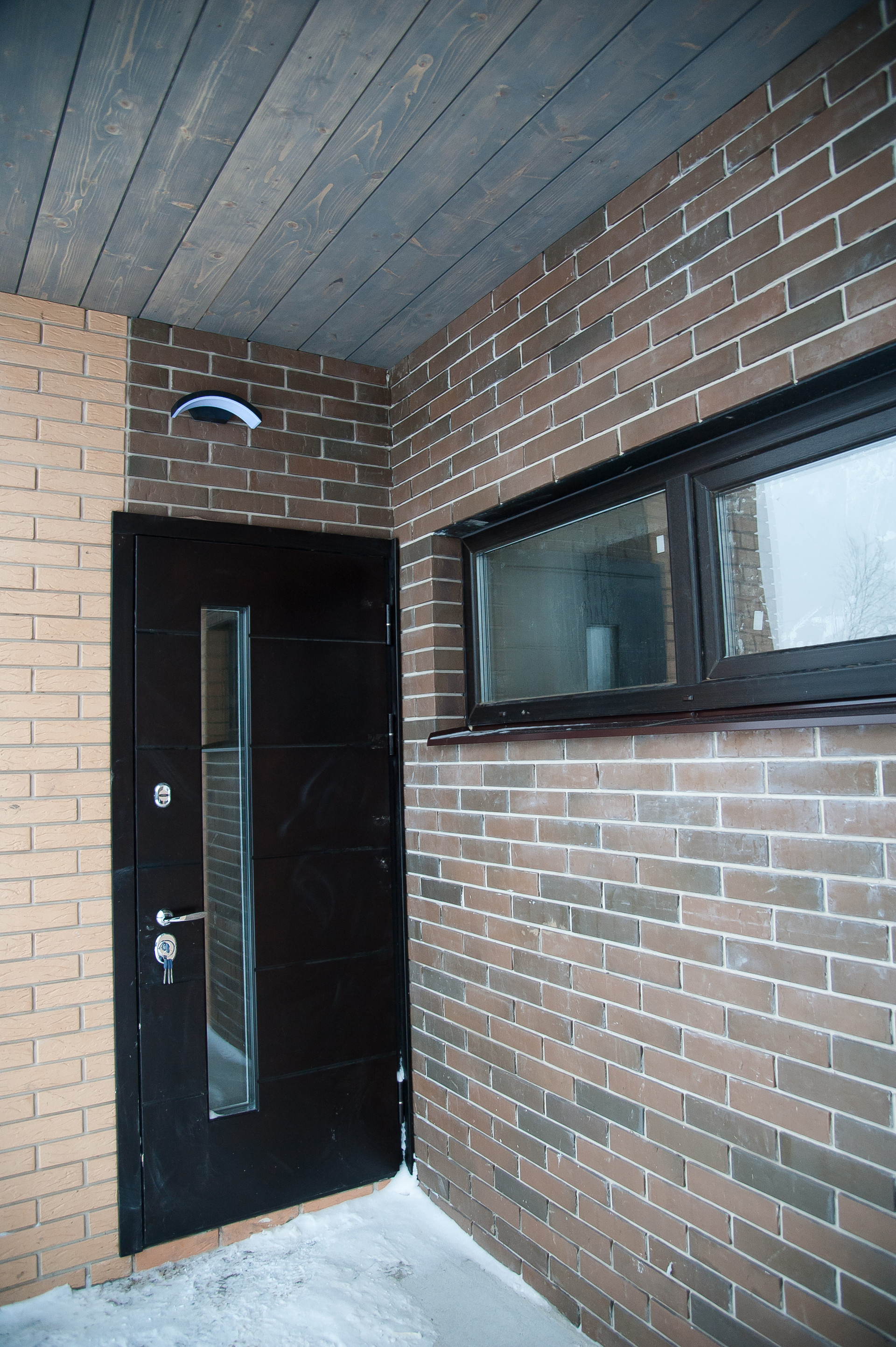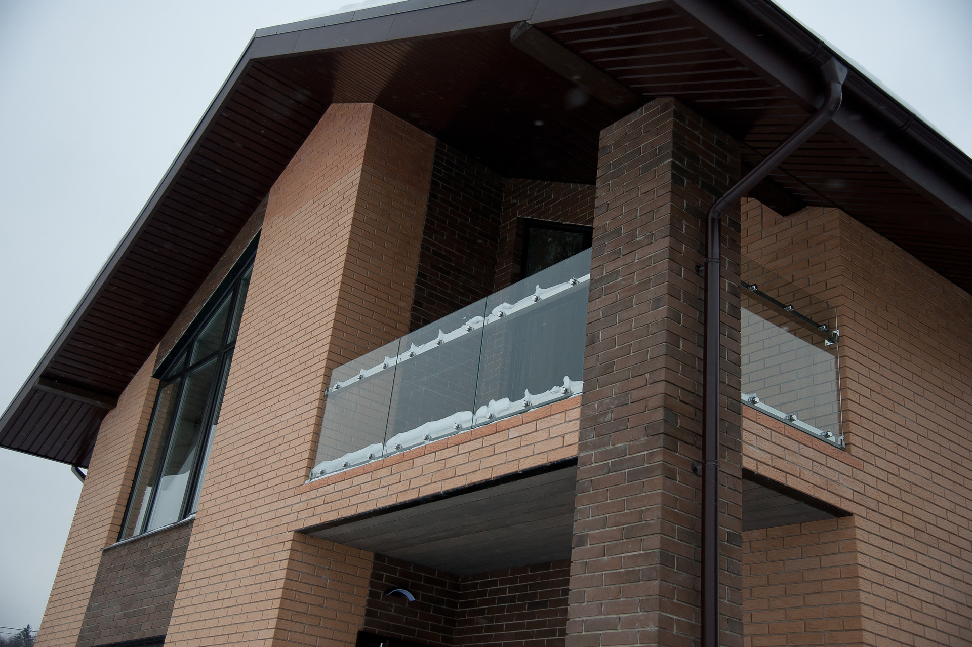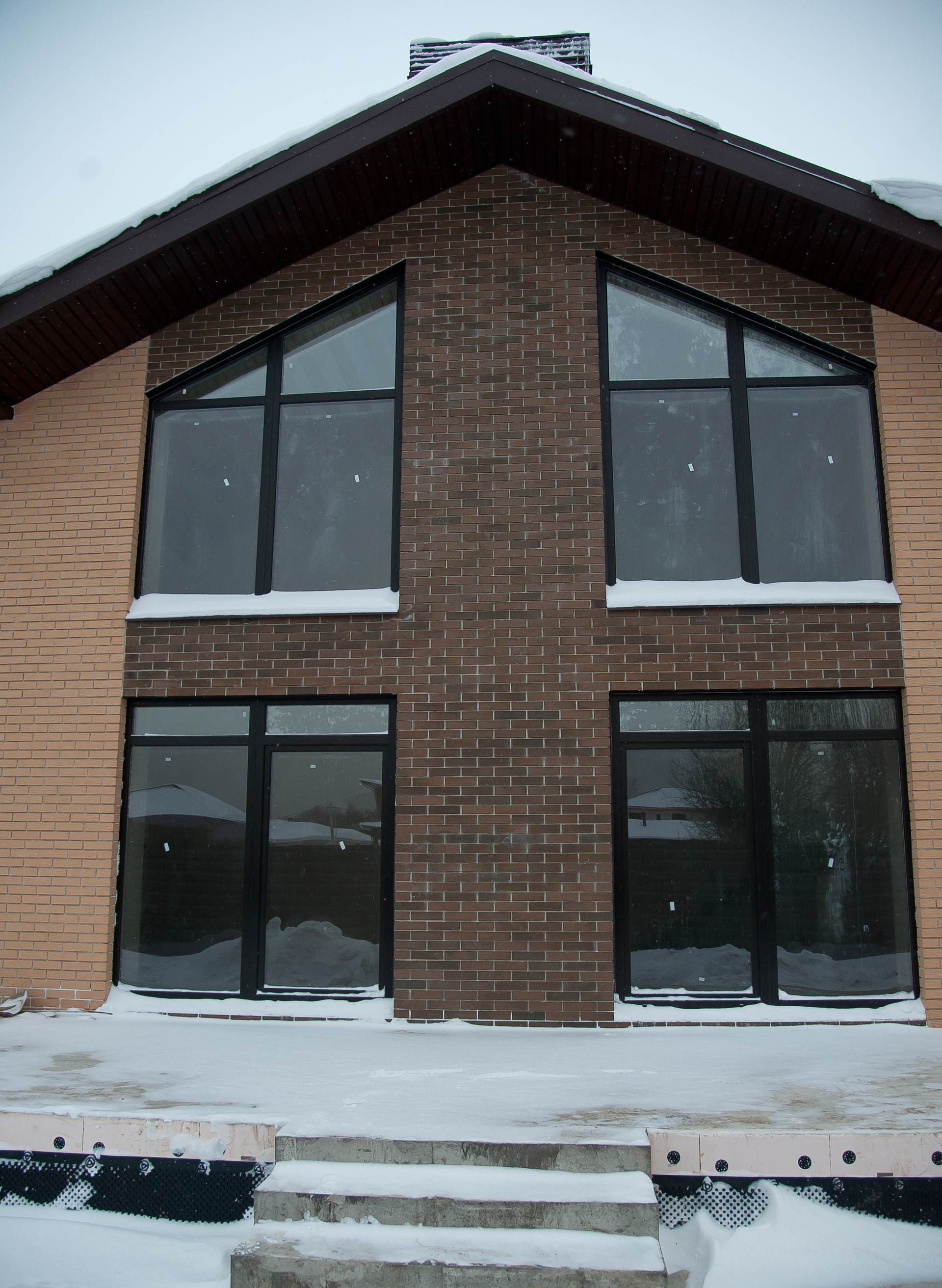 Кровля: мягкая черепица с утеплителем 200 мм. Фасад: облицовочный керамический кирпич, баварская кладка.