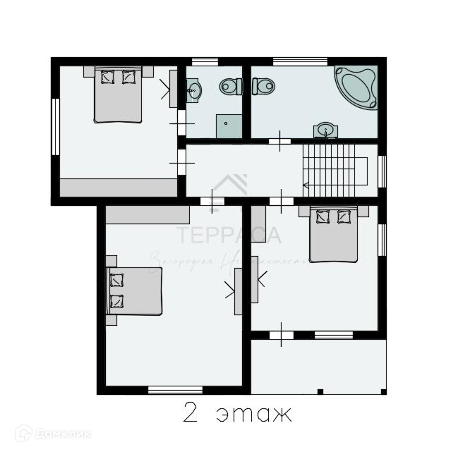 2 этаж - холл,  2 изолированные комнаты (одна из которых с выходом на балкон), мастер-спальная с с/у, с/у.