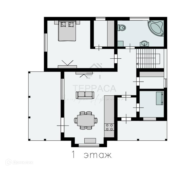 1 этаж - терраса, прихожая, холл, 2 гардеробной комнаты, кухня-гостиная, изолированная комната,  с/у, техническое помещение.