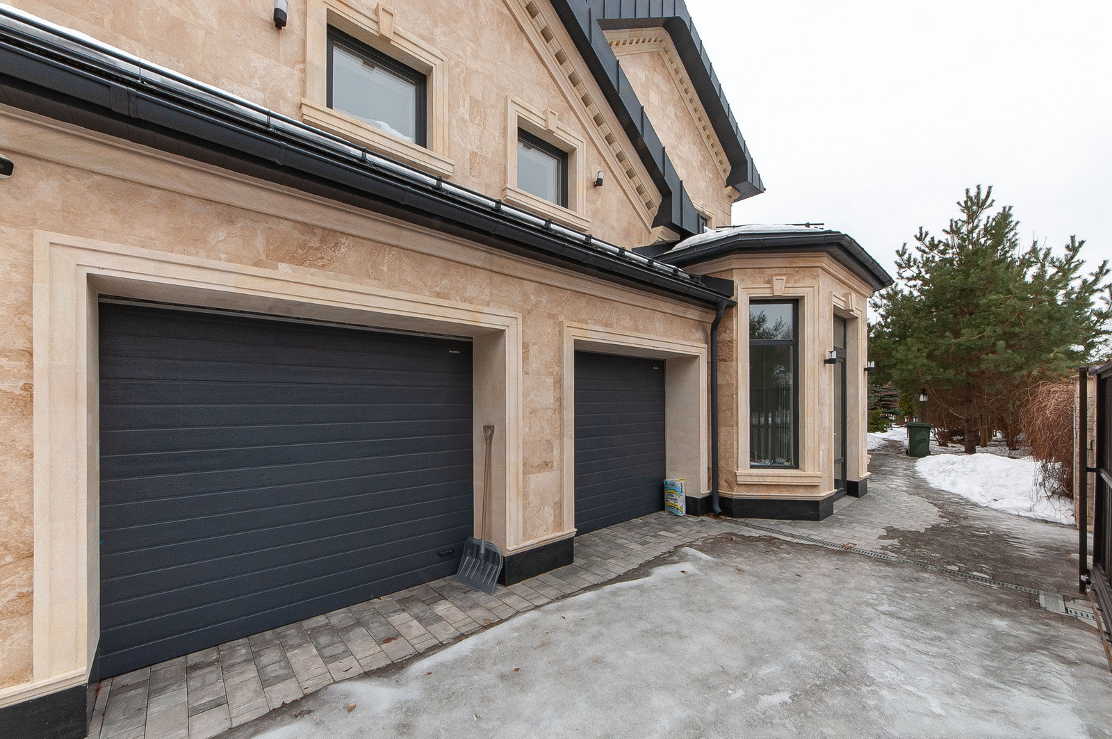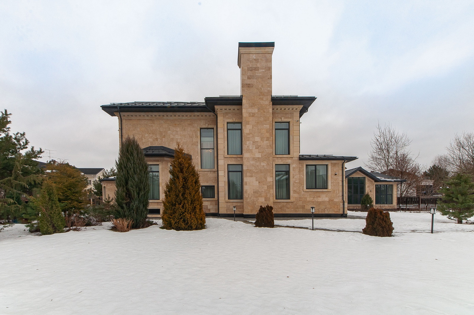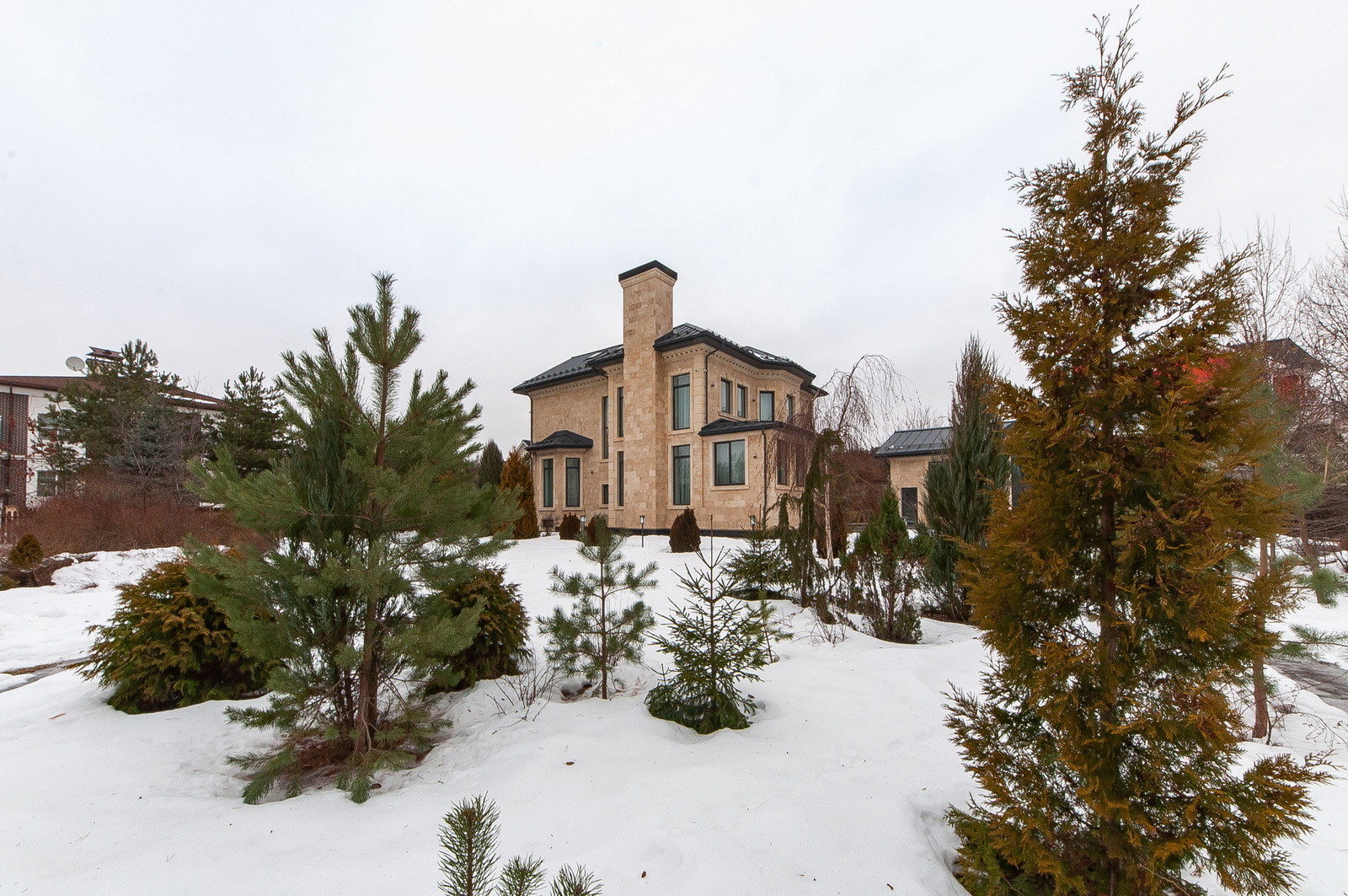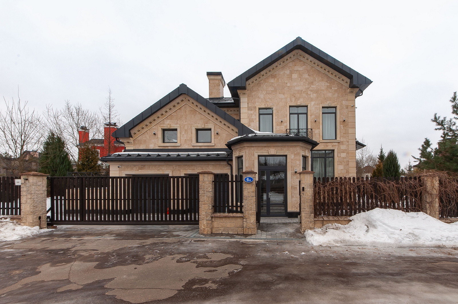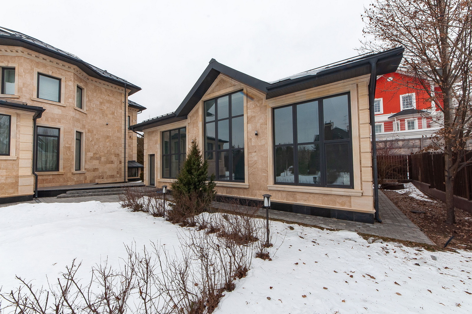 На участке проведены ландшафтные работы, вымощены дорожки, установлено освещение, высажены кустарники и крупномеры, установлен фонтан - водопад.