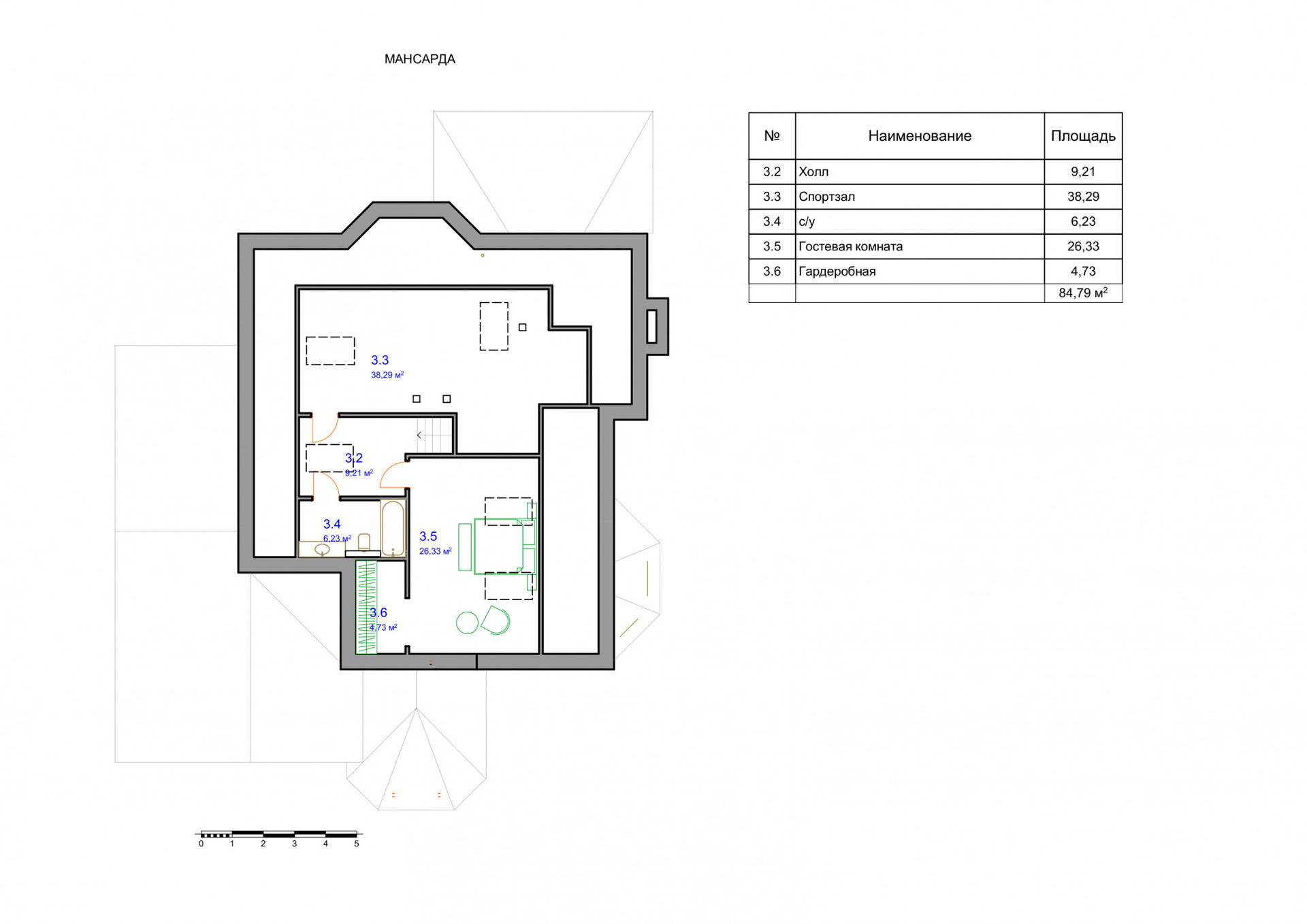 Мансарда: холл, с/у, спальня, комната, кладовые.