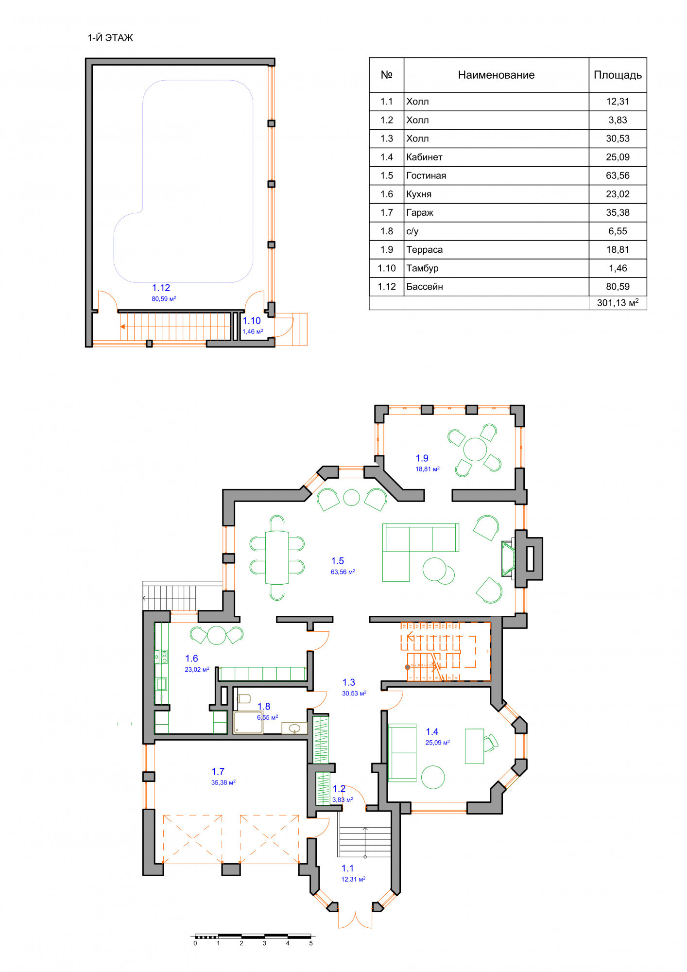 1 этаж: прихожая, гардеробная, холл, кабинет, гостиная с действующим камином - столовая с выходом на террасу, кухня с обеденной зоной, гараж на 2 м/м, гостевая спальня, с/у;