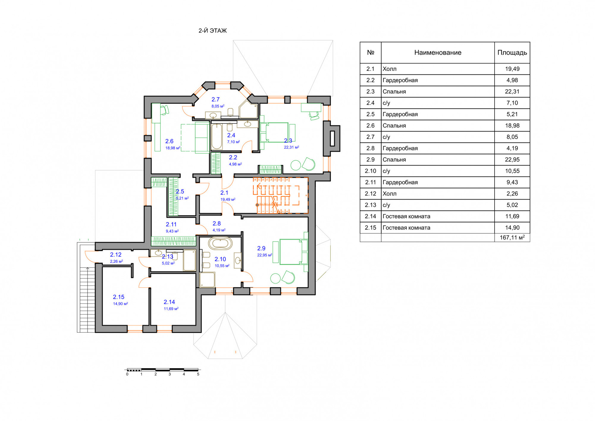 2 этаж: холл, 3 спальни с с/у и гардеробными;