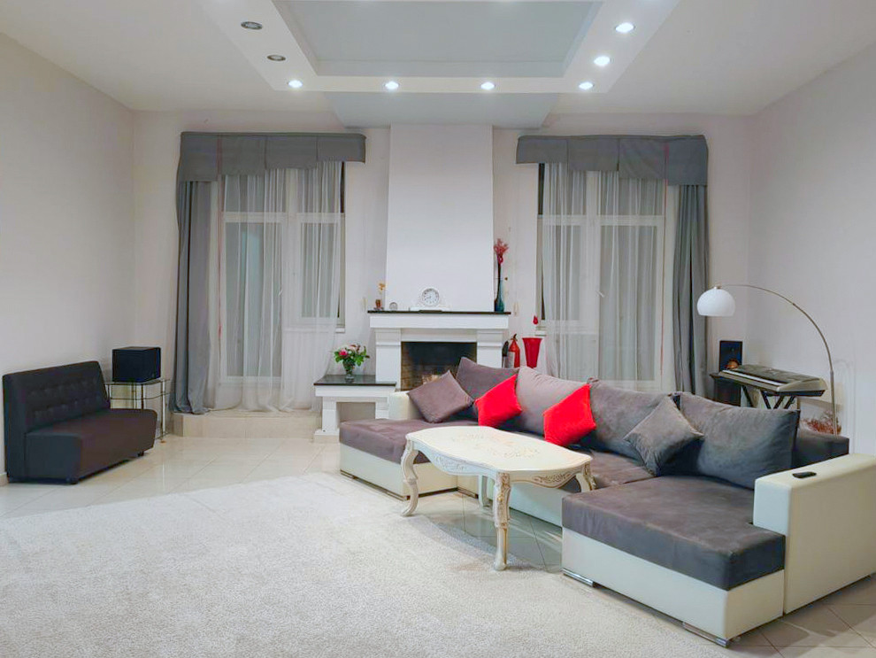 - На первом этаже организованы: просторное гостиное пространство с камином; семейный кинотеатр, оснащенный по последнему слову техники; кухонная и столовые зоны, парадная входная группа с гардеробной, выход в зону патио, с/уз.