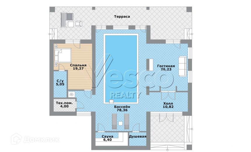 Спа-комплекс: бассейн (78) с зоной отдыха, гостиная (26) с выходом на террасу, сауна (6), душевая, гостевая спальня (19) с с/у (5) и выходом на террасу, техническое помещение (4), холл (11).