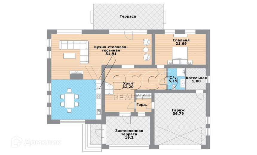 1 этаж: просторная кухня со столовой зоной (30), гостиная (52) с выходом на открытую террасу, гостевая спальня (22), гостевой с/у (5), гардеробная (4), гараж на 2 м/м (37), котельная (6), застекленная терраса (19), холл (32).