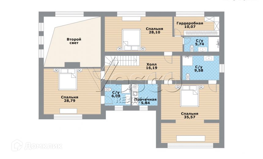 2 этаж: мастер-спальня (28) с гардеробной (10) и с/у (6), детская №1 (36) с лоджией и с/у (10), детская №2 (29) с с/у (6), прачечная (6), холл (16).