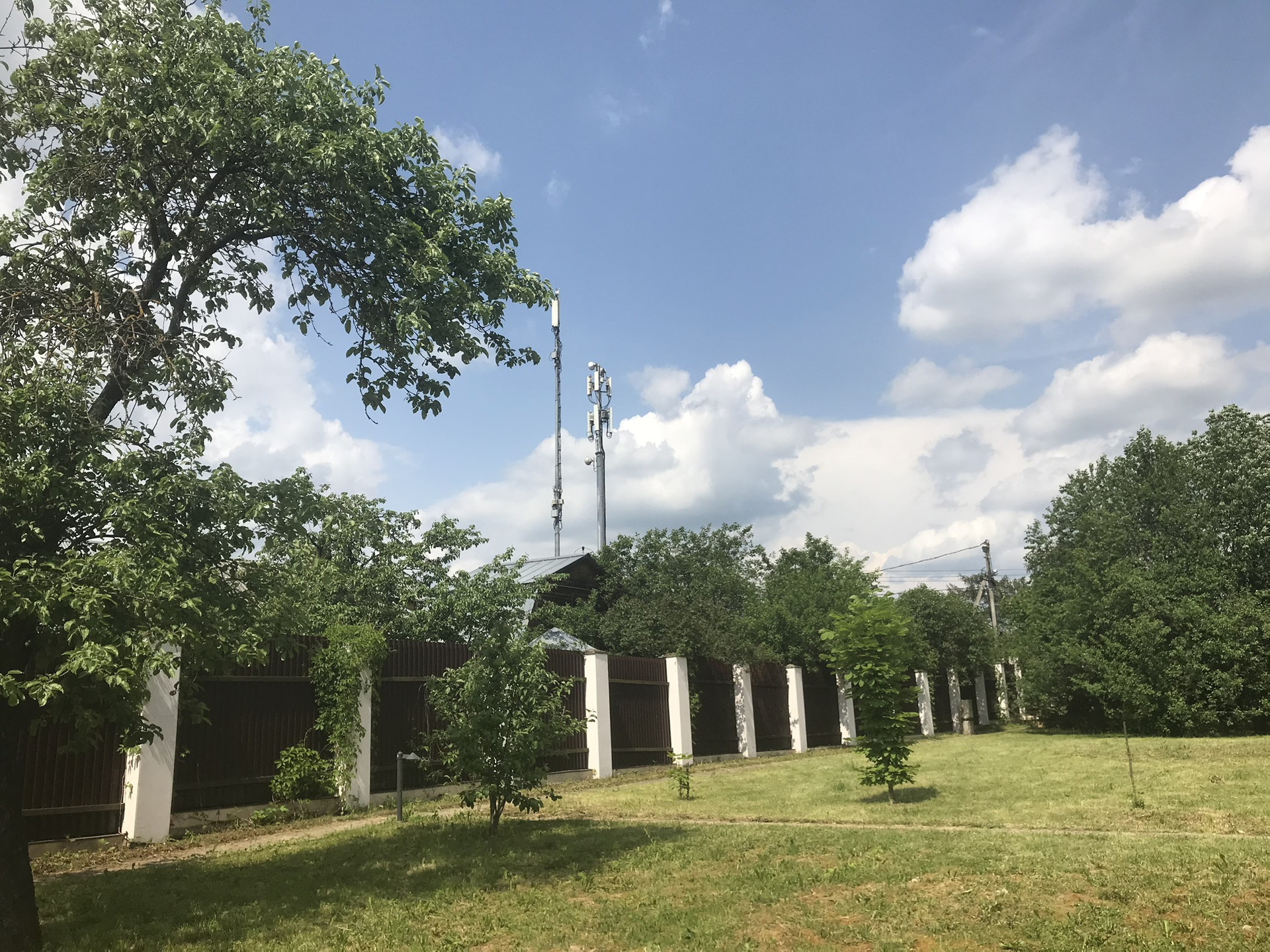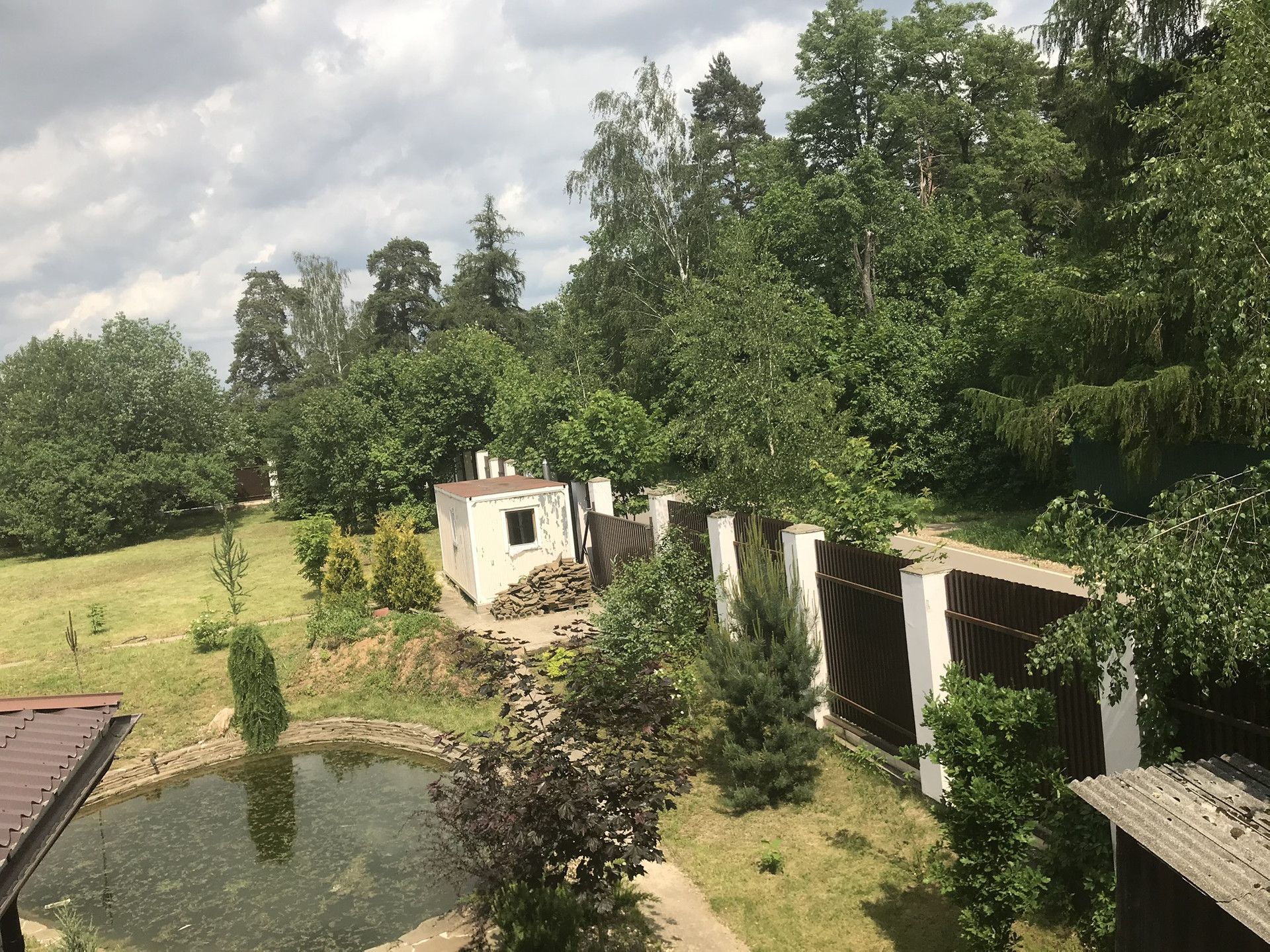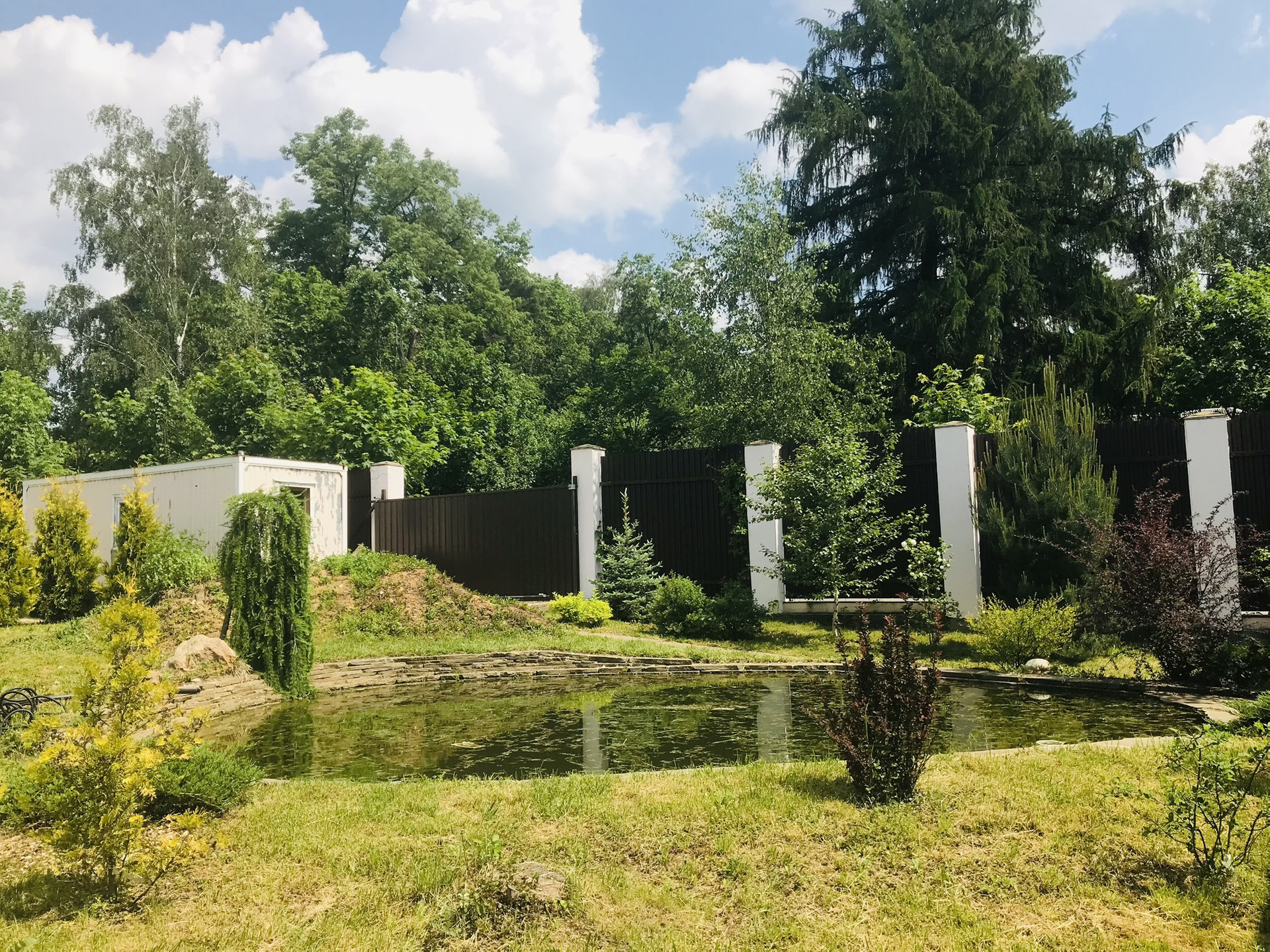 Участок с газоном и многолетними садовыми деревьями огорожен забором с колоннами. Бытовка.