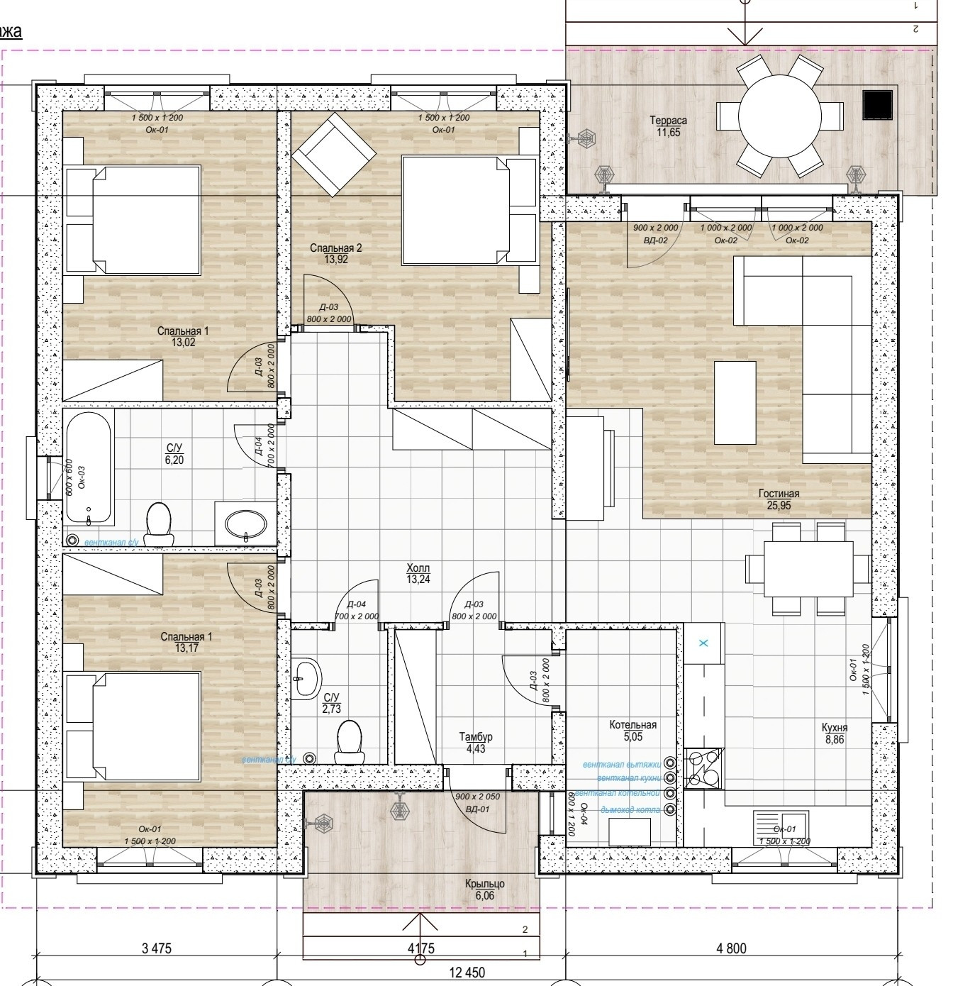 3 спальни, большая гостиная, 2 сан. узла с душевыми, котельная, тамбур, коридор.